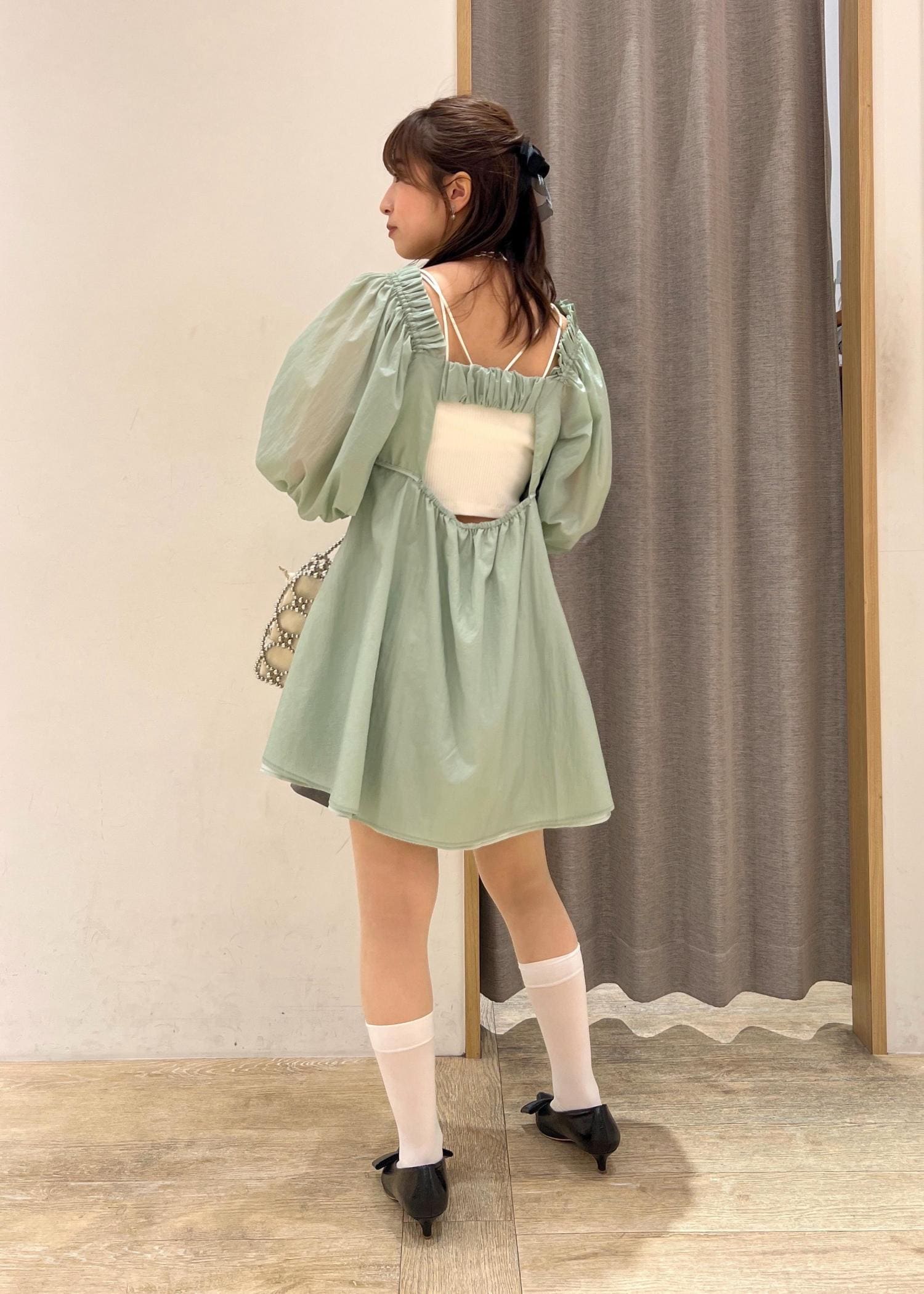 二の腕とお尻が隠れますが、胸下の切り替えで目線が上がりスタイルアップもバッチリ! -