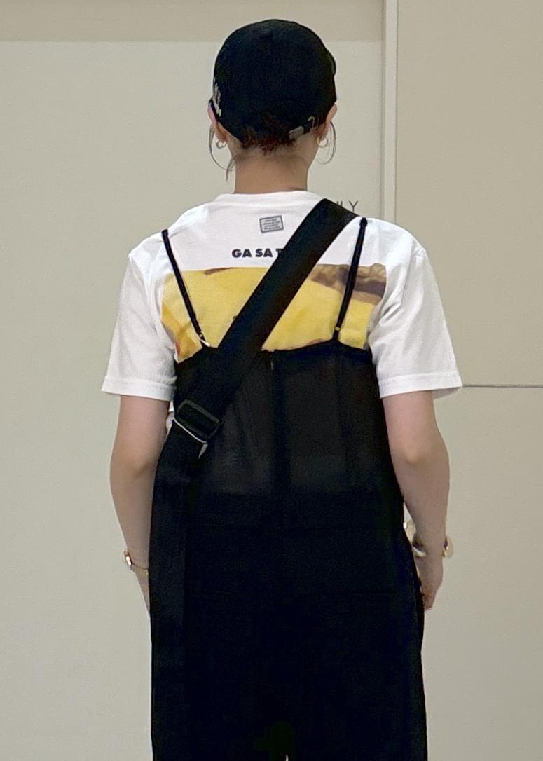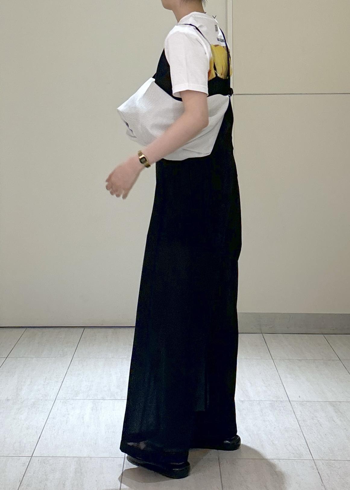 今回は背面のバナナプリントがおちゃめな TANGTANG Tシャツと程よい光沢感で大容量・機能性抜群なメッシュショルダーバッグを合わせました!