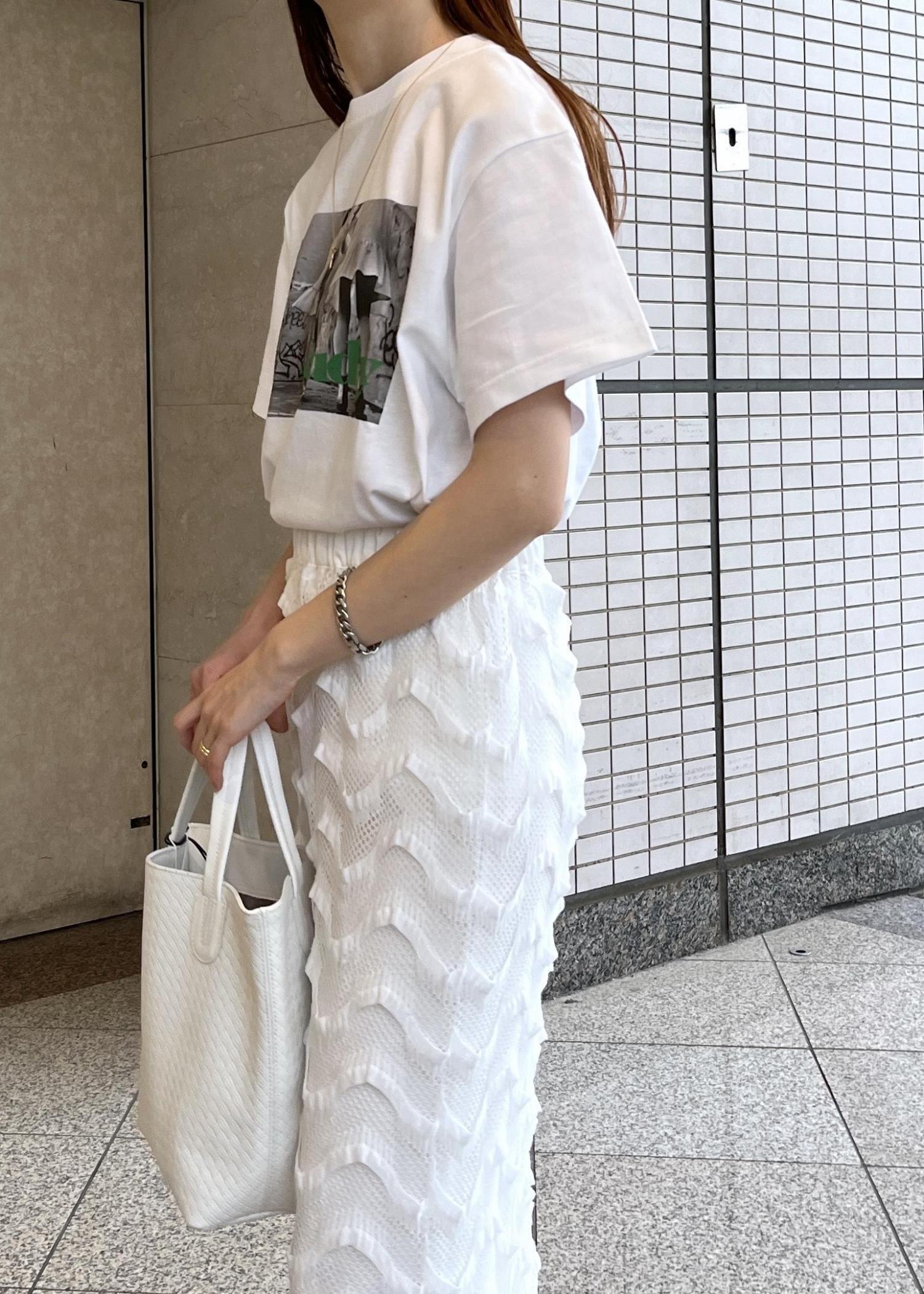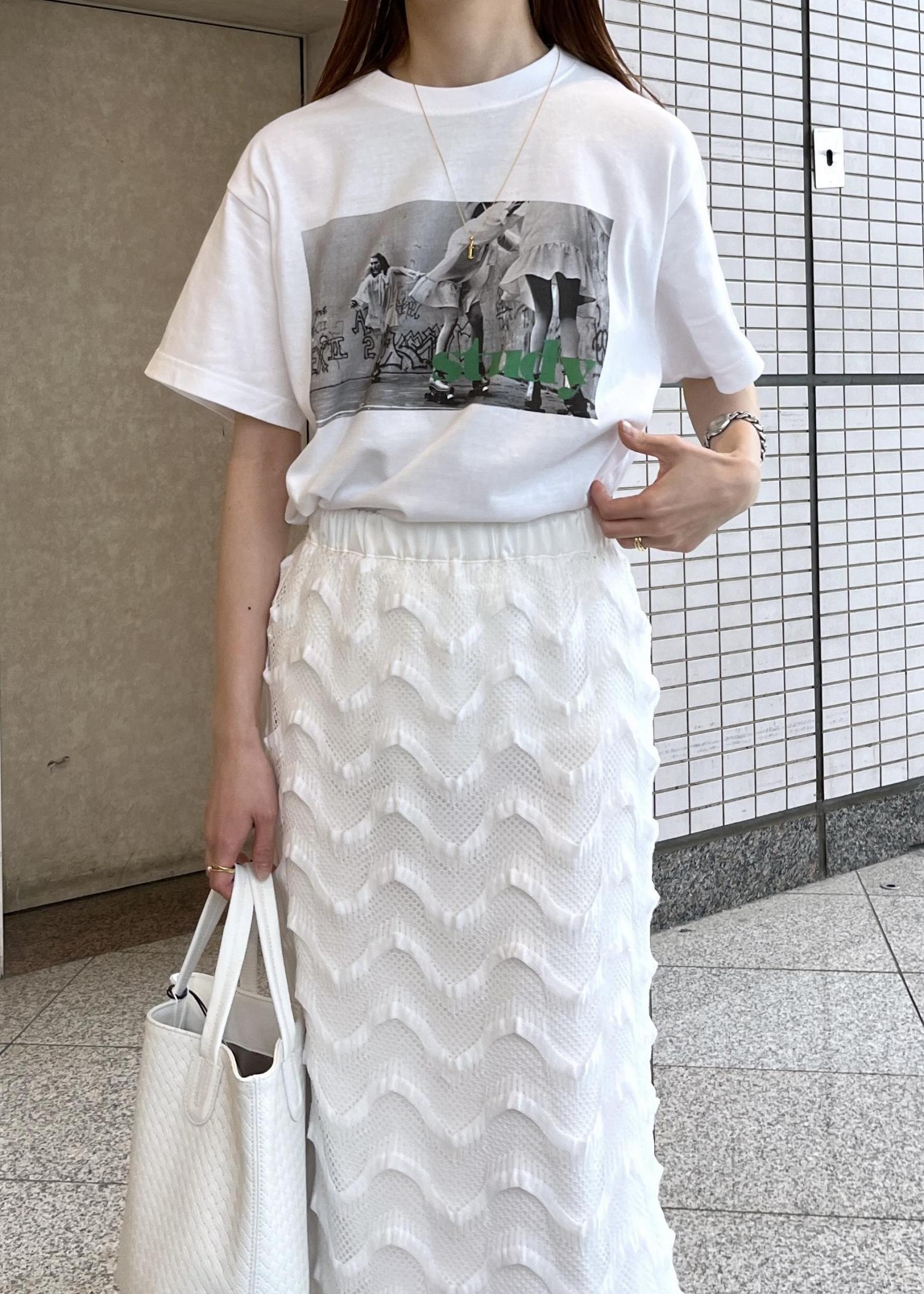 STUDYのTシャツをメインに白のワンカラーでまとめました。スカートも透け感があり涼しげな印象に。