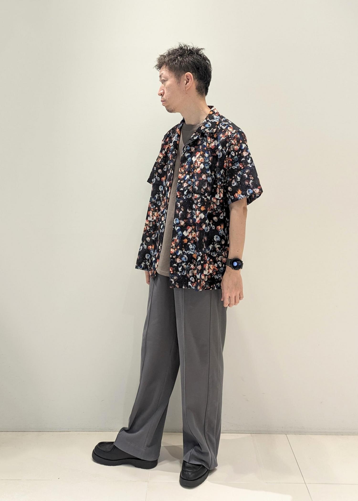 普段の着こなしに上品なアクセントを加える総柄オープンカラーシャツ。シワになりにくいコットンライクなポリエステルタフタ素材で、フランス企画のデザインが魅力!