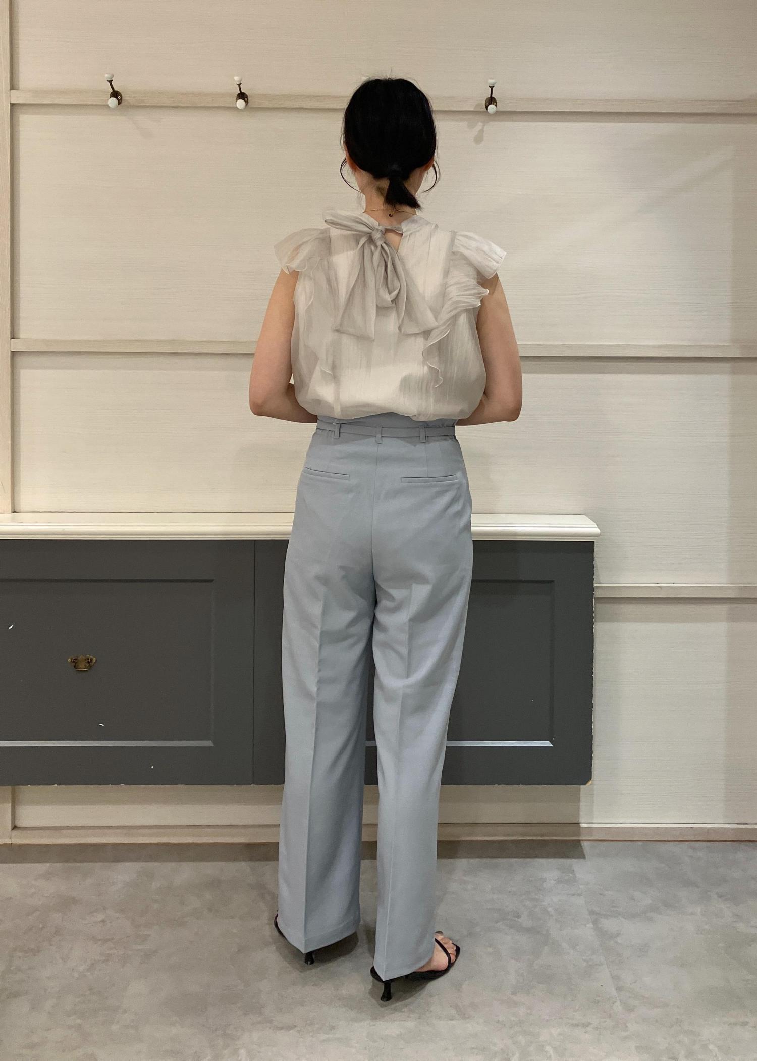 レディなフリルブラウスは清涼感あるブルーのタックパンツを選ぶと夏らしくさっぱりしたコーデになります♡
