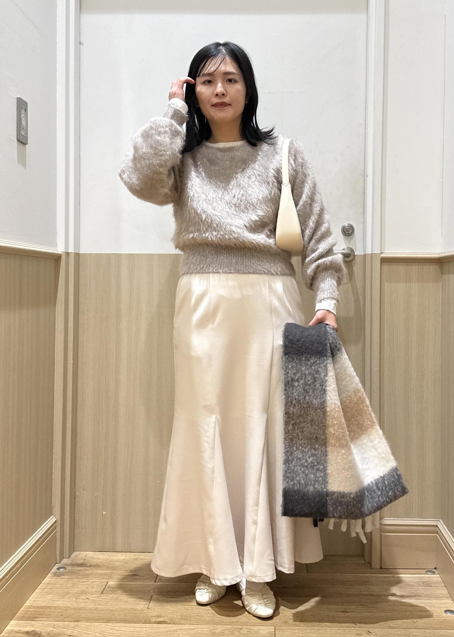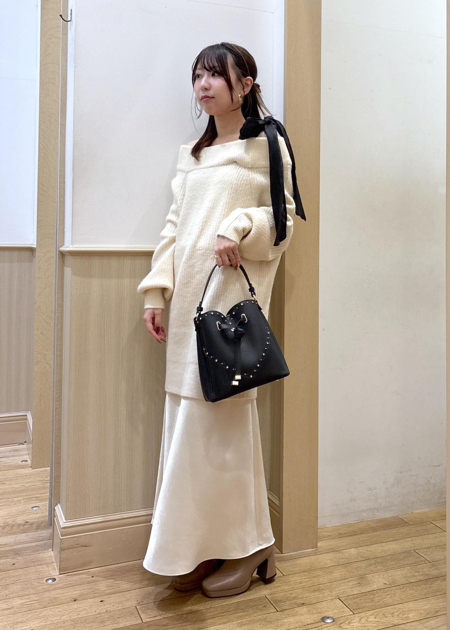 bagをメタリックなシルバーのミニbagにする事で、シャープなイメージをプラスしてみました。