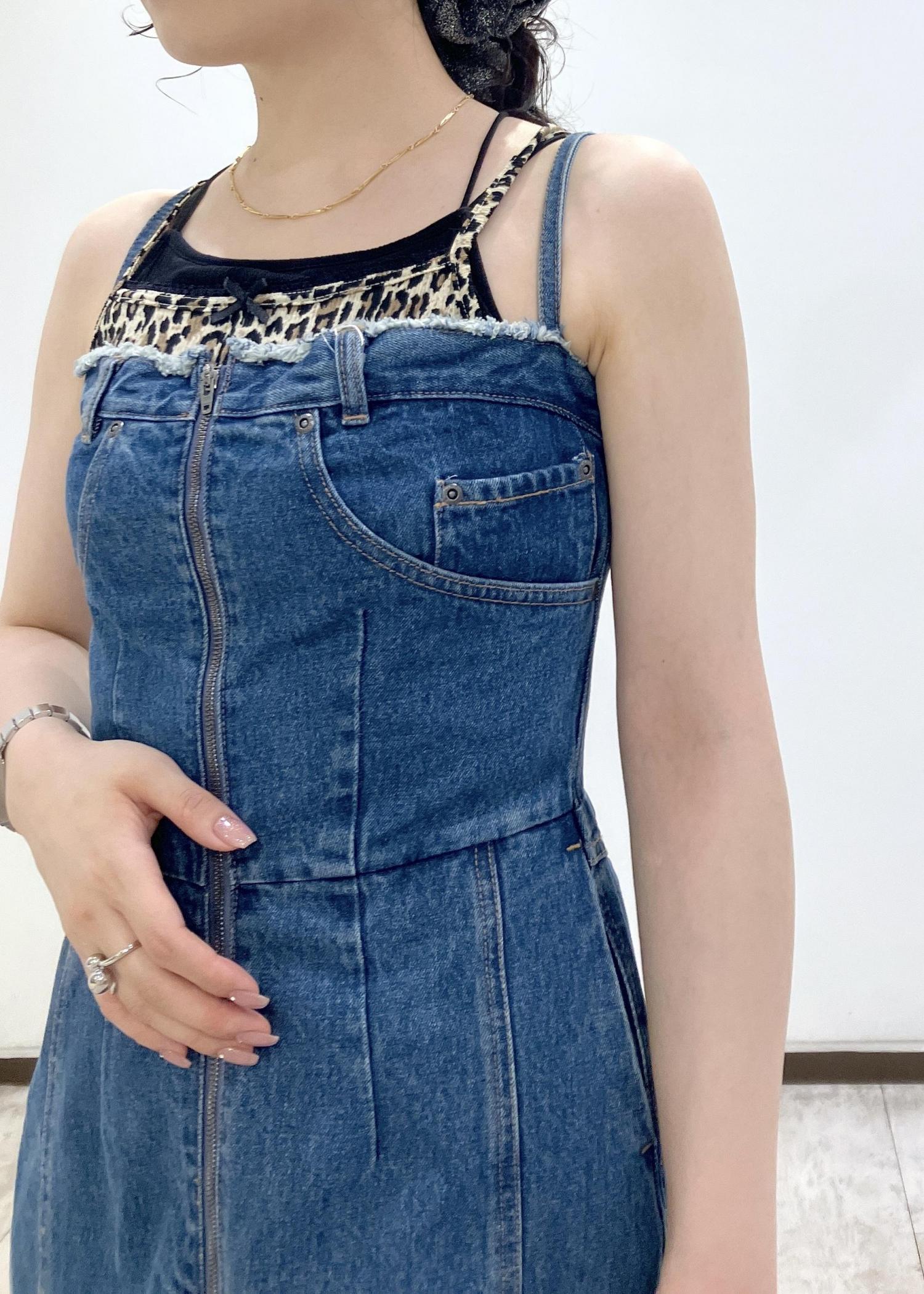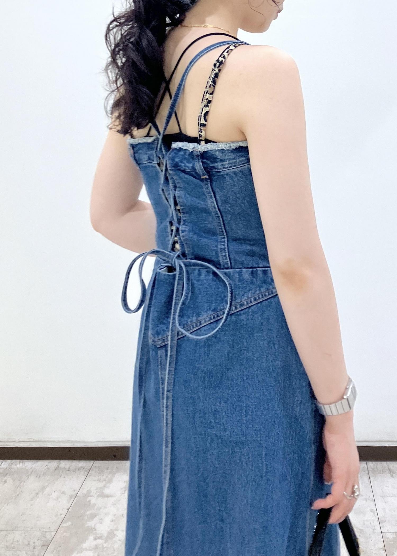 デニム素材のキャミワンピースをメインにしたコーデ。