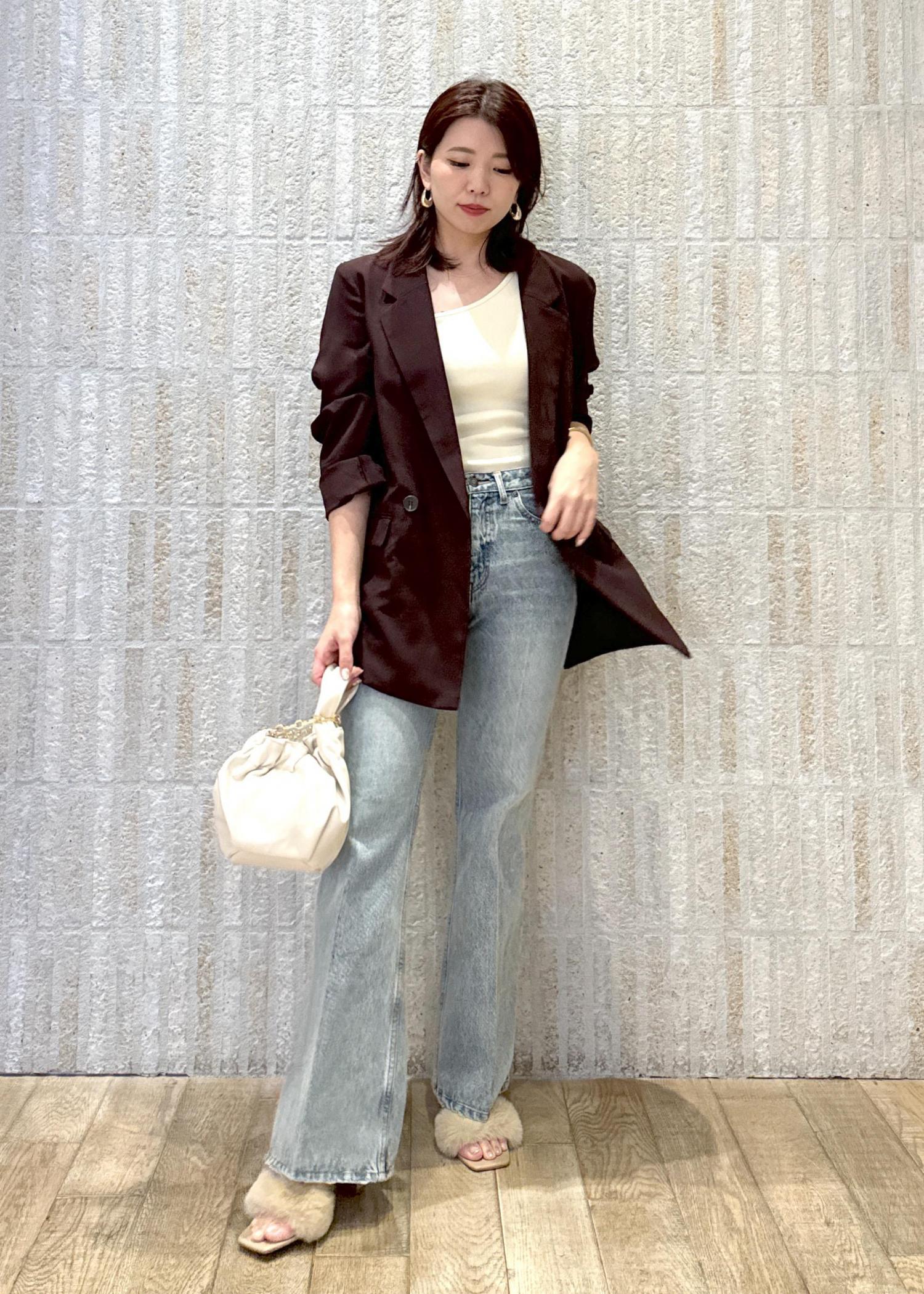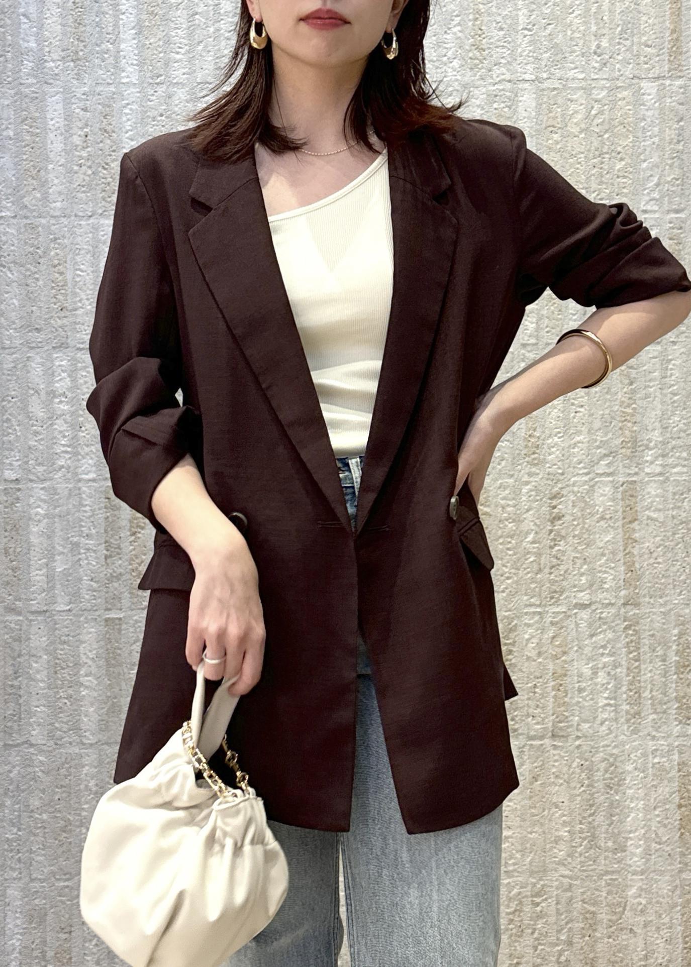 深みのある赤っぽブラウンのジャケットを合わせるとキリッとかっこいい印象になりますね☺︎