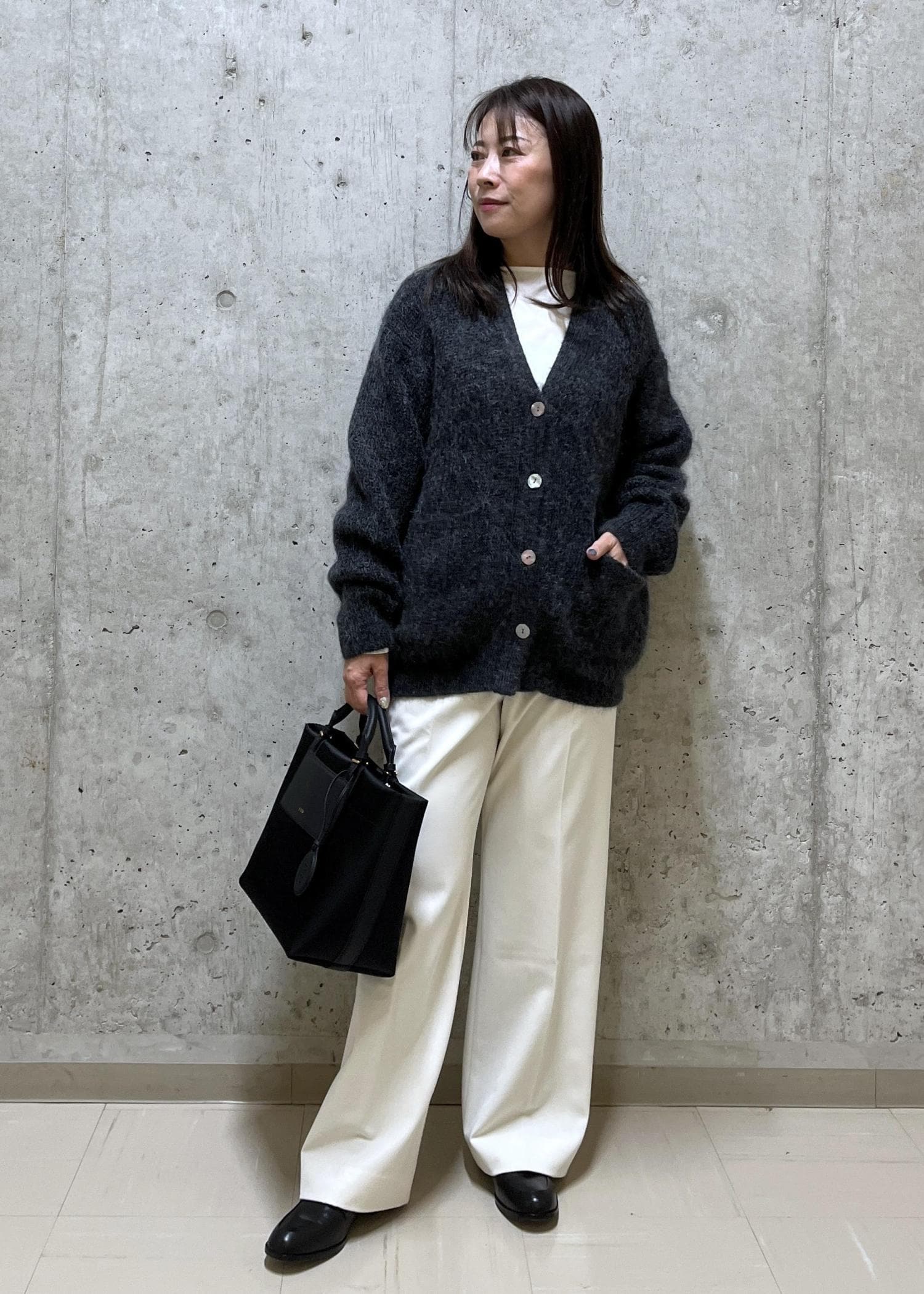 身幅はゆとりがありますが、首元が鎖骨が隠れる開きなので、スッキリ見えます。