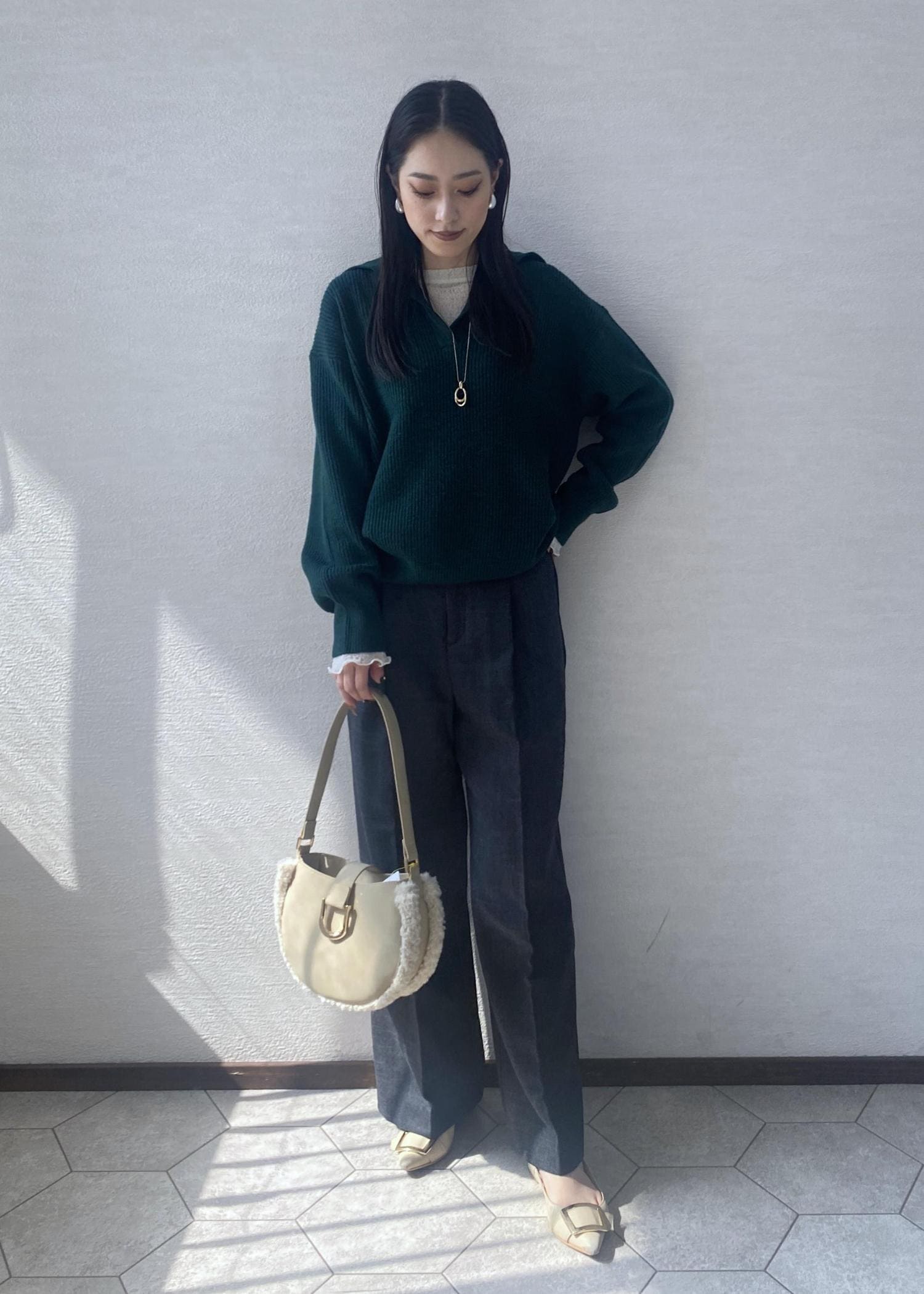 オーバーサイズなブルーのシャツにフリンジジャガード素材が存在感のあるパンツを合わせた大人カジュアルなコーディネートです。
