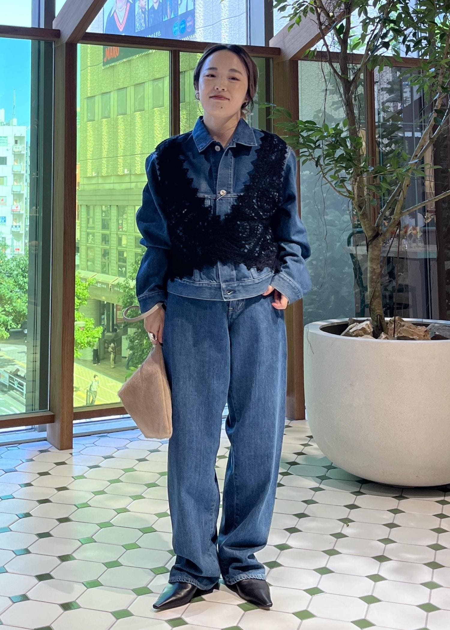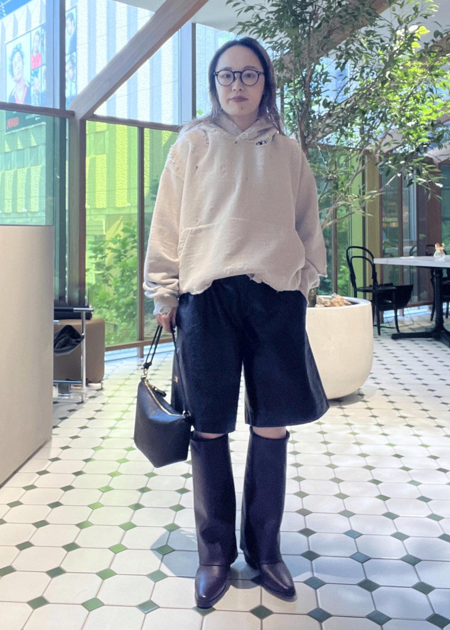 152cm、写真では5cm程丈詰めしております。O脚なのもありますが、股に隙間が開くくらい細めなシルエットです。お尻周りはピッタリきすぎず付かず離れずです。ウエストは後ろゴムなのでゆったりしています。