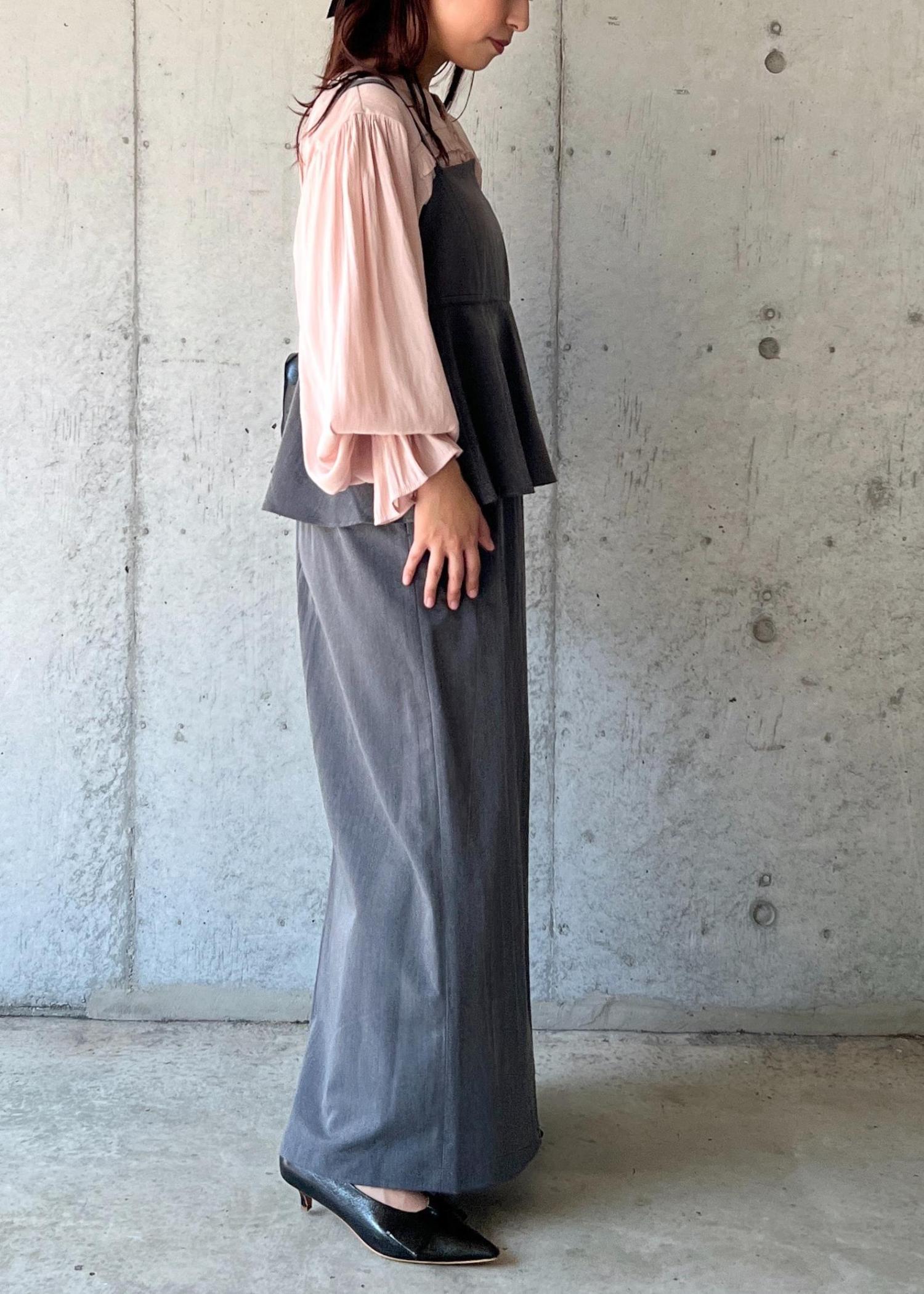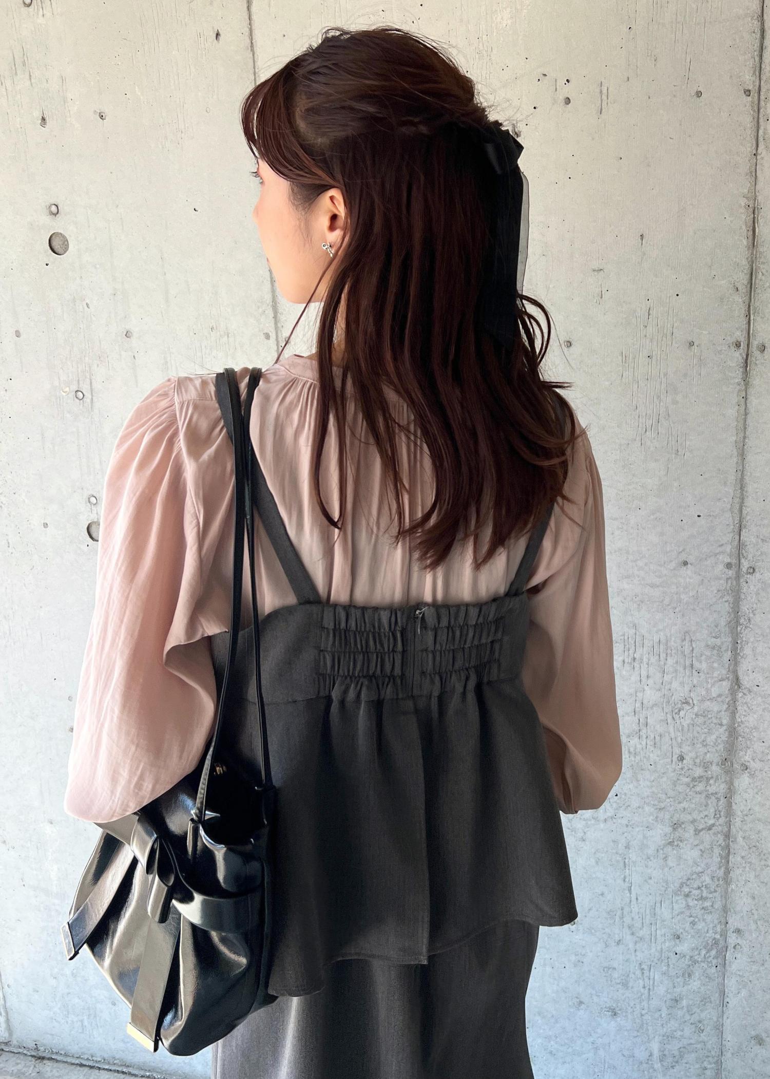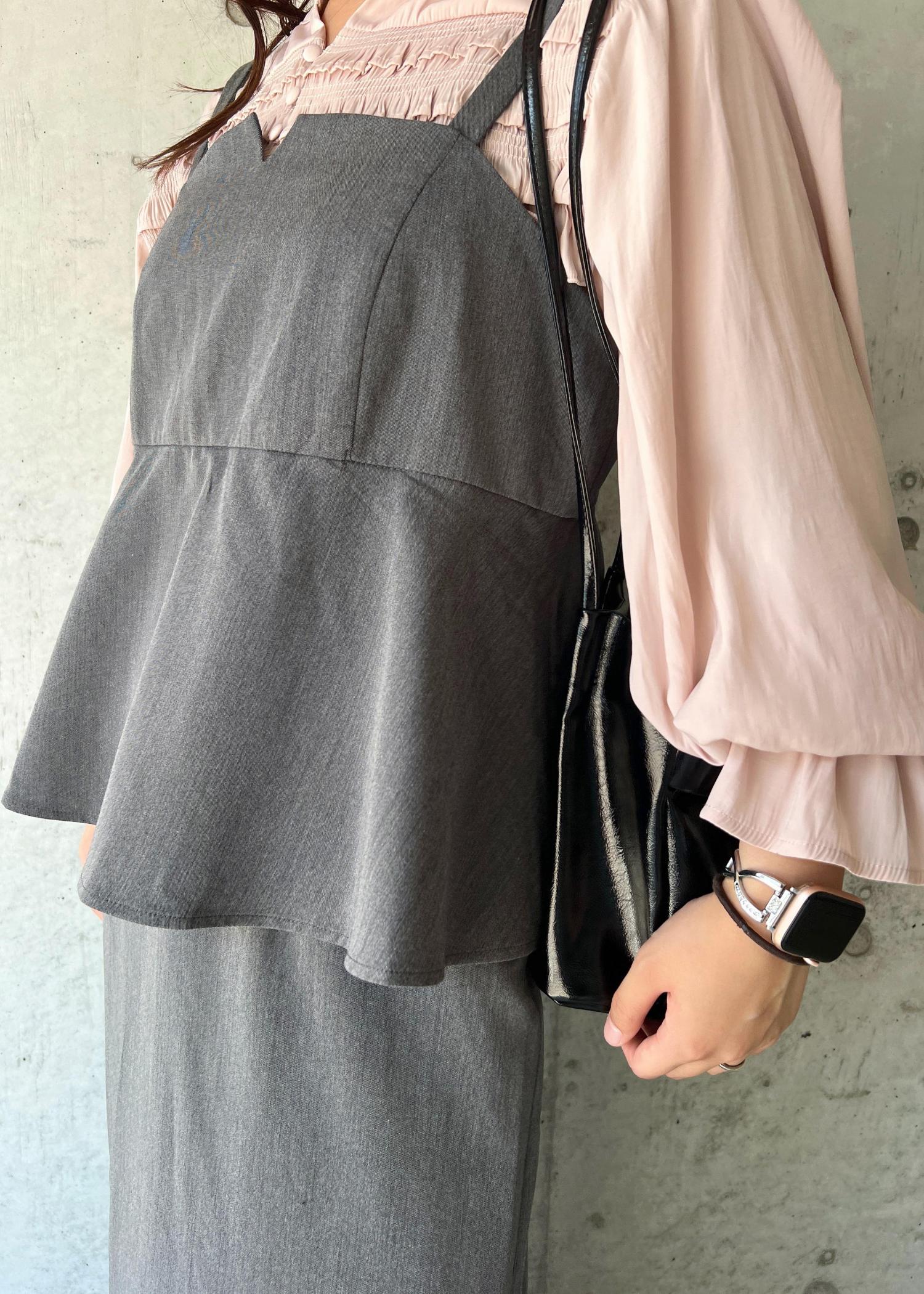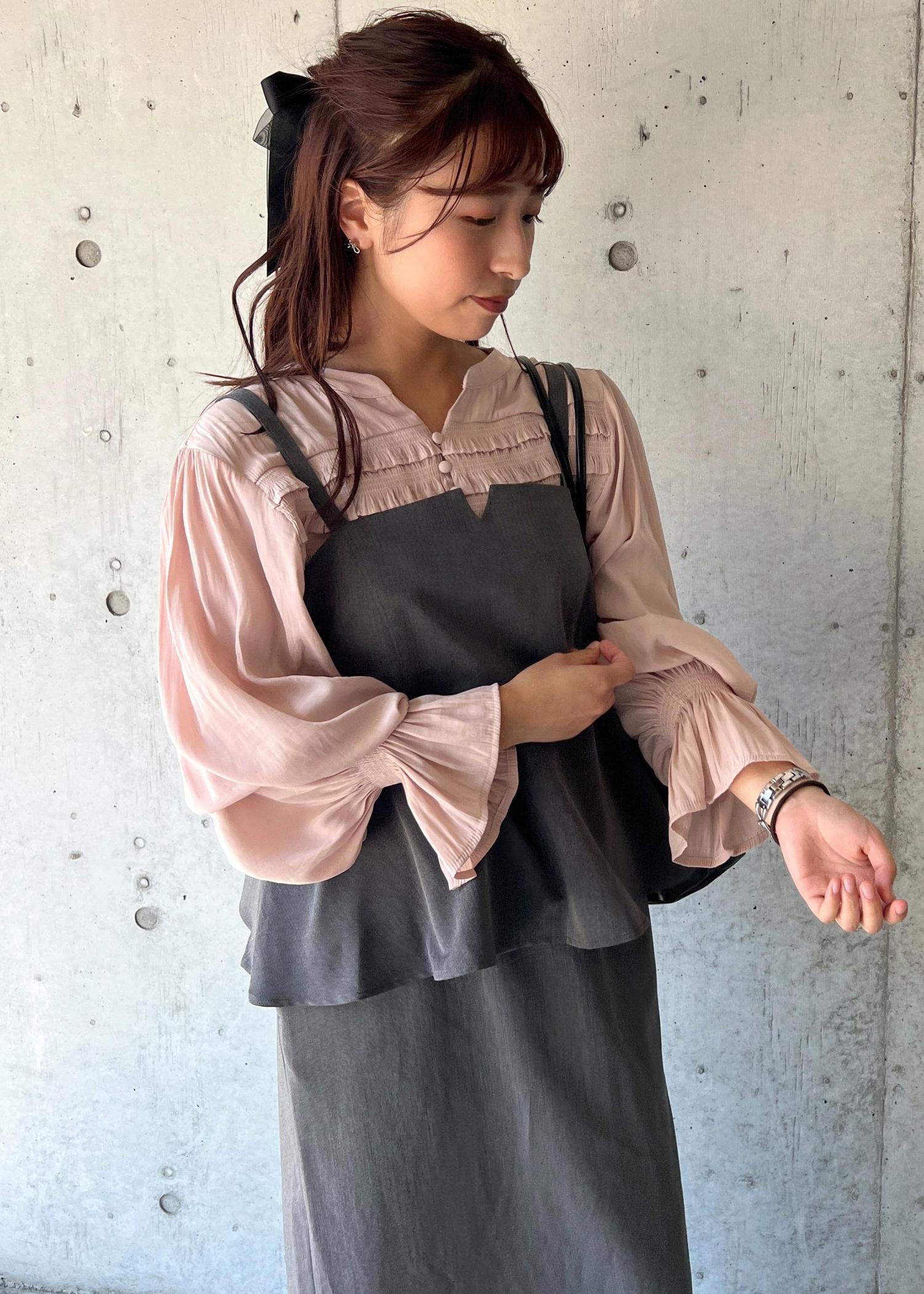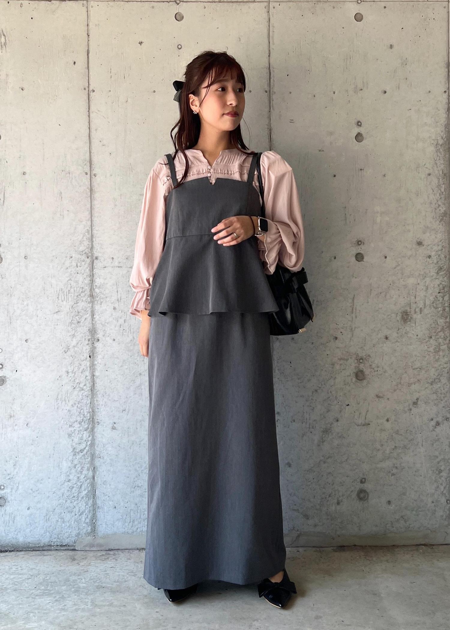 カーブディテールをブラウスとワンピースで合わせたフェミニンフリルコーディネートです。