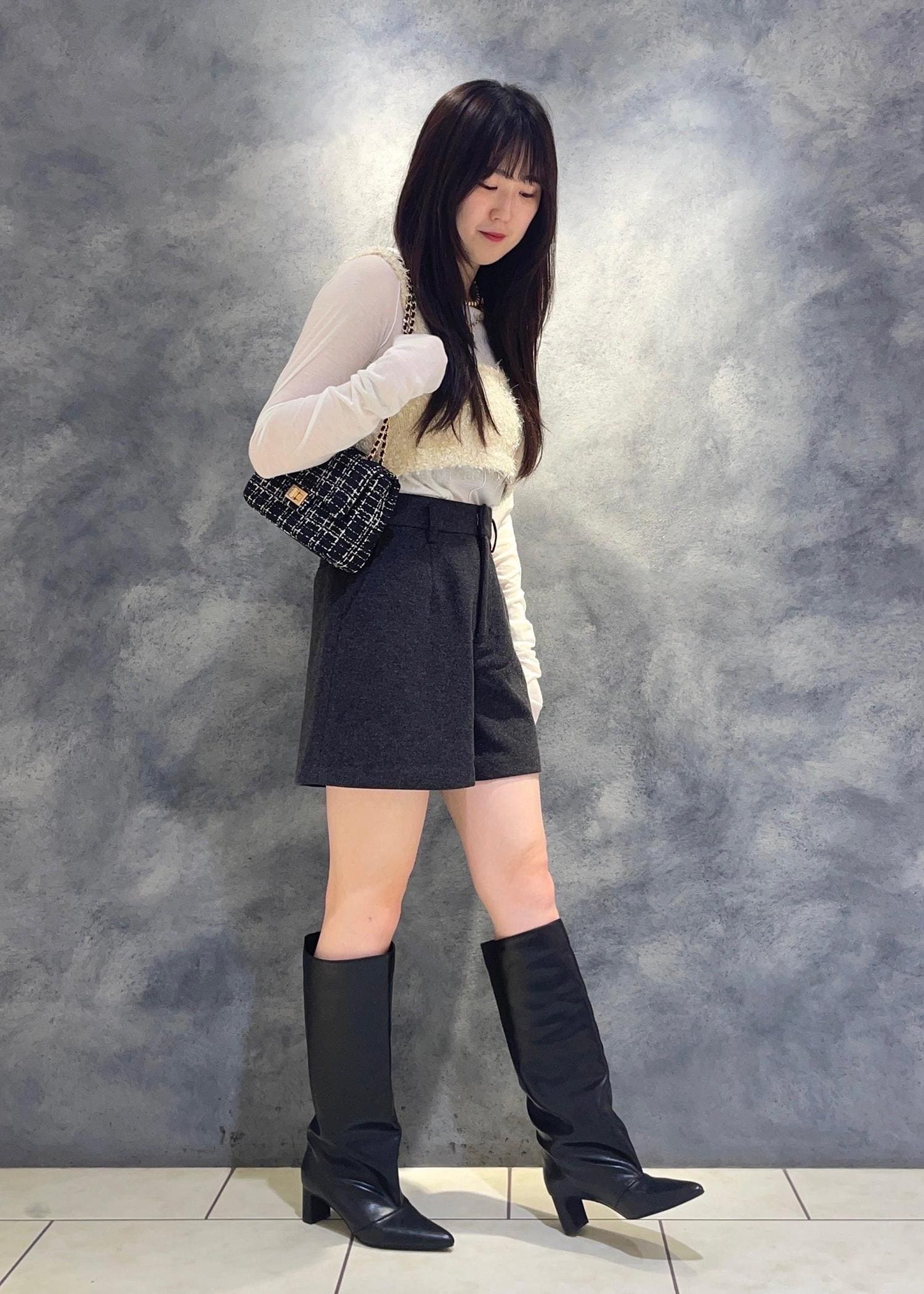 カットソーにキラキラのビスチェをレイヤードさせ、