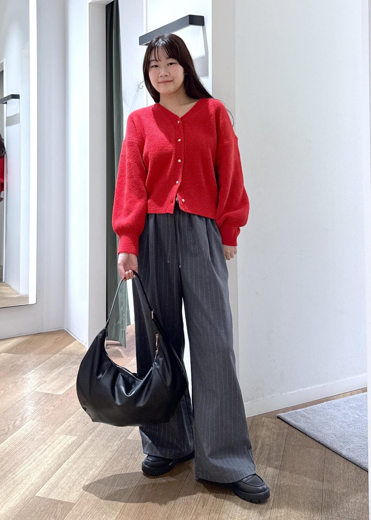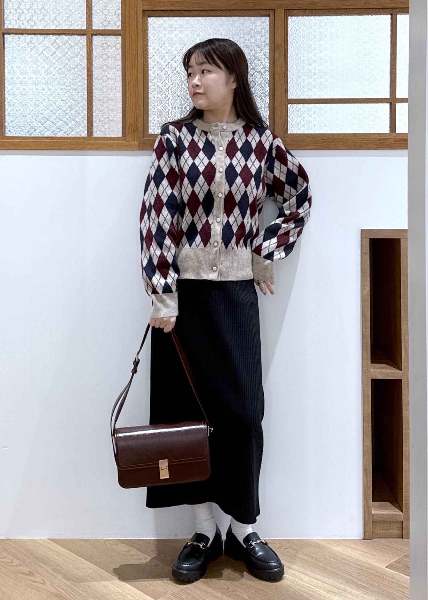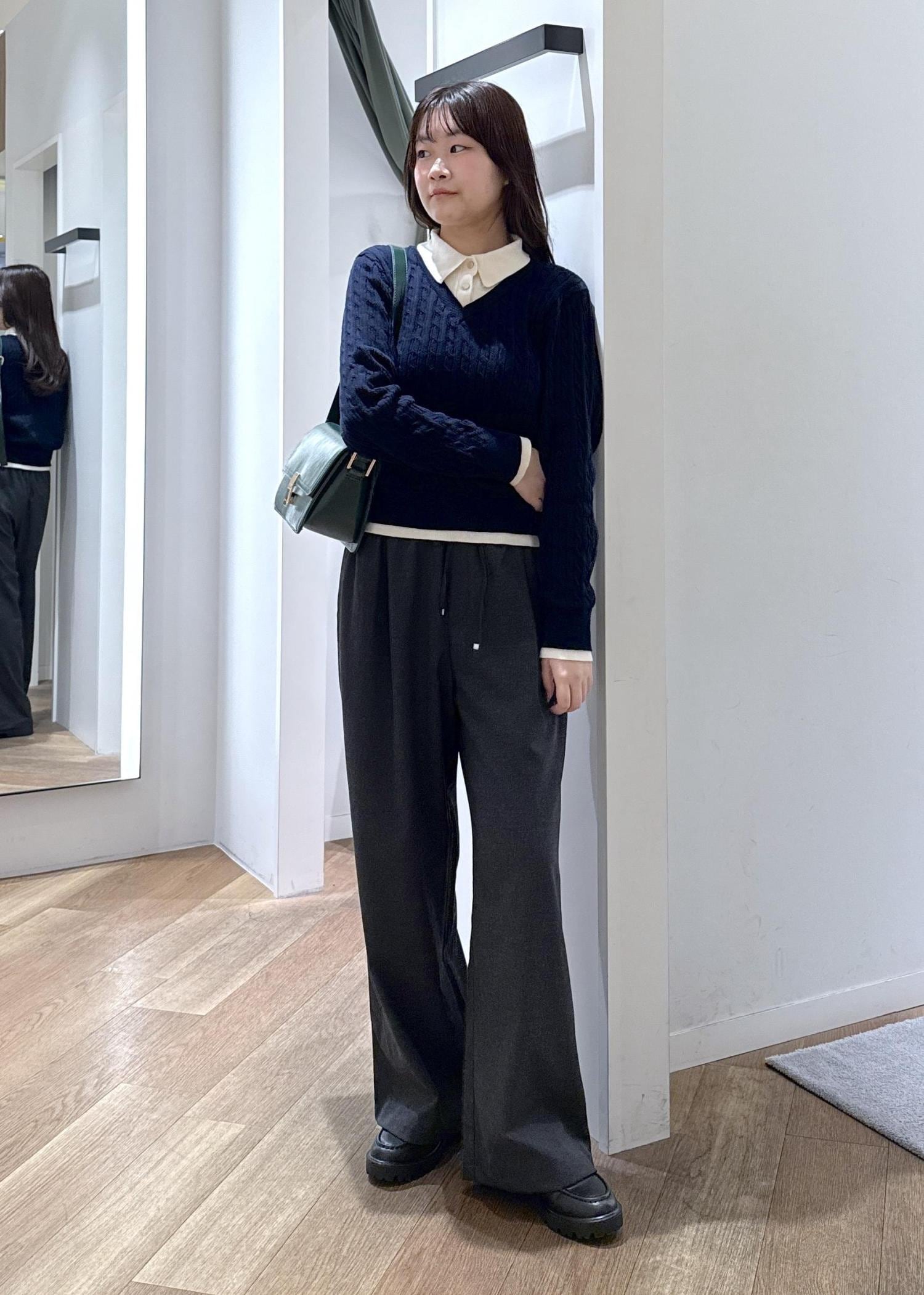 色味はブルー×グレーで統一しました。インナーのロンTがコンパクトなサイズ感なのでファーベストをレイヤードするのにピッタリです。小物はシルバーで統一し、シャレ感をプラスしました。