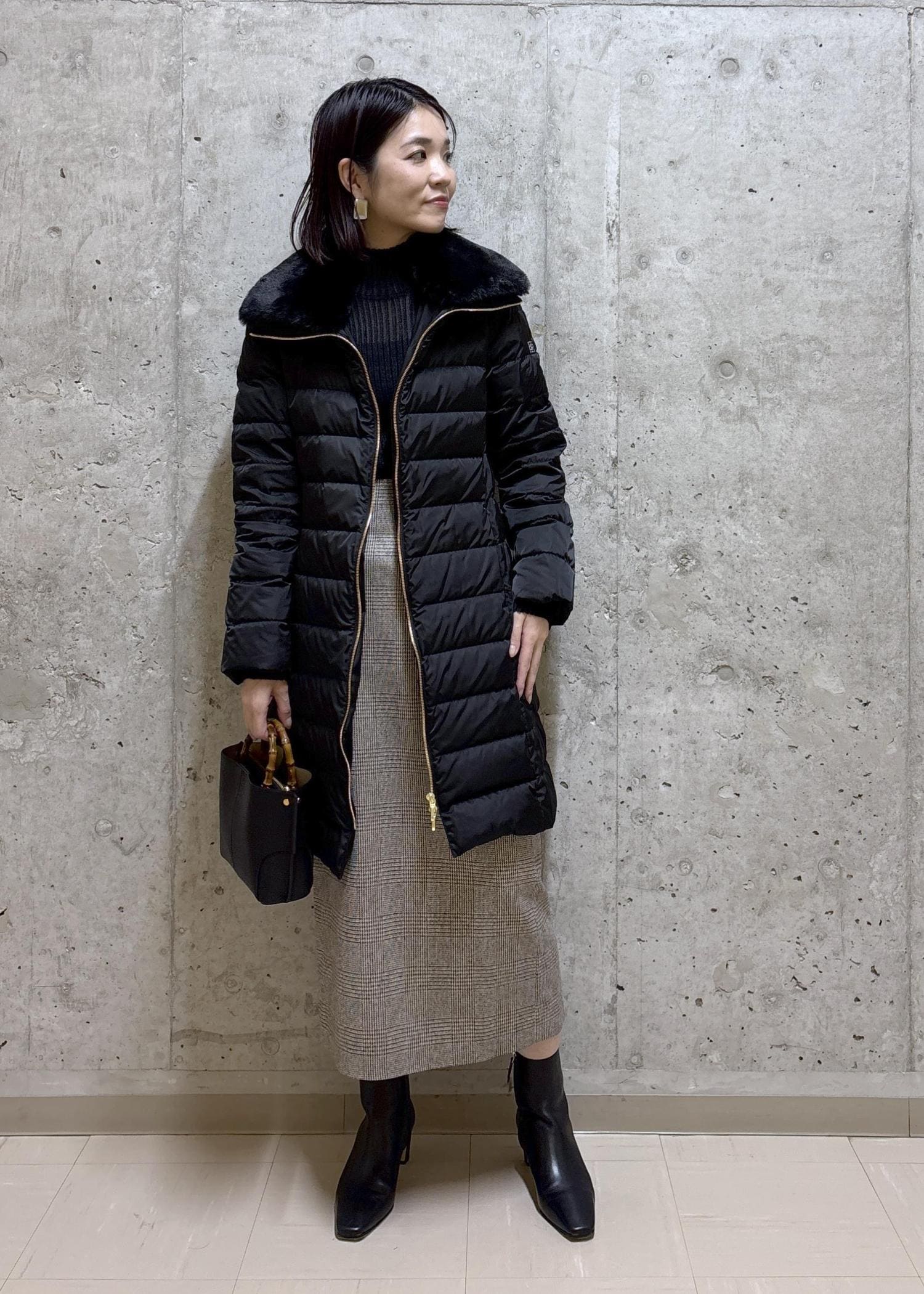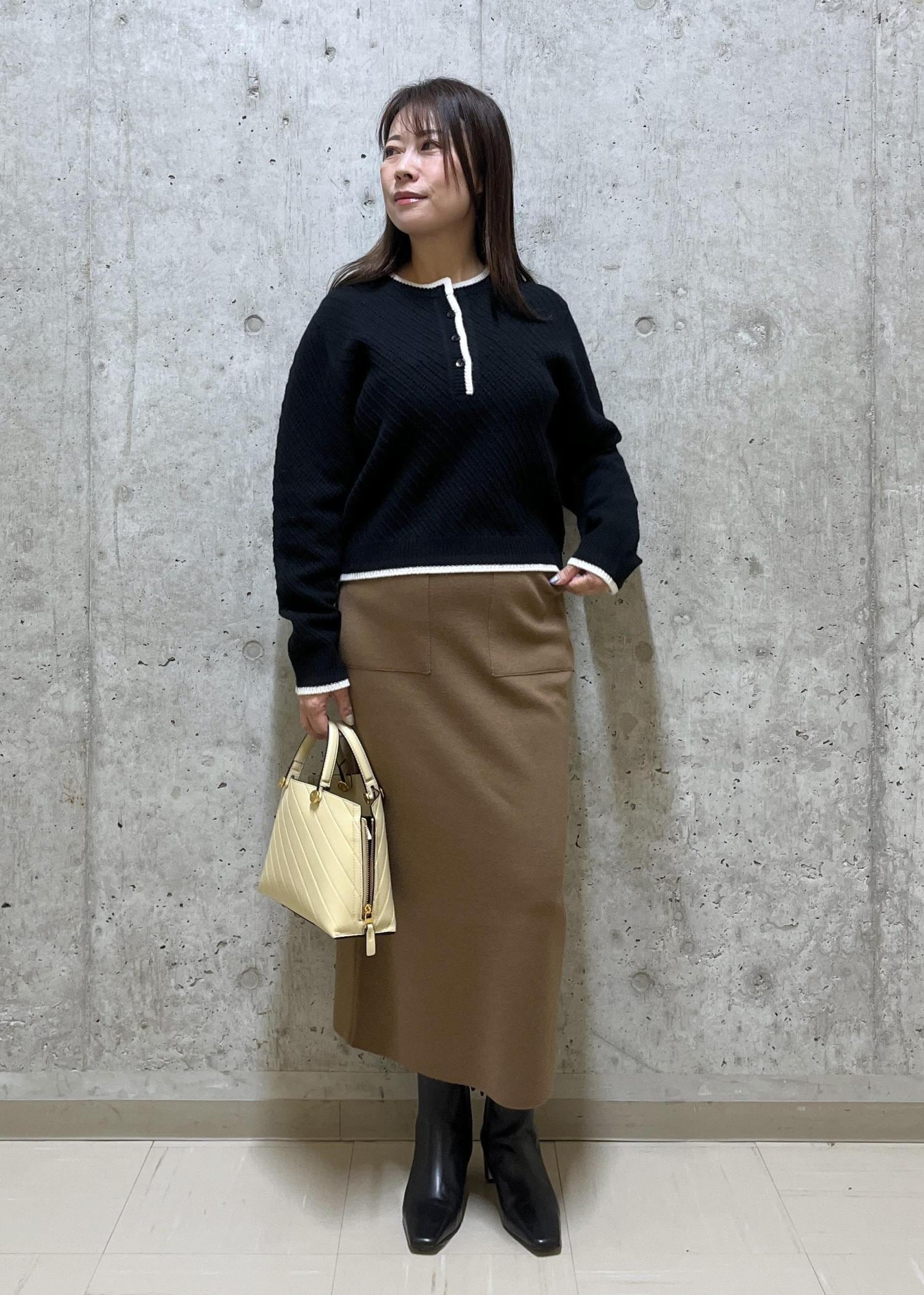 ボリュームのあるニットですが、短めのスッキリとした丈で、小柄な方にオススメのコーディネートです。