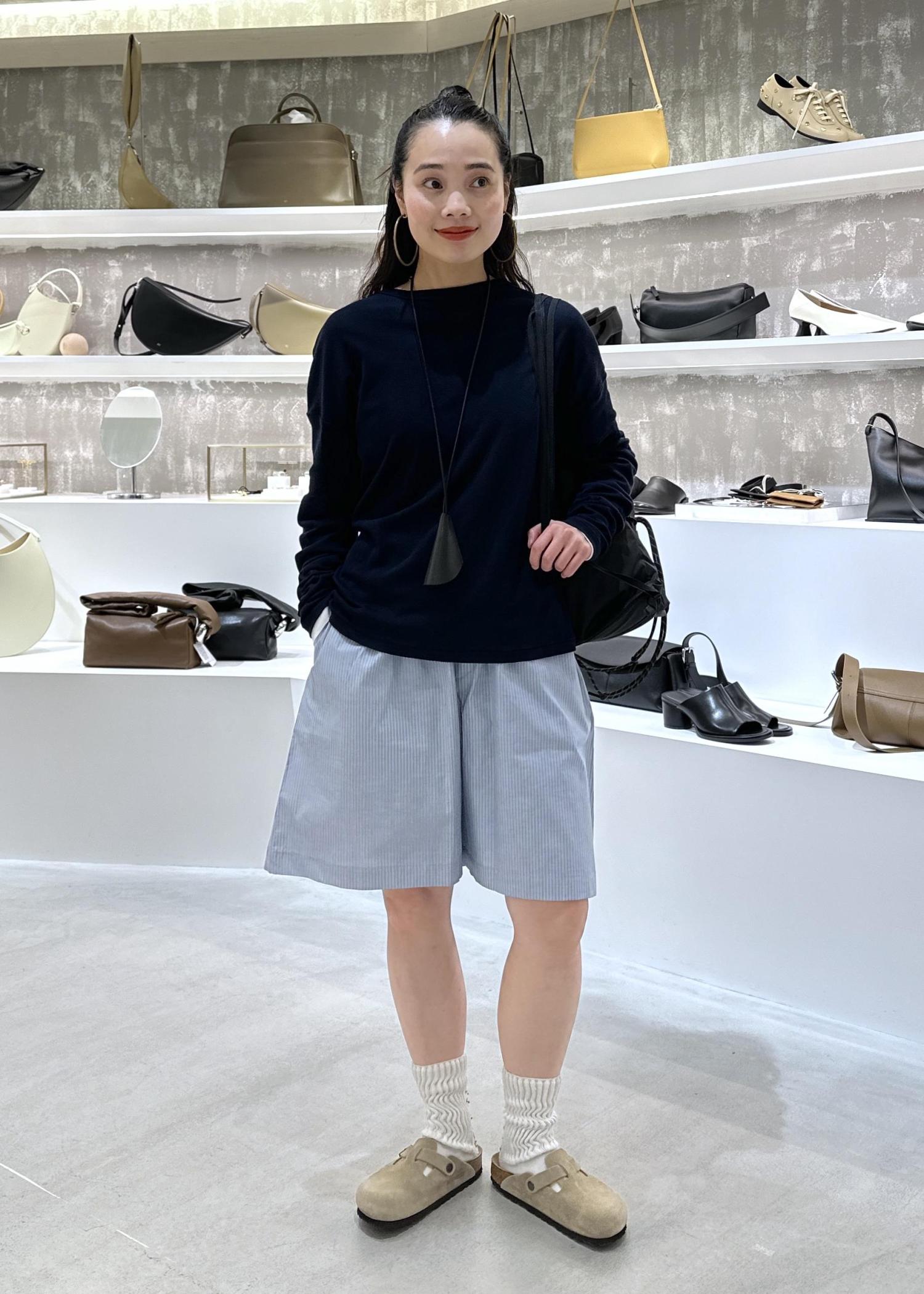 赤色の発色がとても素敵なパンツをピンクのカラーのニットで少しモードなスタイリングで合わせてみました!!パンツは艶があり、とっても上品な雰囲気なので、シンプルなニットとも相性がよく合わせやすいんです。パンツもワンサイズですが、ゴムなので、楽に履いていただけます。