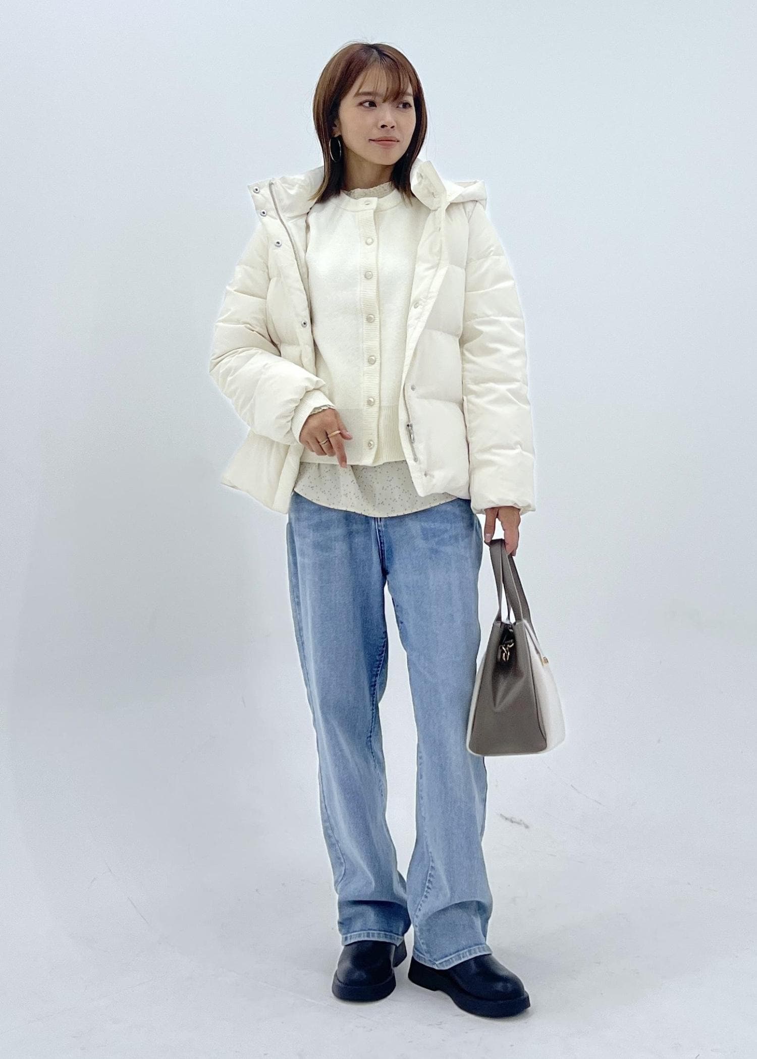 デニムのフレアパンツ合わせで、大人のきれいめカジュアルスタイルにしました。