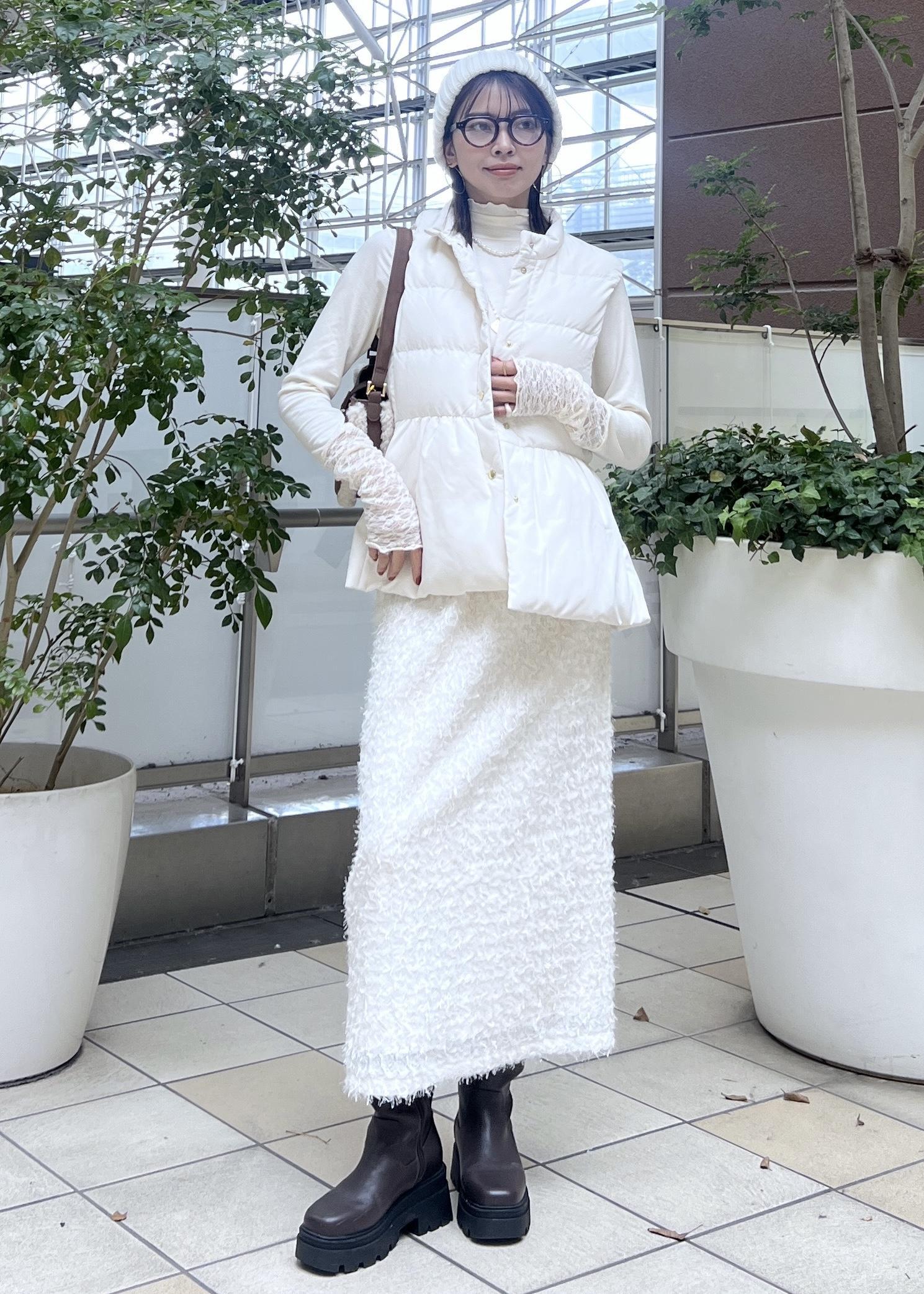 タートルネックに合わせて衿元にはスカーフを忍ばせて、フレンチシックな着こなしです。