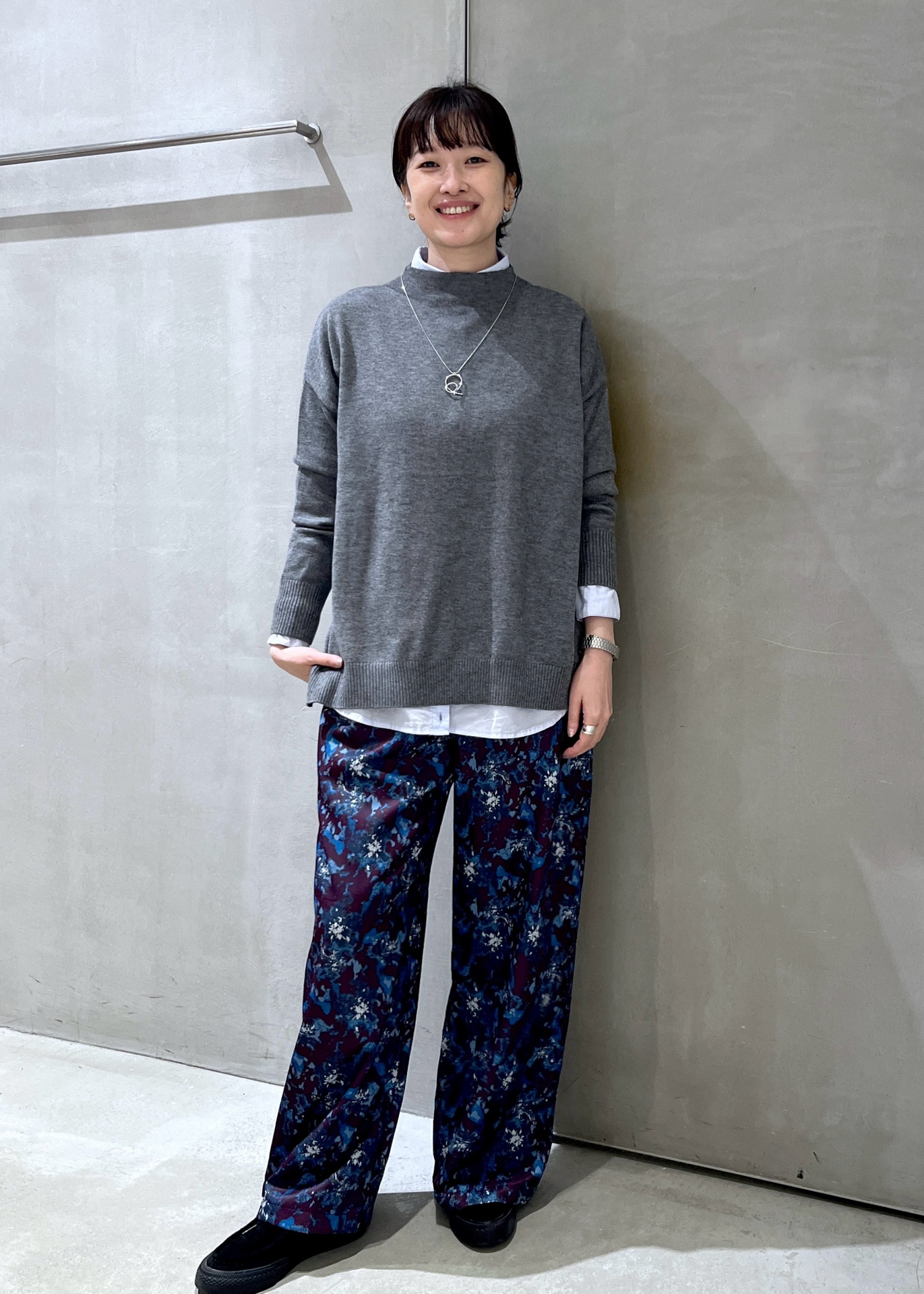 今回のコーデのようなカジュアルにも、プリーツスカートなどと合わせてキレイめにも、どんな服装でもシンプルゆえに合わせやすい!そんなニットです。