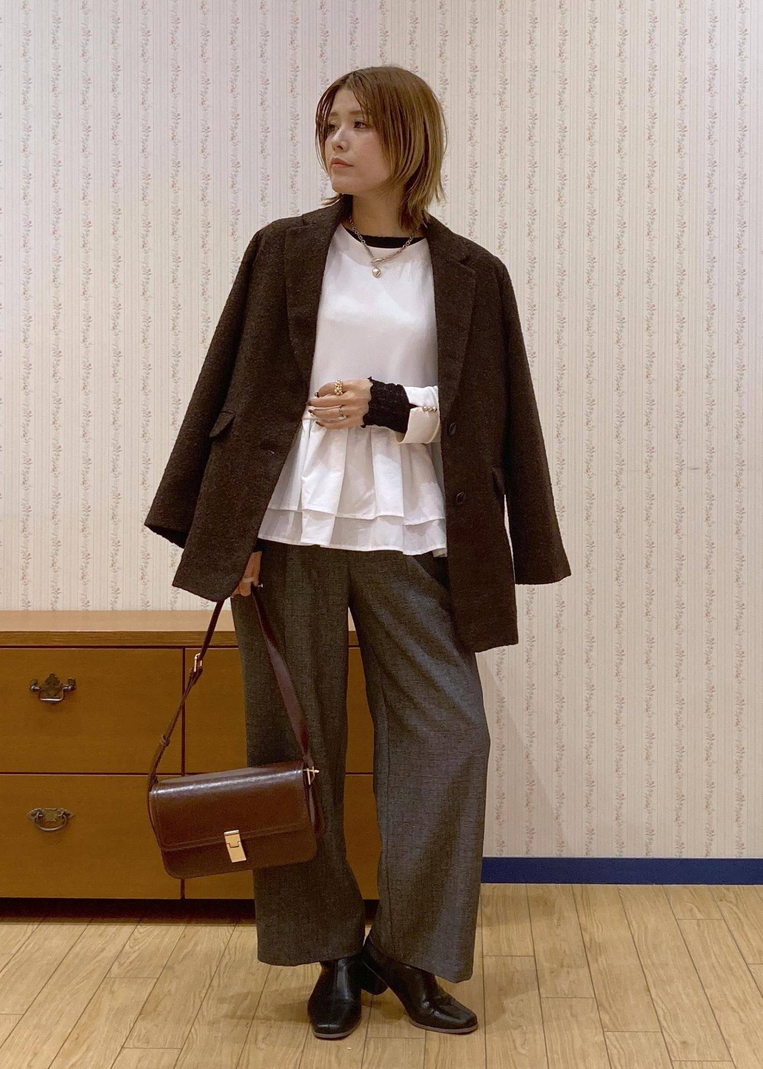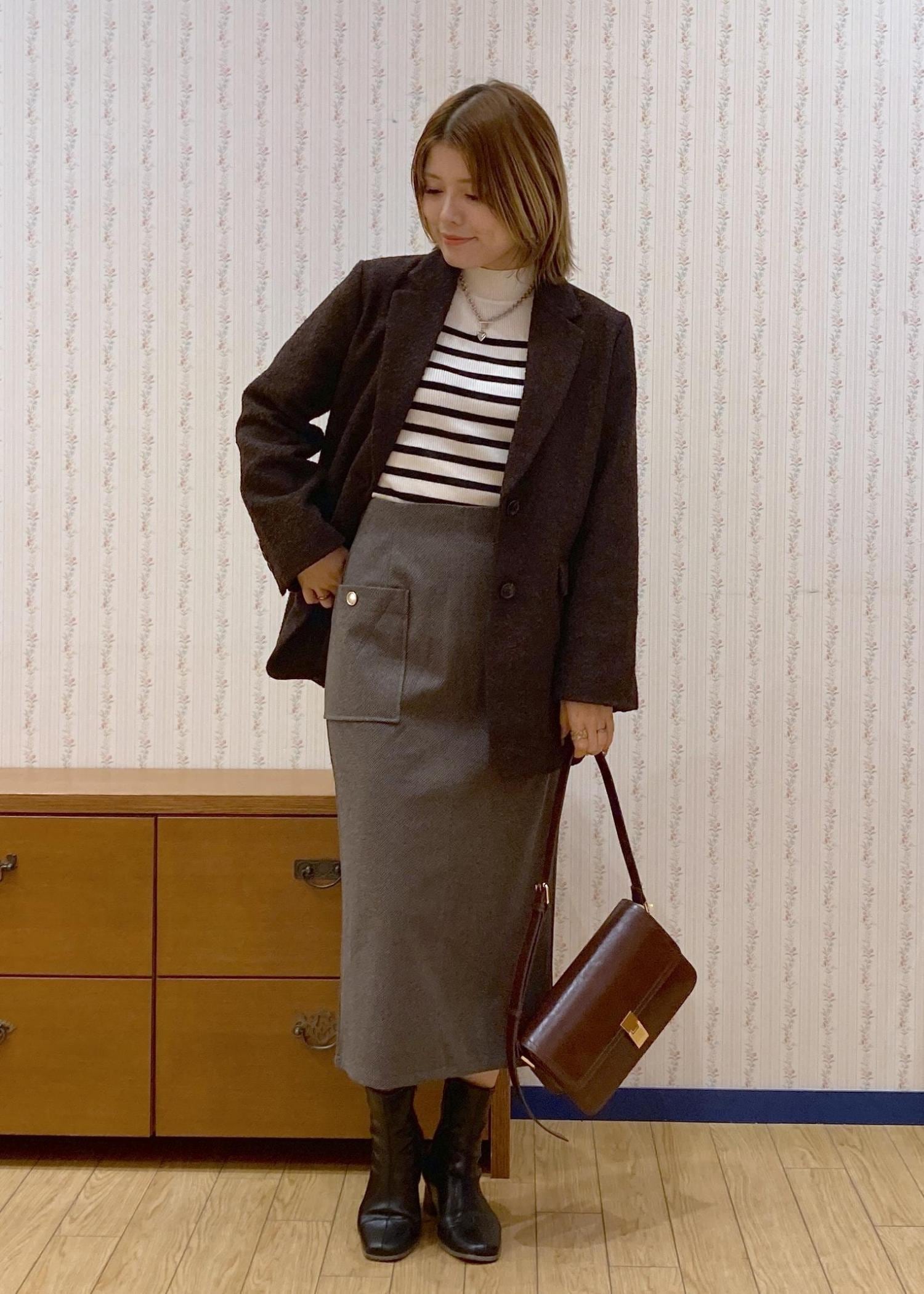 オーバーシルエットのブルゾンにコンパクトな台形スカートを合わせたフェミニンコーディネート。