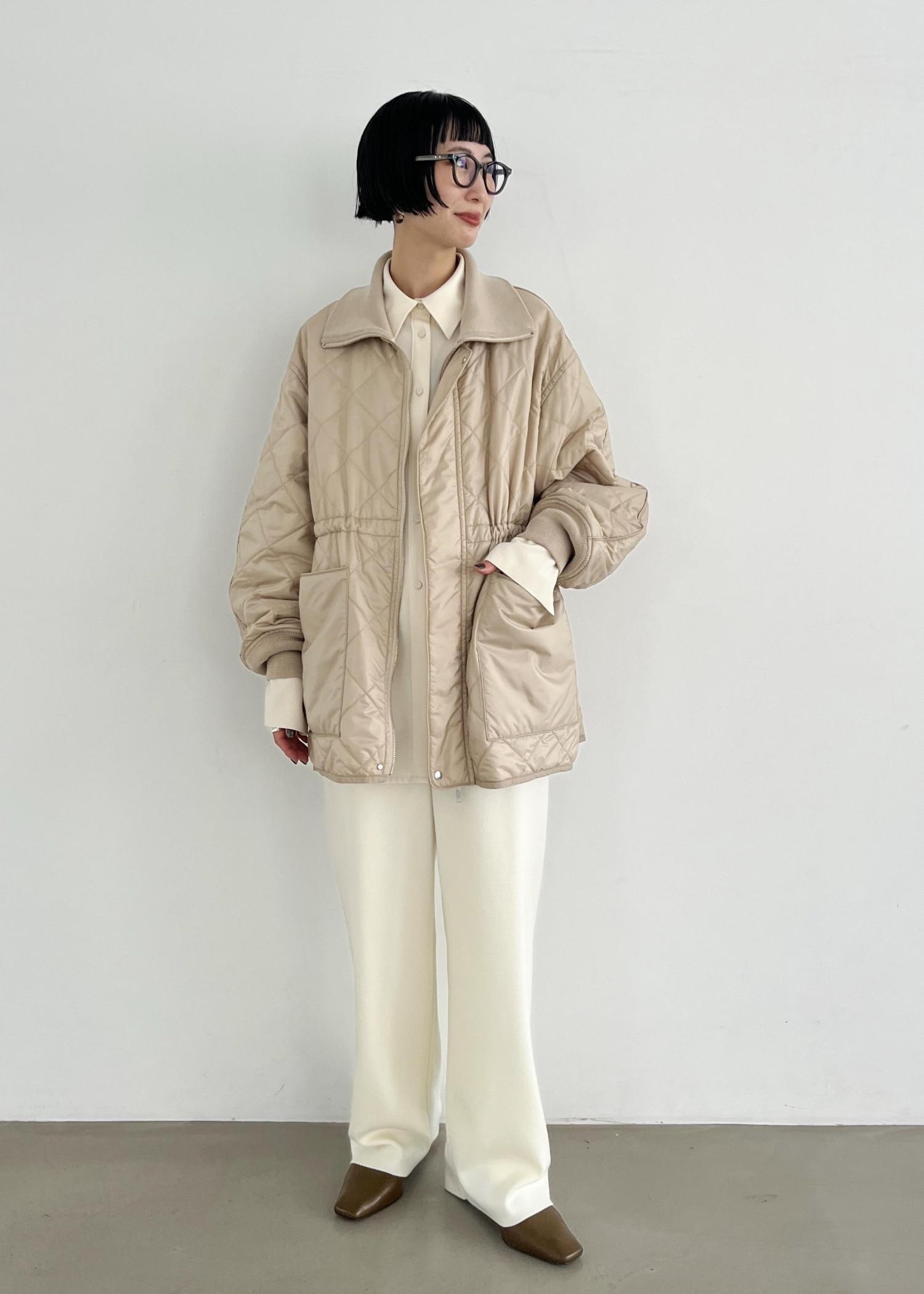 中わたジャケットにチャコールのサスペンダーカーゴパンツ、ライトグレーのニットを組み合わせたシンプルなモノトーンコーデです。足元はローファーでキレイめに合わせました。ジャケットはトレンドのダブルジップなのでインナーを少しだけレイヤードした見せ方もできます。脱いでもシンプルで決めすぎてない感じがかっこいいです。