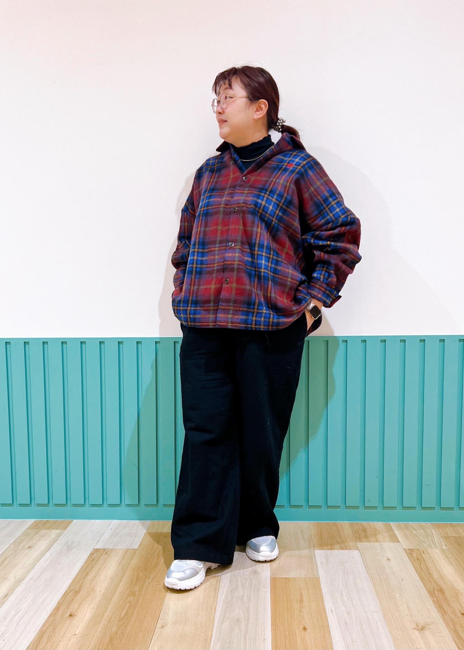 大判シャツとワイドパンツで