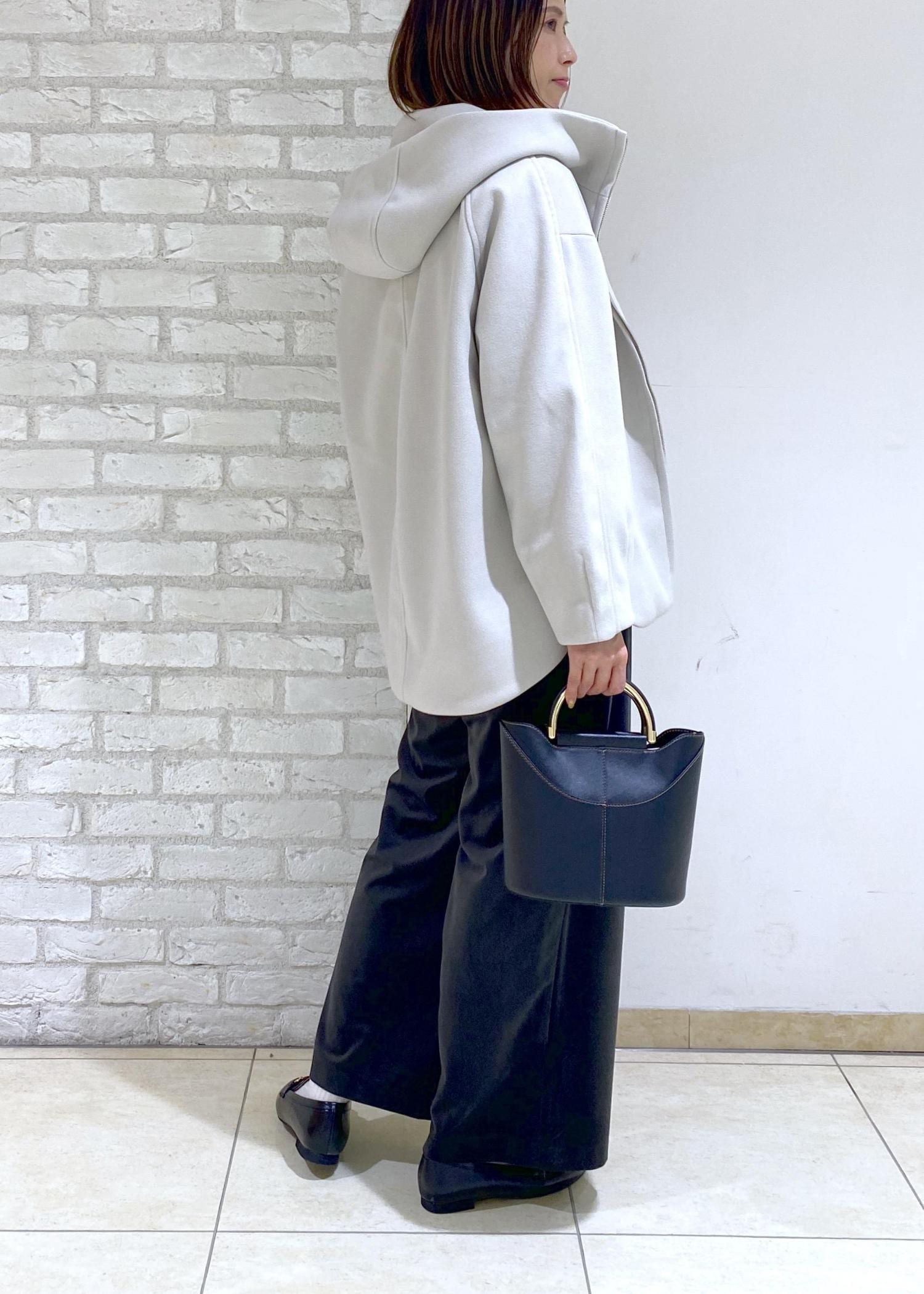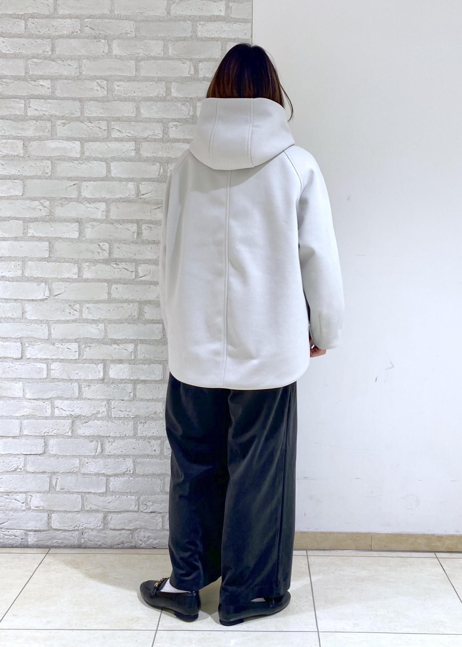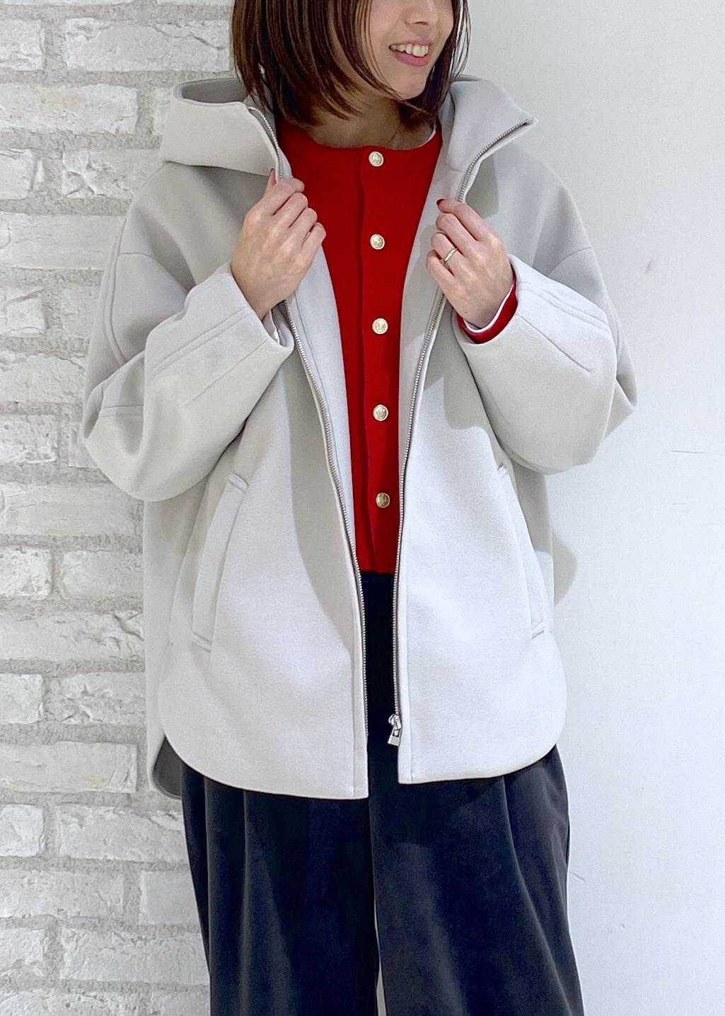着丈は腰にかかる程で長すぎず、パンツやスカートどちらにも合わせやすい丈感です。