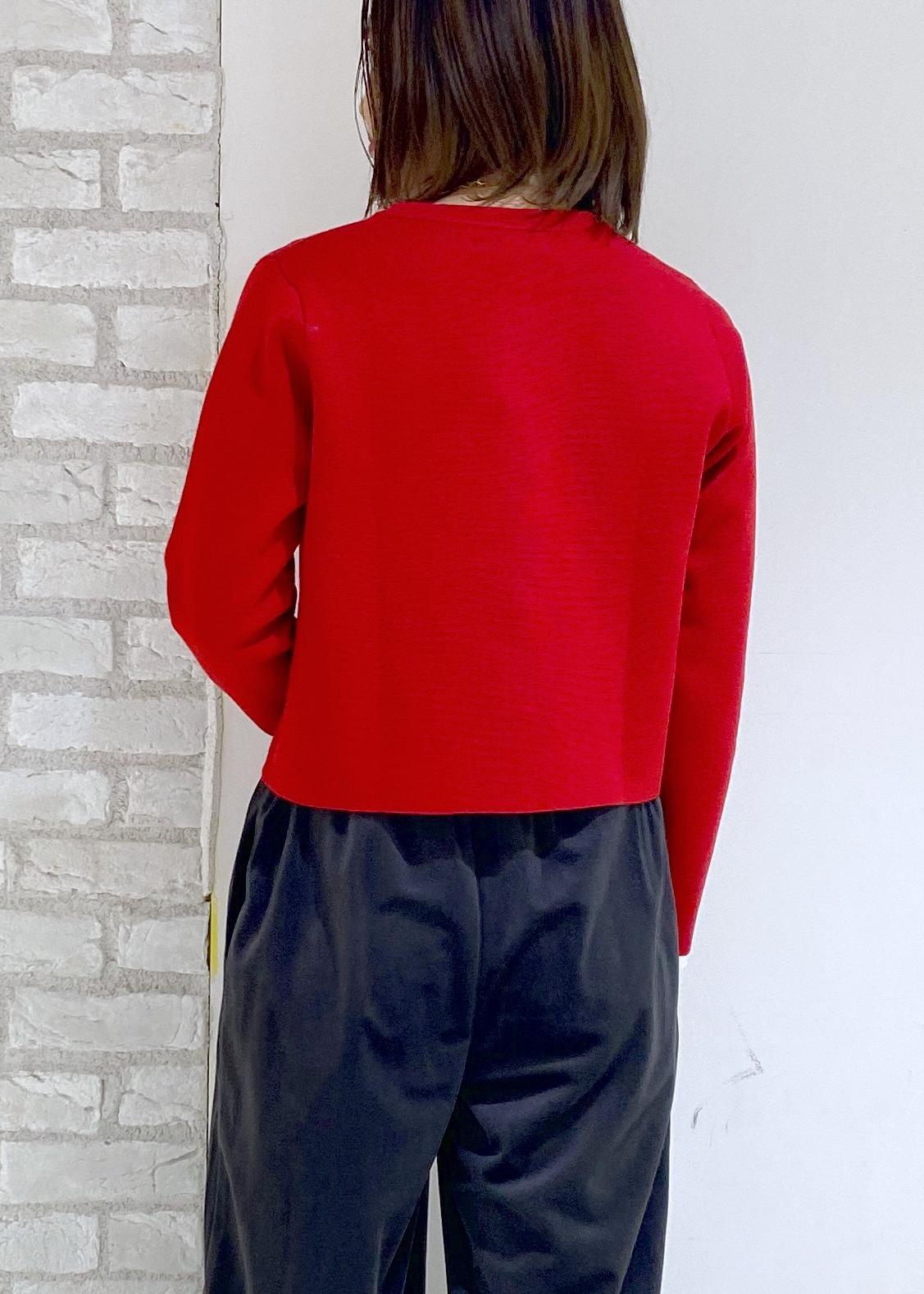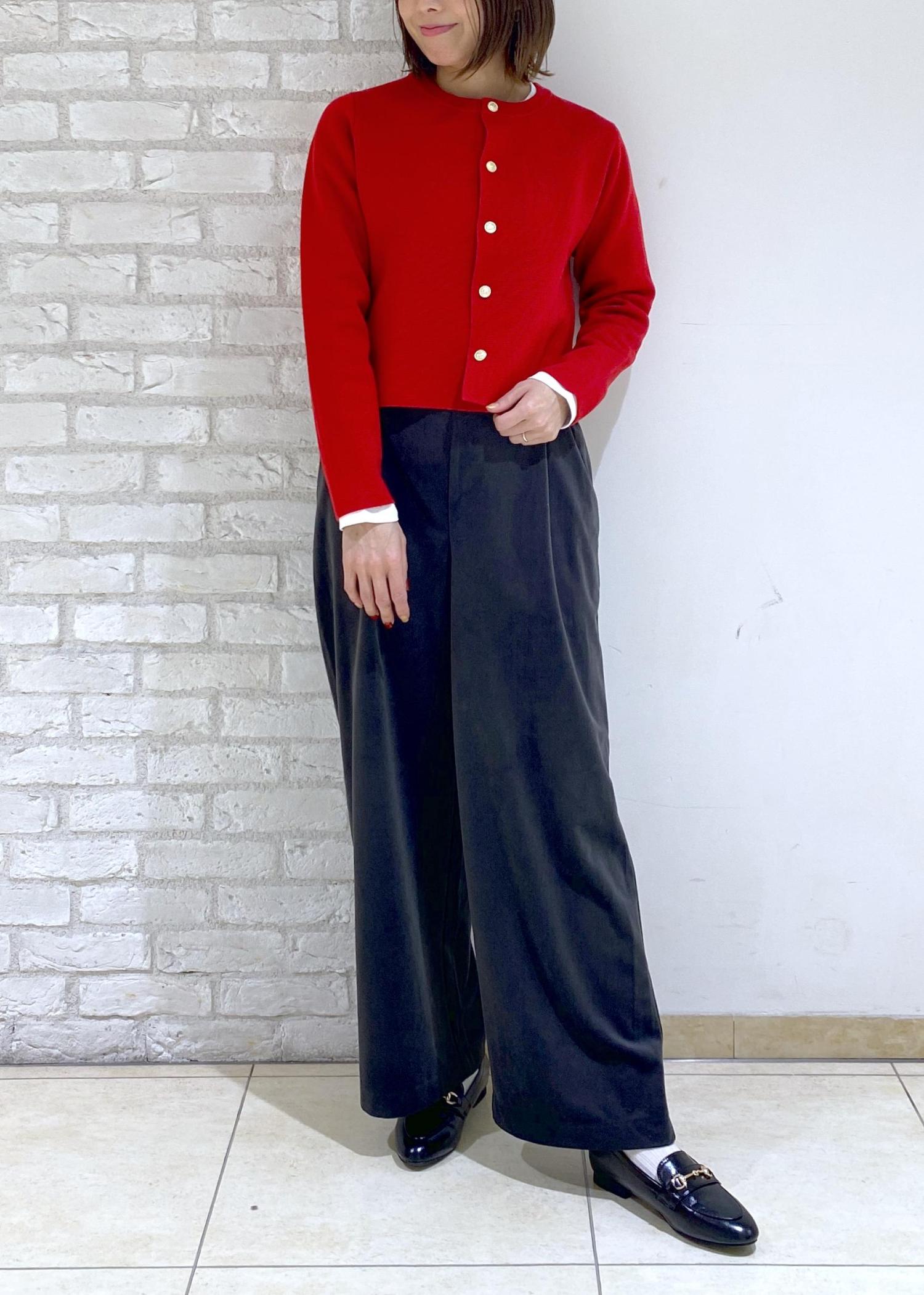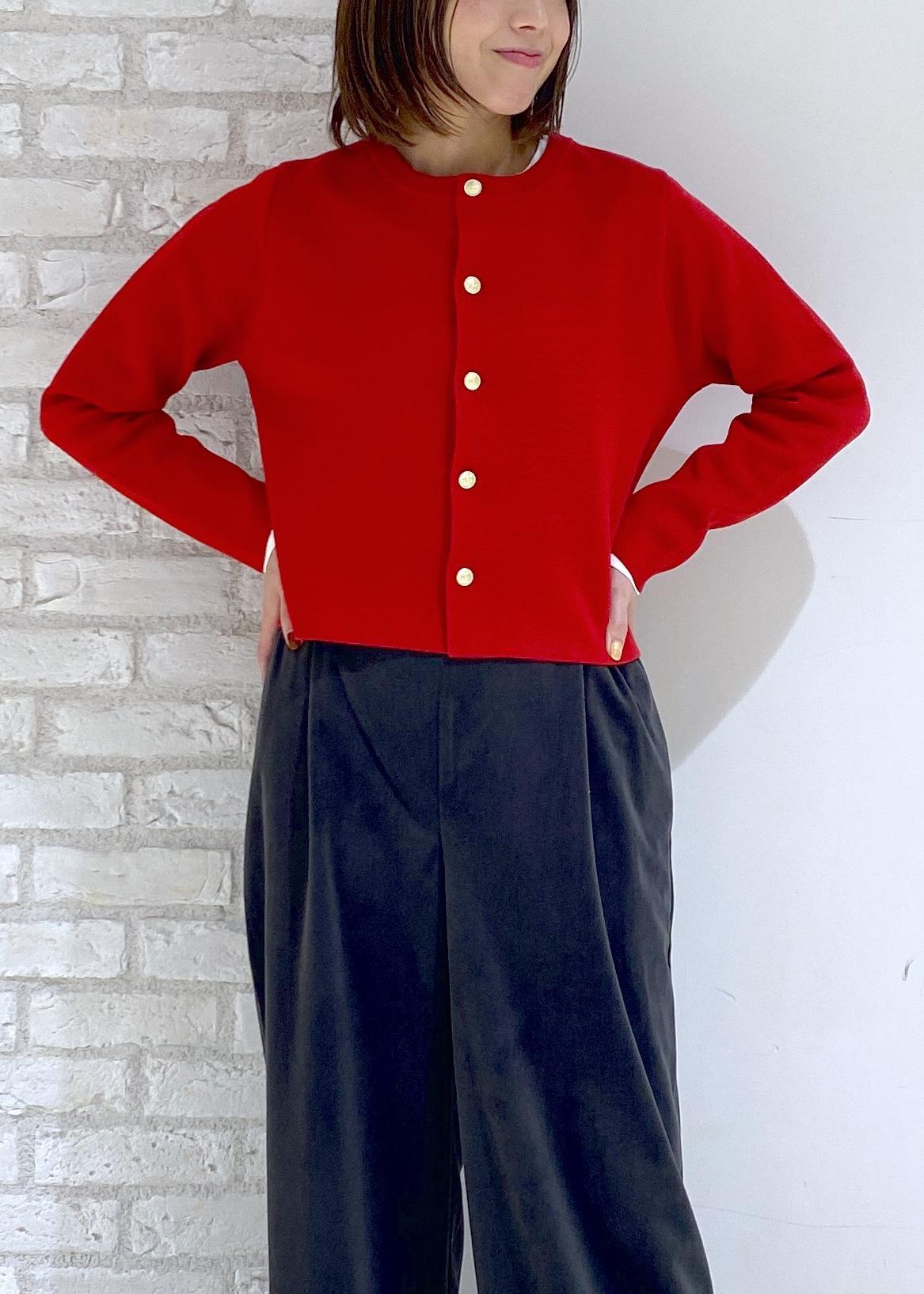 赤色の金釦カーディガンを合わせた