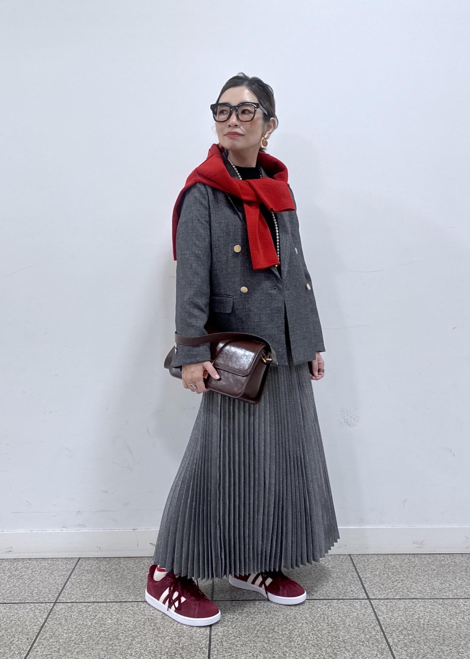 ペプラムデザインが可愛いブラウスをスカートと合わせたコーディネートです。