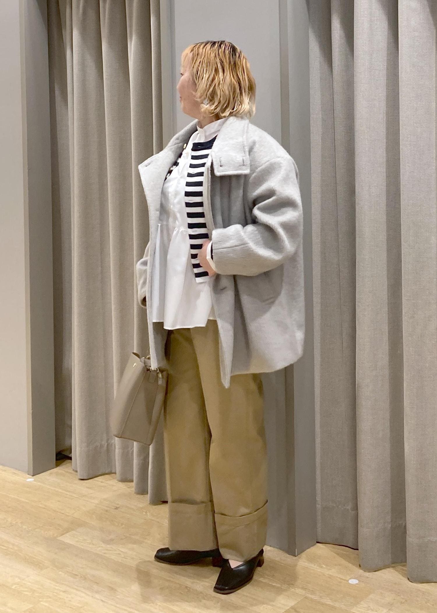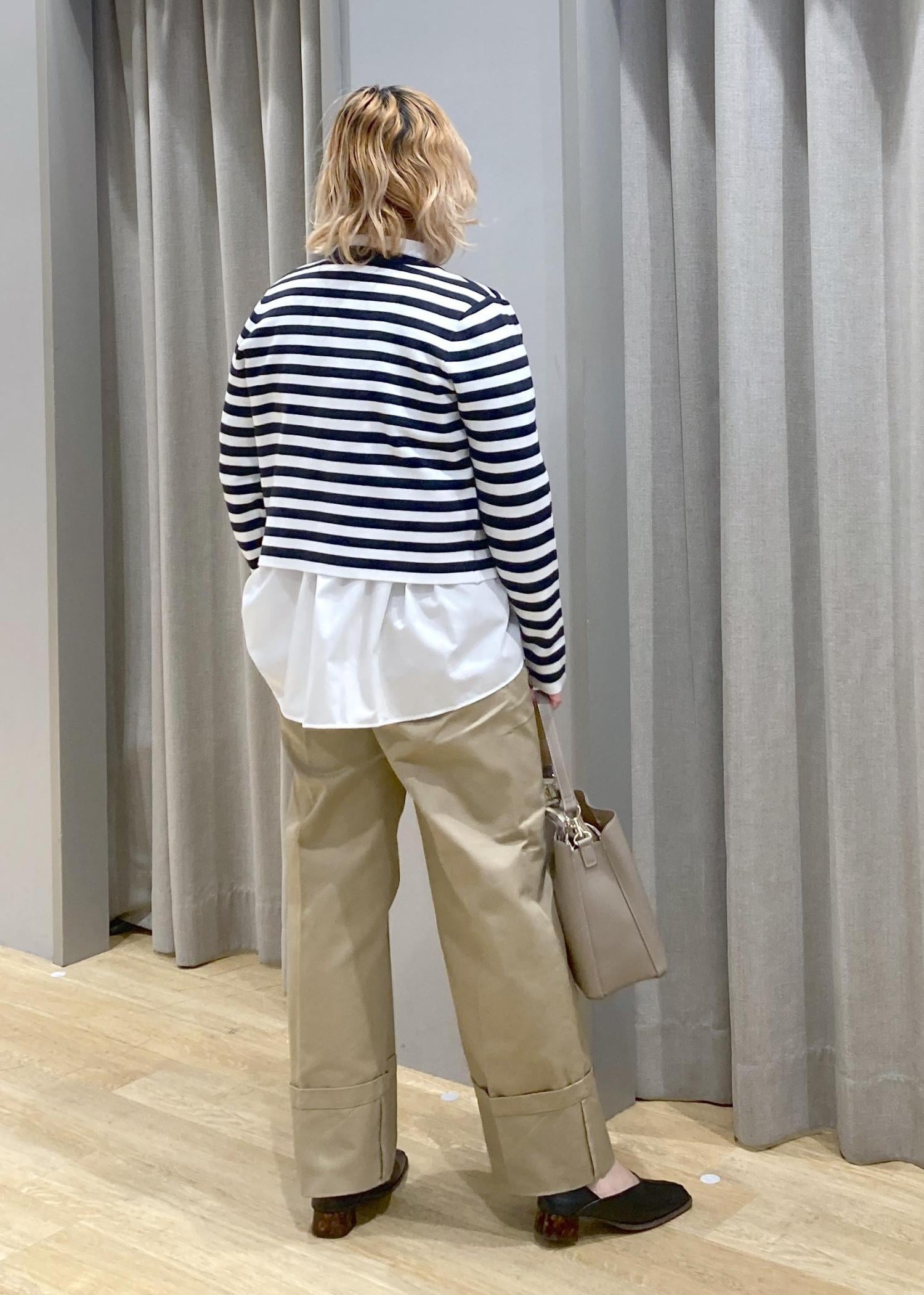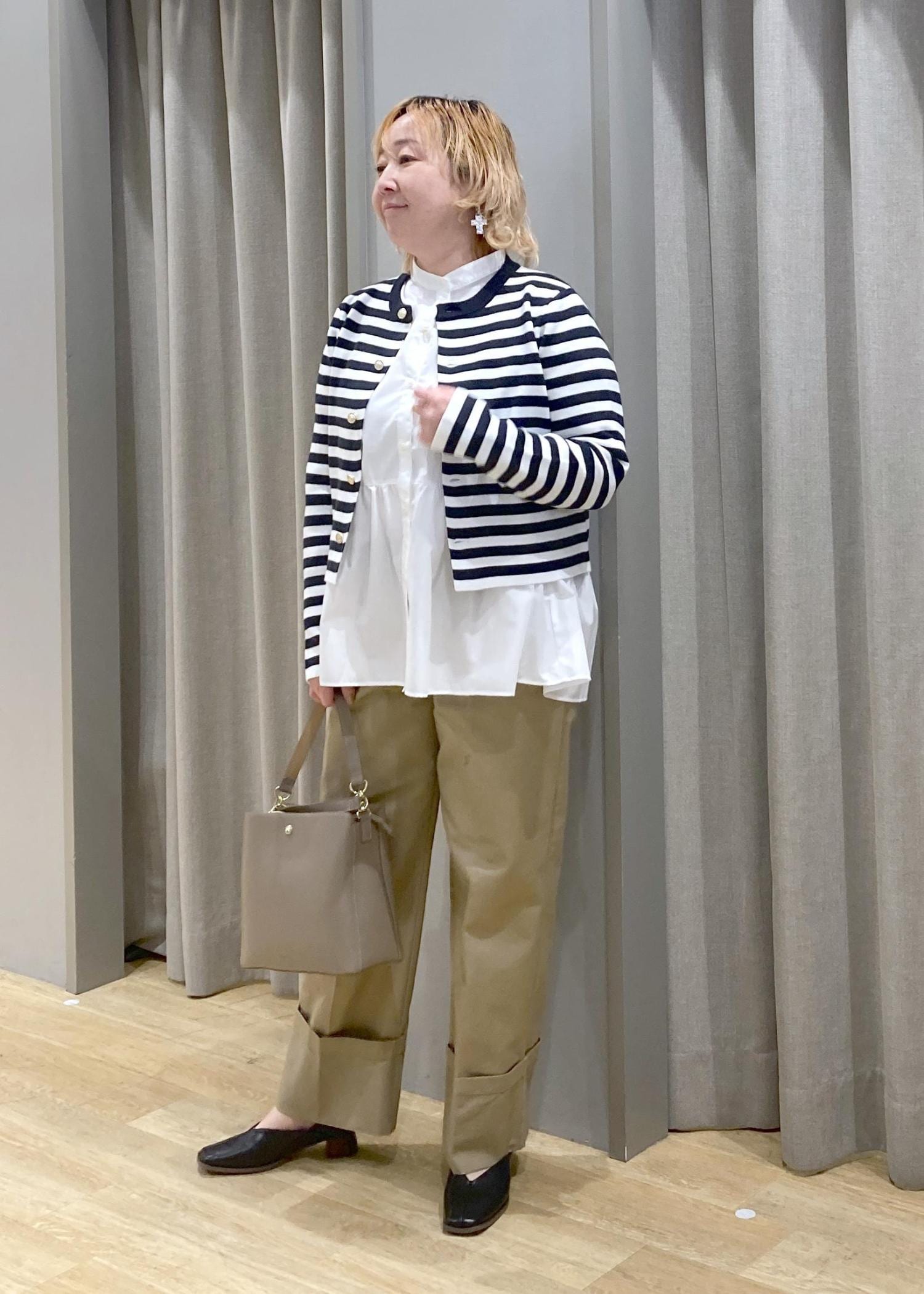でも、中のコーディネートは、春のトレンド『マリンコーデ』でまとめてみました。ベーシックなチノパンだと、カジュアル過ぎるので、大きめの折り返しが可愛くセンタープレスのきいたキレイ目チノパンで、お仕事でも使えそうなアイテムです。