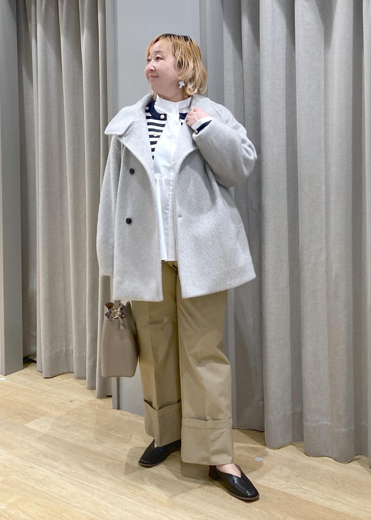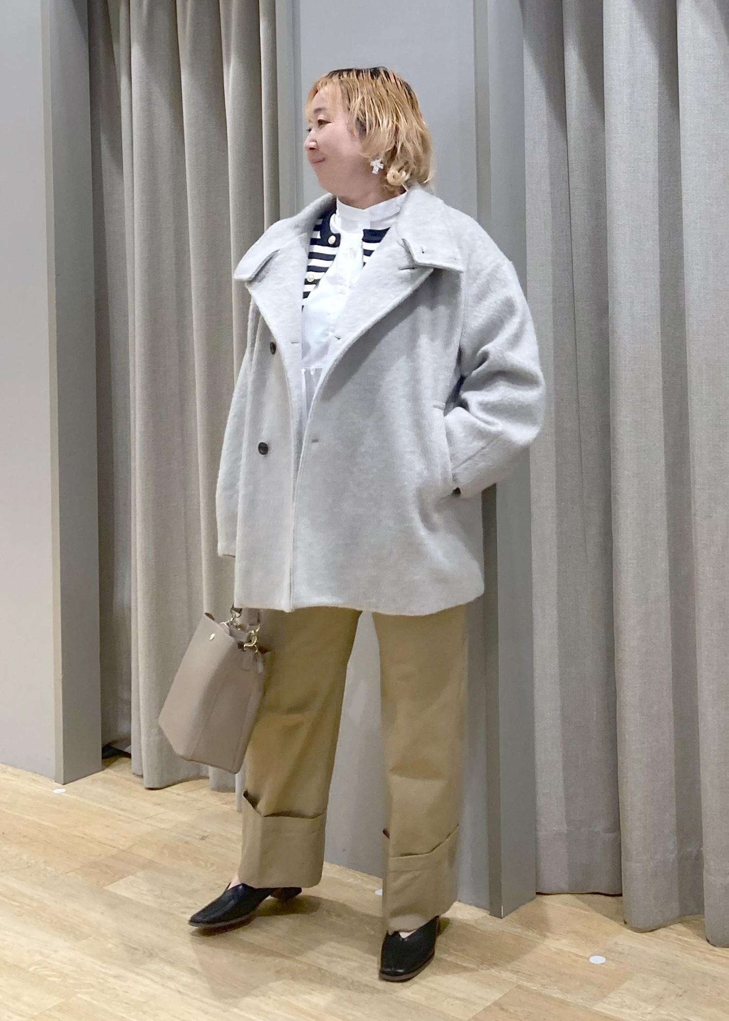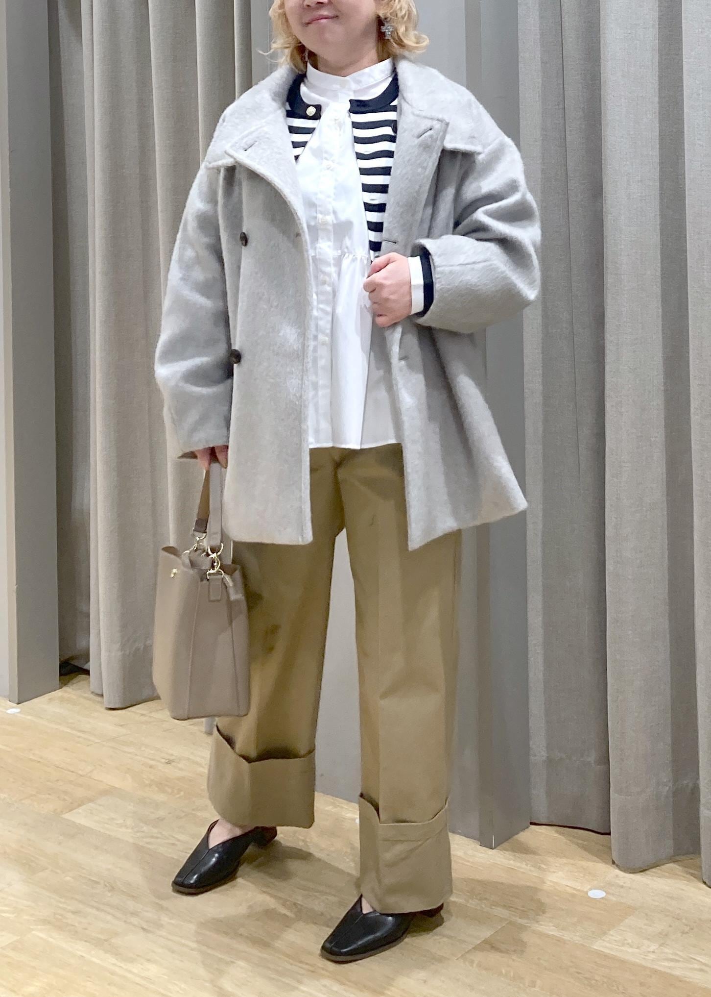 でも、中のコーディネートは、春のトレンド『マリンコーデ』でまとめてみました。ベーシックなチノパンだと、カジュアル過ぎるので、大きめの折り返しが可愛くセンタープレスのきいたキレイ目チノパンで、お仕事でも使えそうなアイテムです。