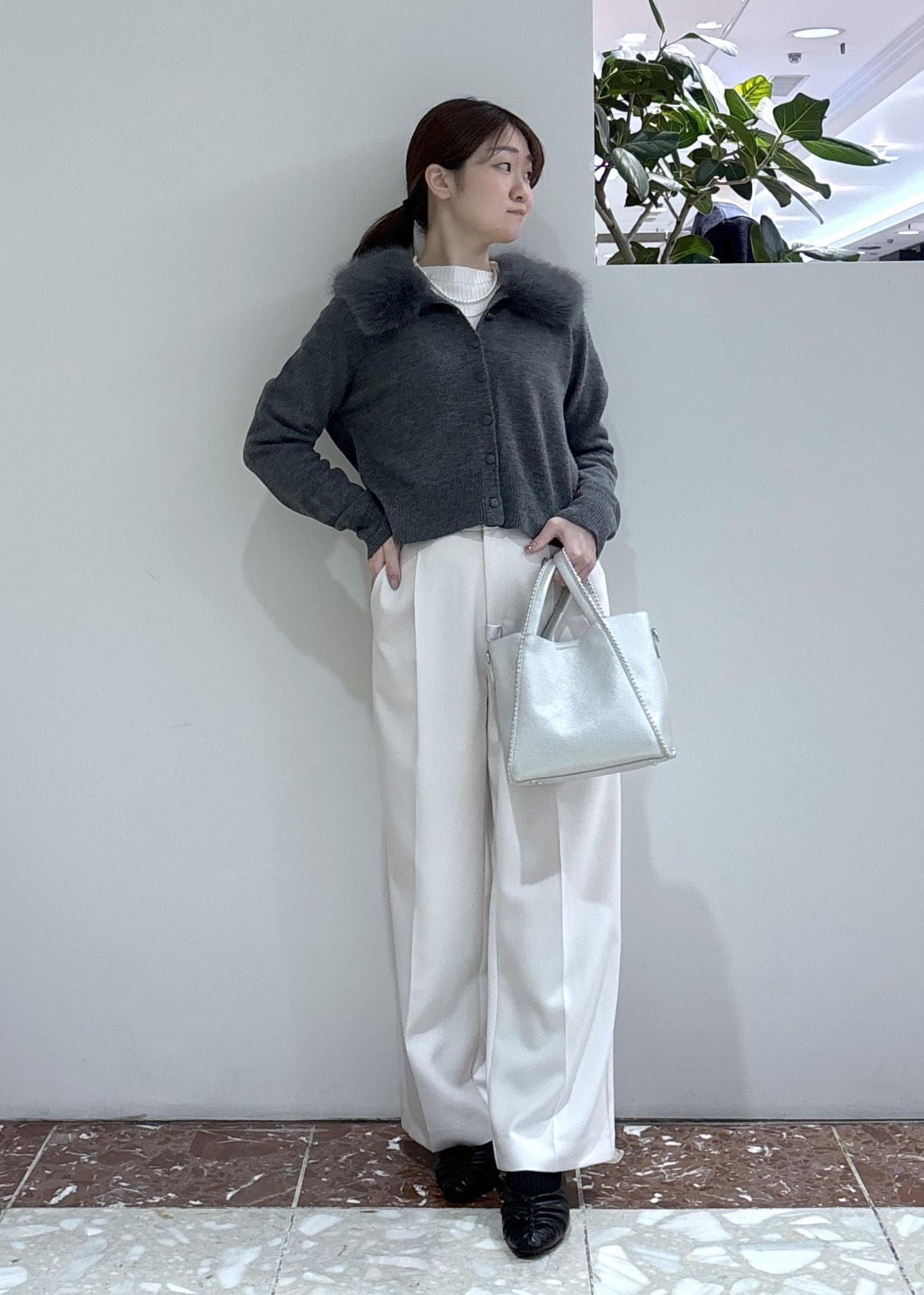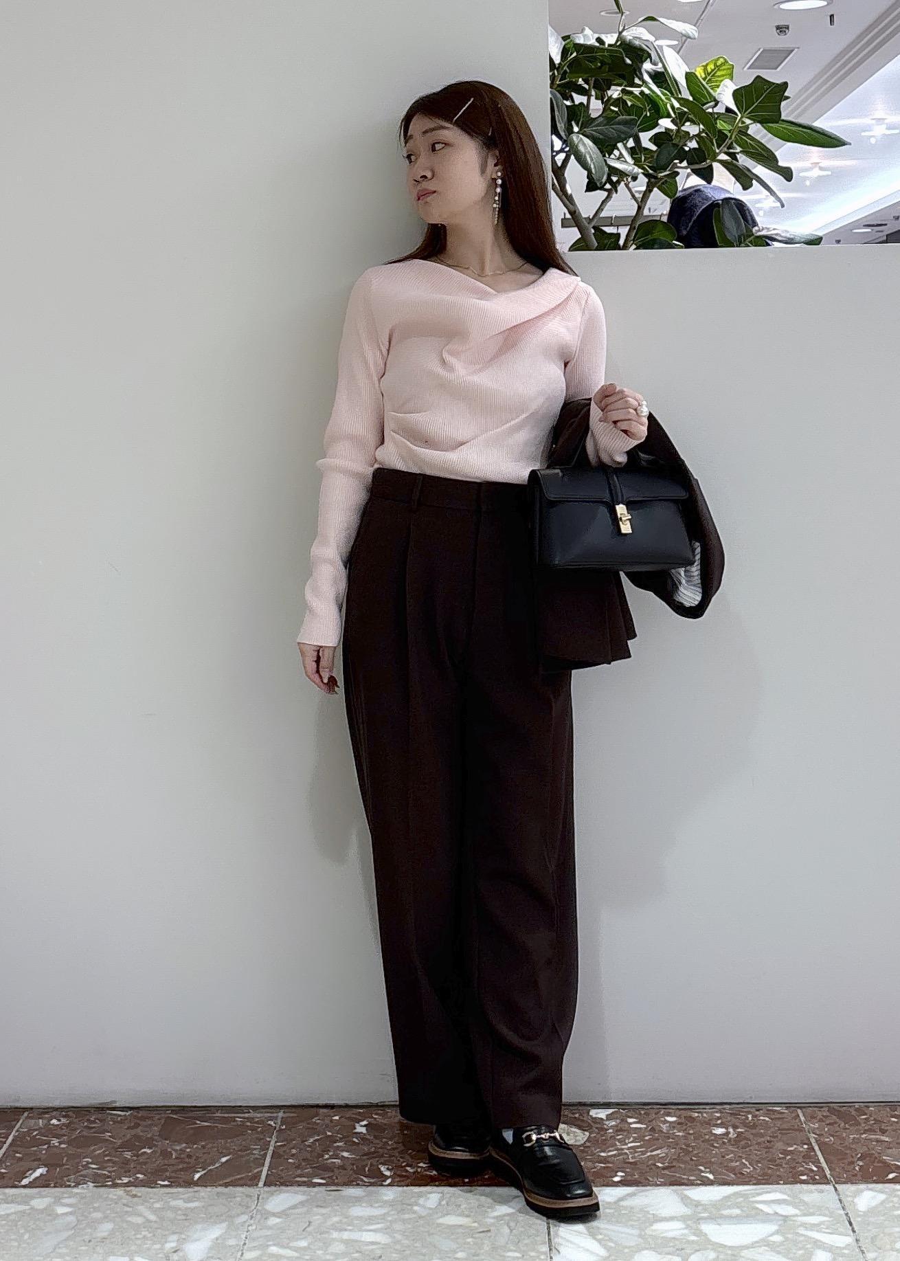 生地もそこまで厚すぎないので、ワイドパンツにインして着用していますが、アウトで着用しても腰にかかるくらいのスッキリした丈感です。