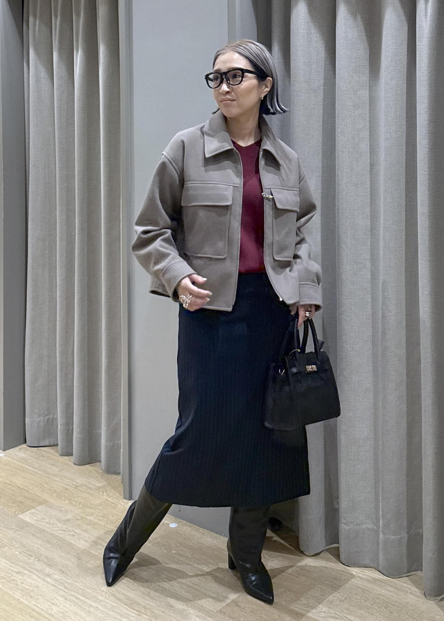 ペプラムのフリルデザインを活かせるタイトスカートのセットアップコーデにしました。
