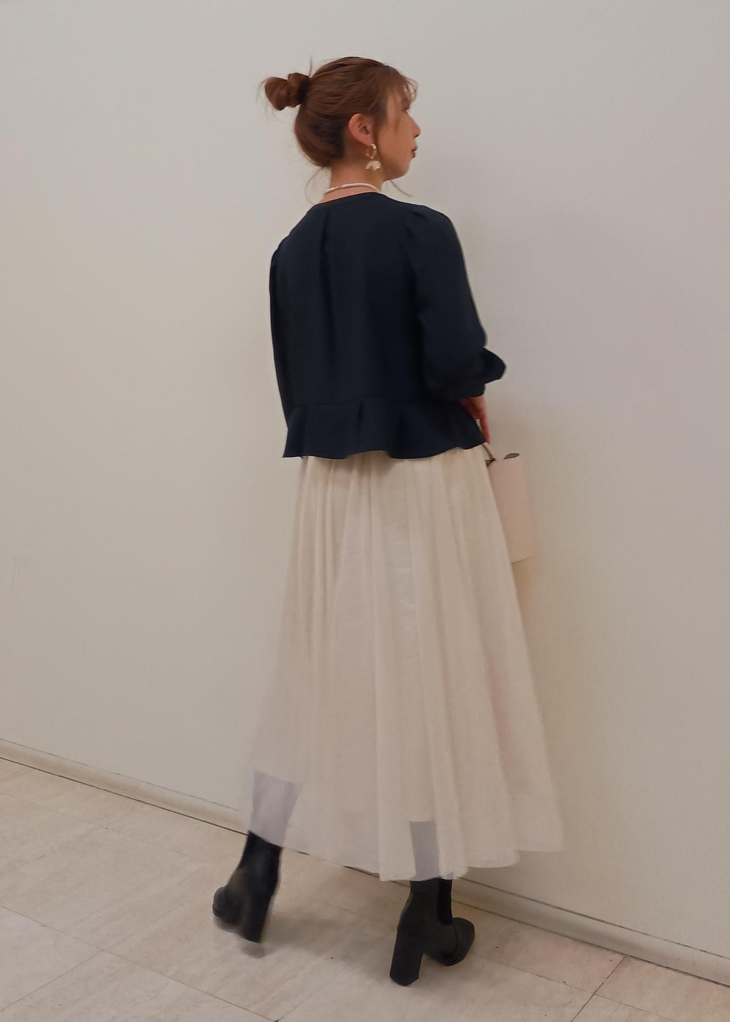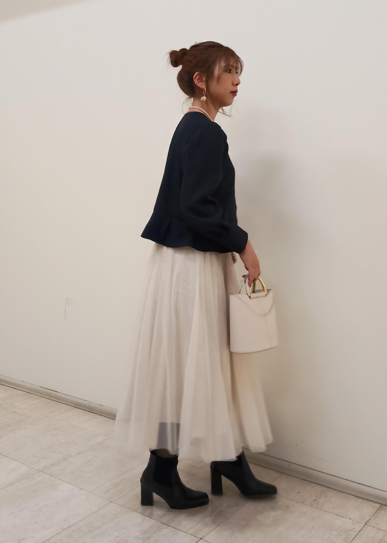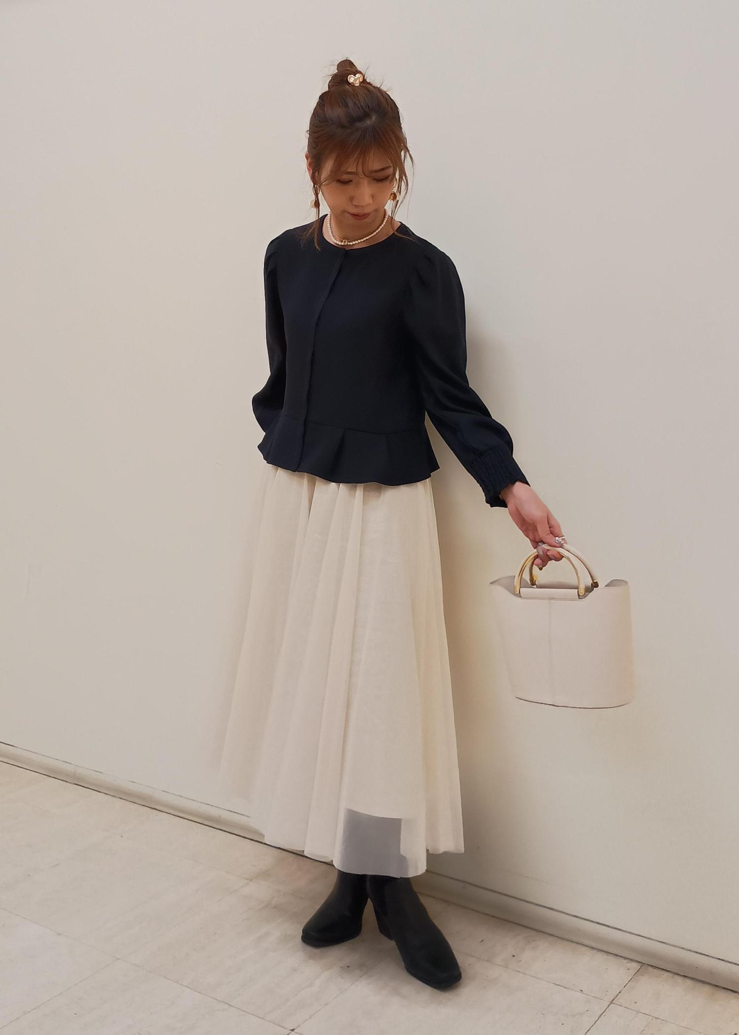 ブラウス×スカートでシンプルな着こなしながら華やかさやきちんと感のあるスタイリング。アクセサリーなどで飾ればセレモニーシーンでもお使いいただけます。