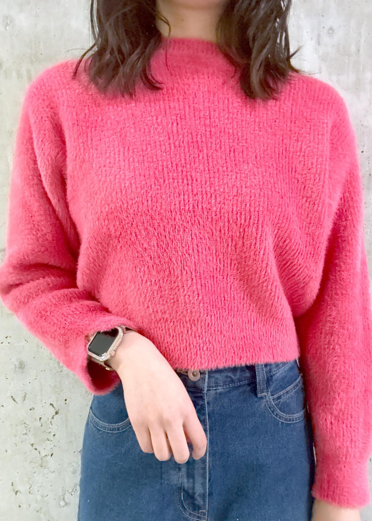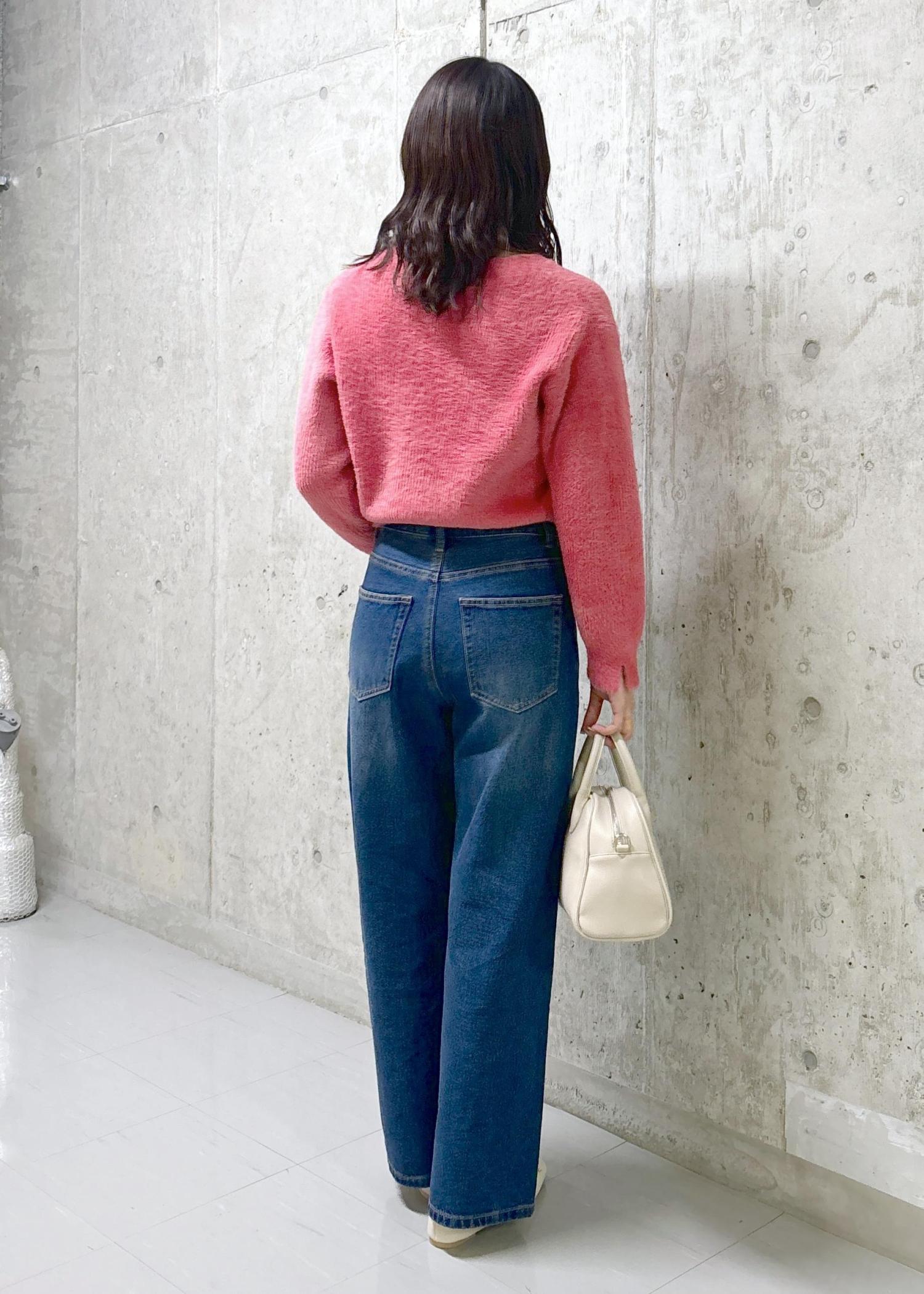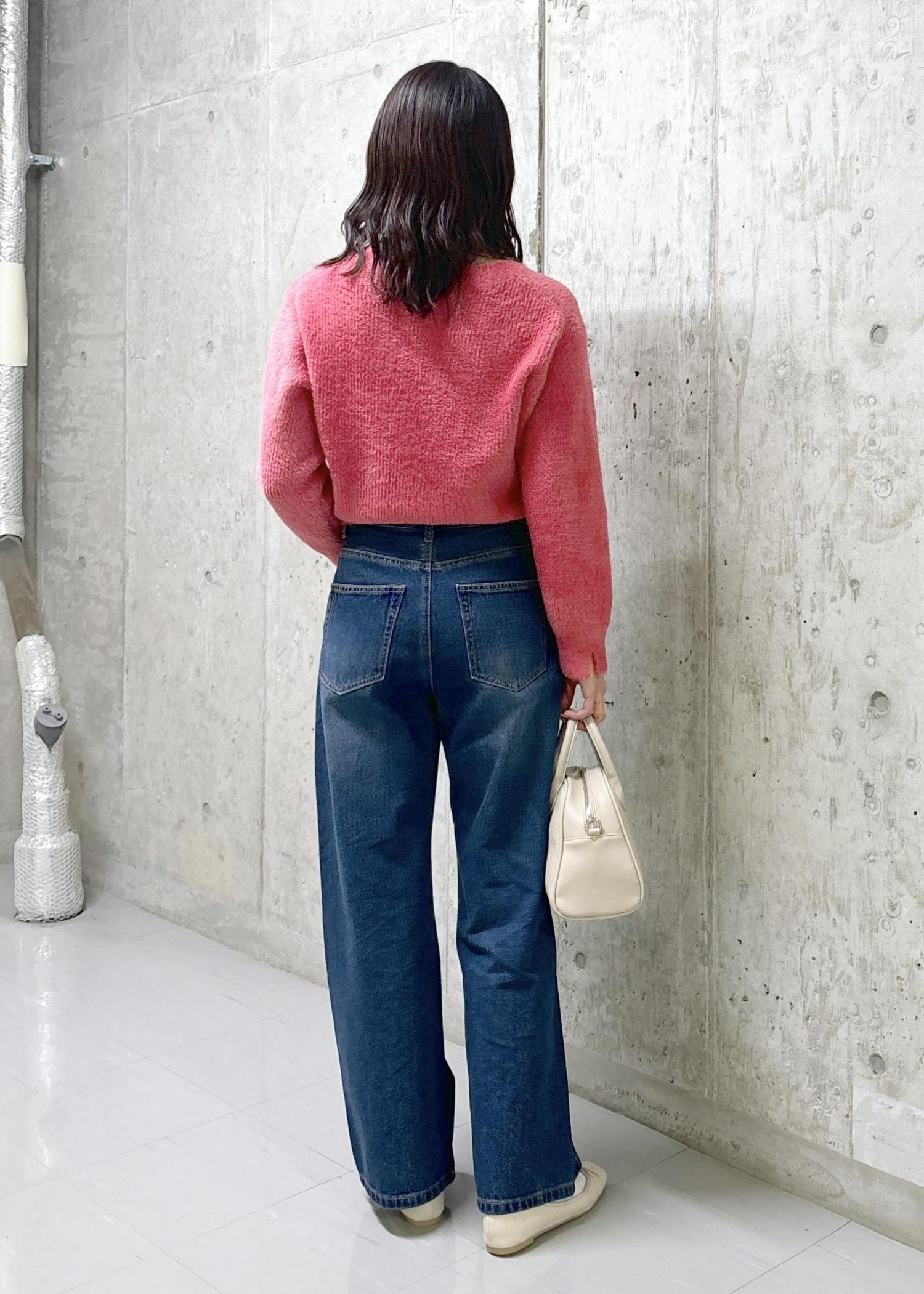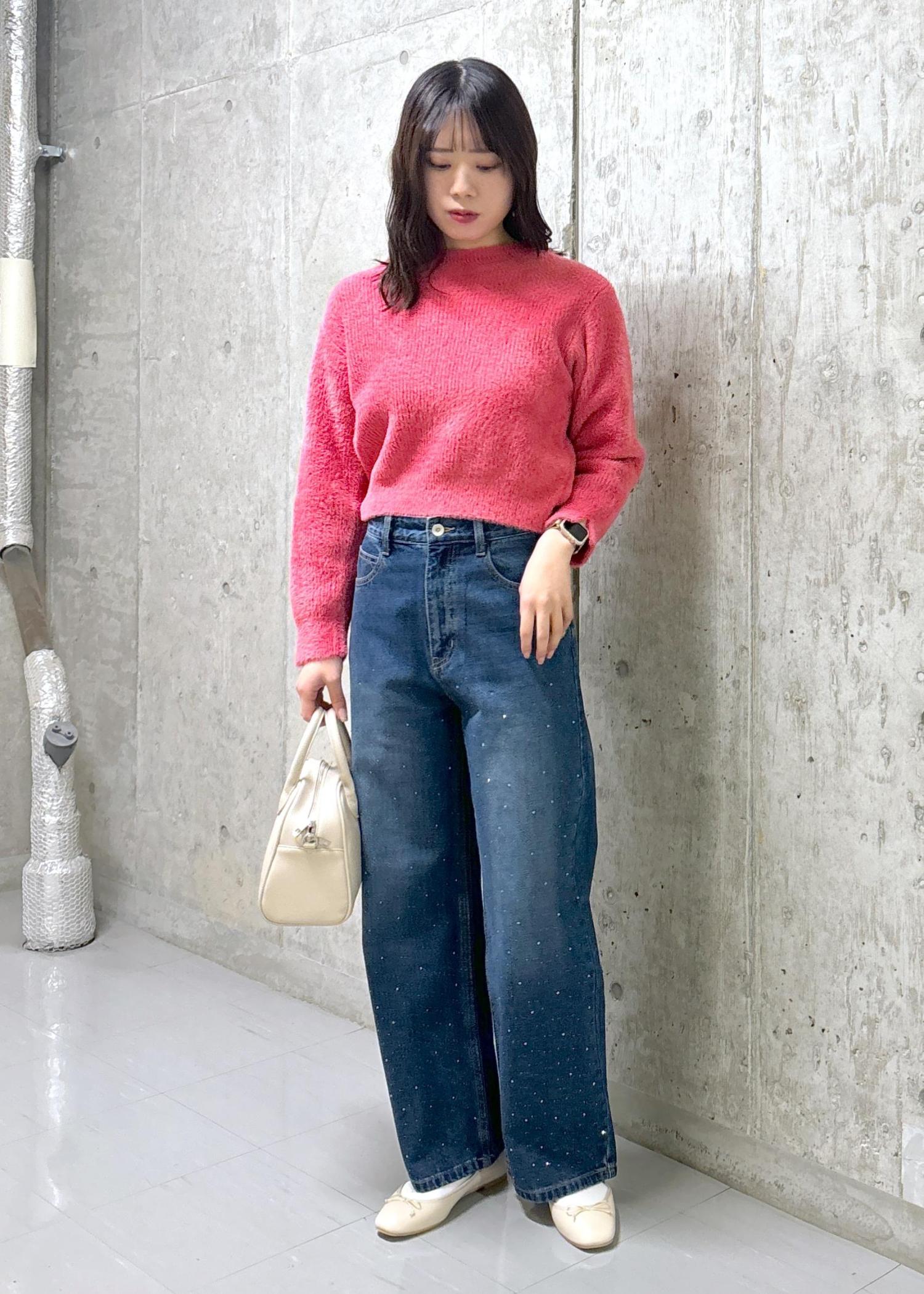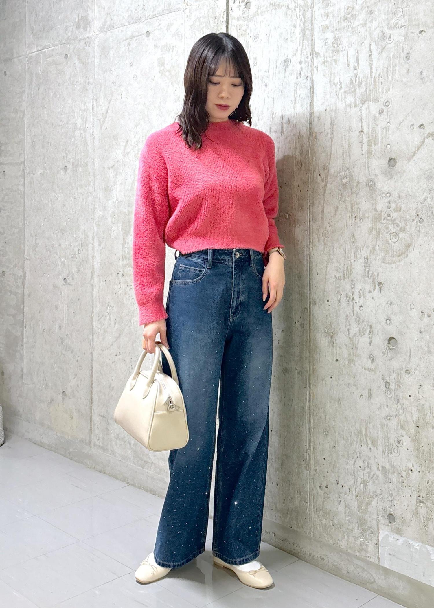 鮮やかなピンクのニットにキラキラビジューのついたデニムを合わせて春らしいコーディネートに仕上げました◎