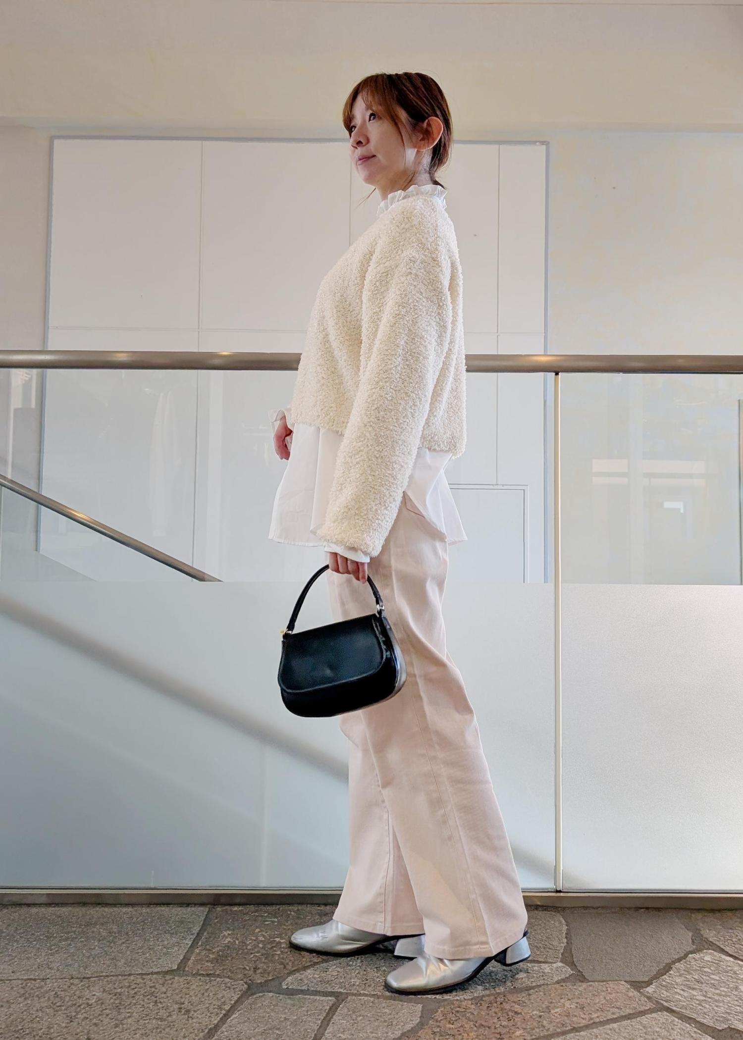 キラキラしたスパンコールがポイントのニットを、ペールトーンでまとめた春コーデ。