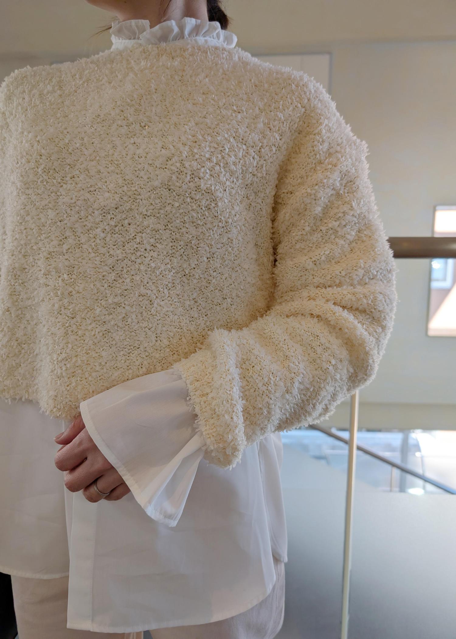スパンコールとリボンヤーンが、1枚で主役級な印象のニットです。