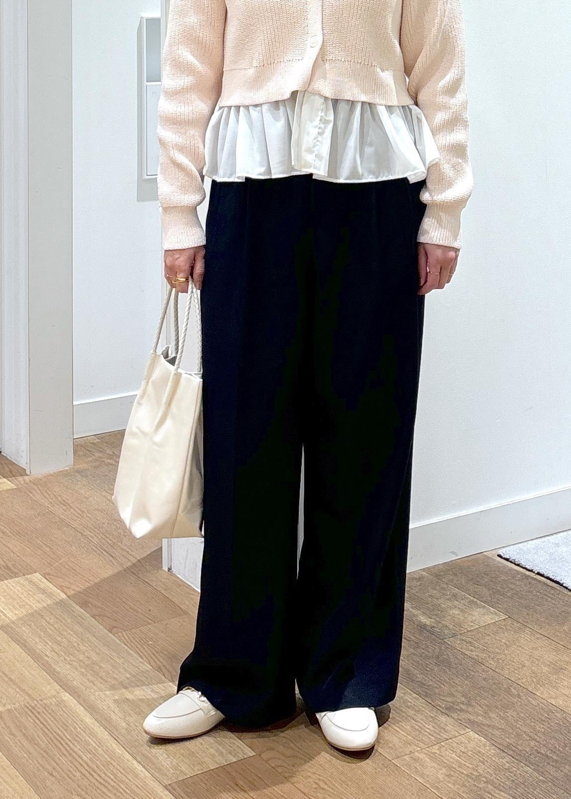 ボトムはネイビーのワイドパンツを合わせ、
