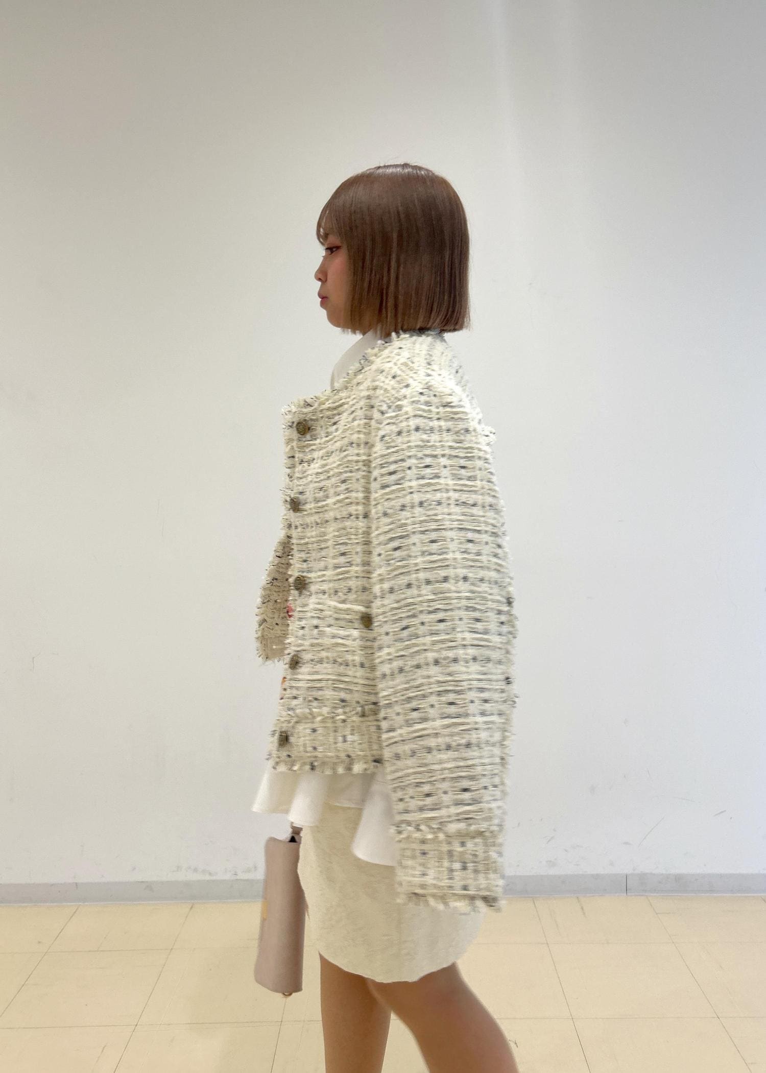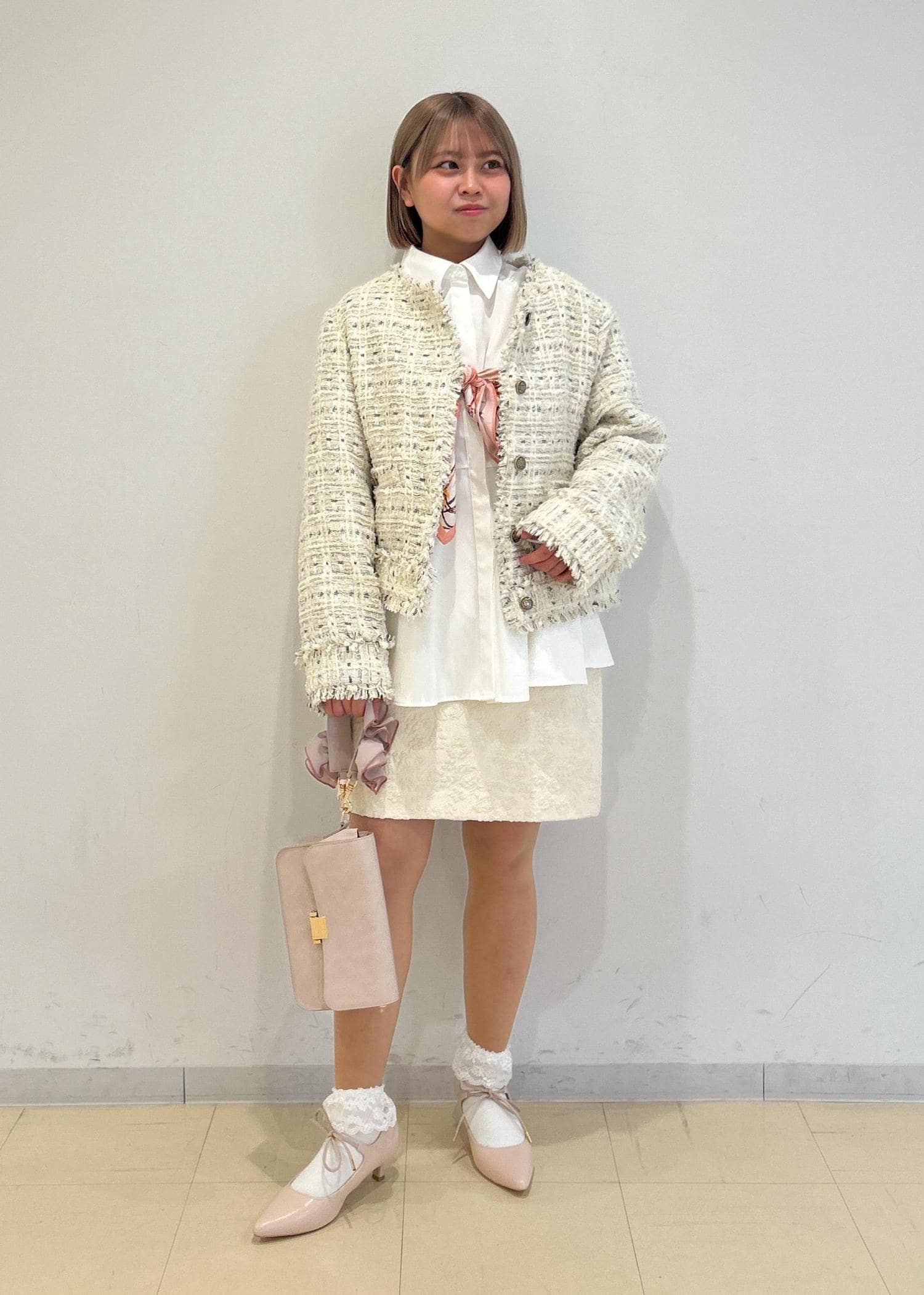 アウトレットVISツイードノーカラージャケットオフホワイト / F¥4,000レビューツイードは重たくなりがちですが、骨盤にかかるくらいの丈感なのでスッキリして見えました◎