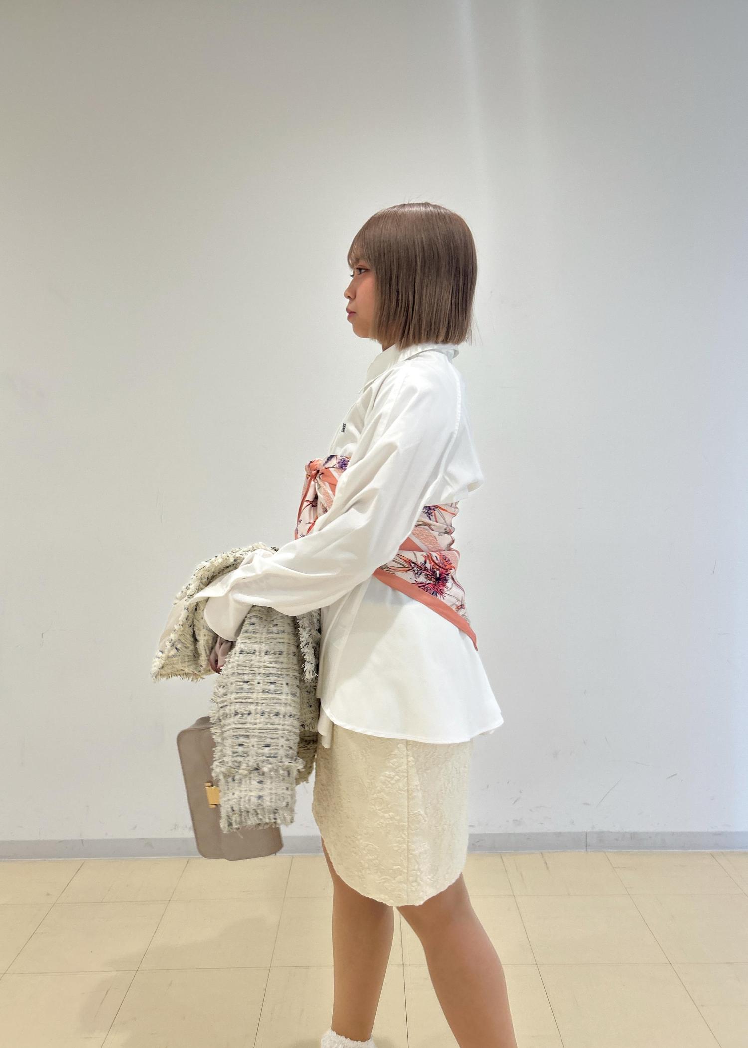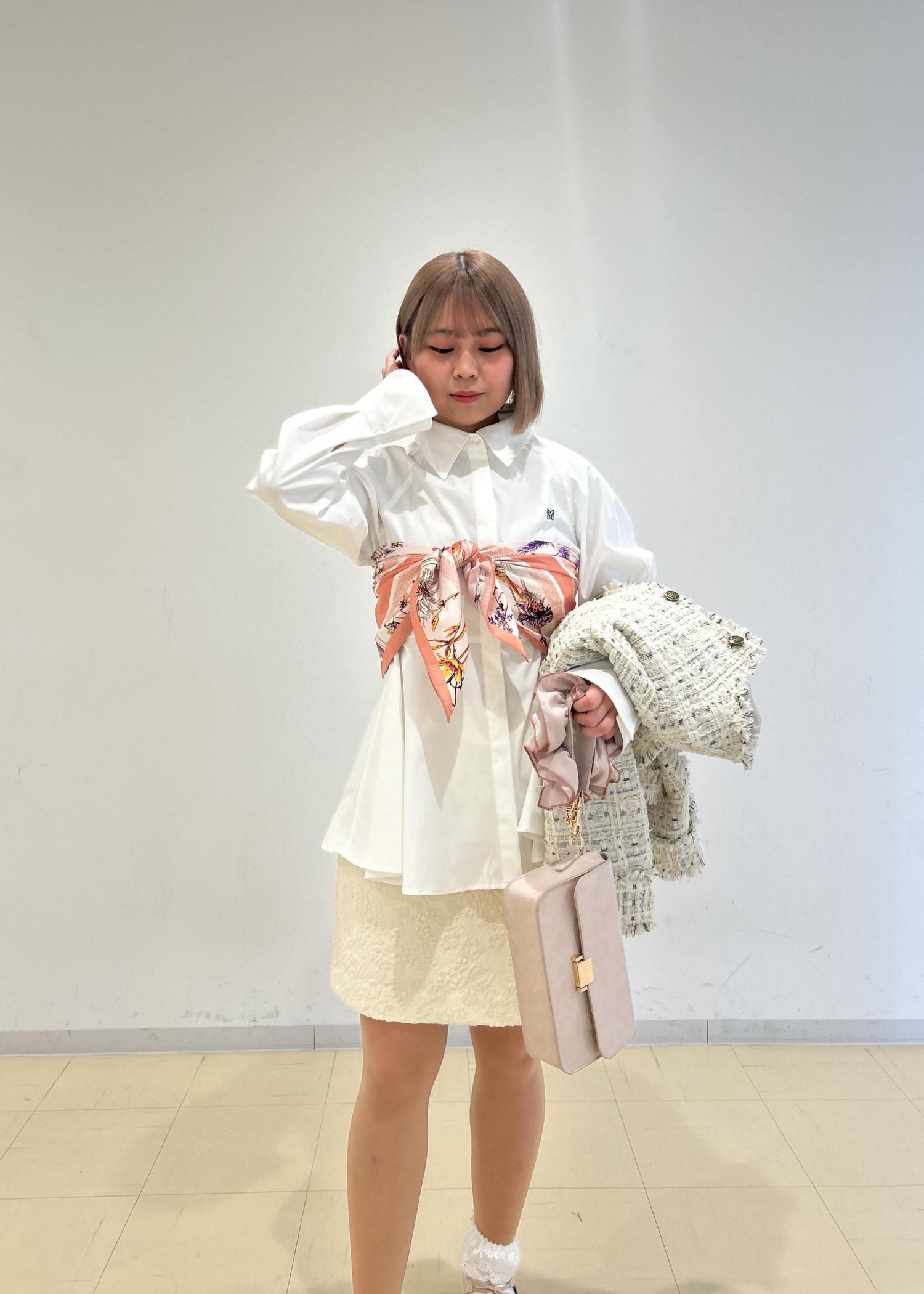 柔らかいホワイトのワントーンで統一し、小物も柔らかいピンクでまとめ可愛らしいコーディネートにしました♪