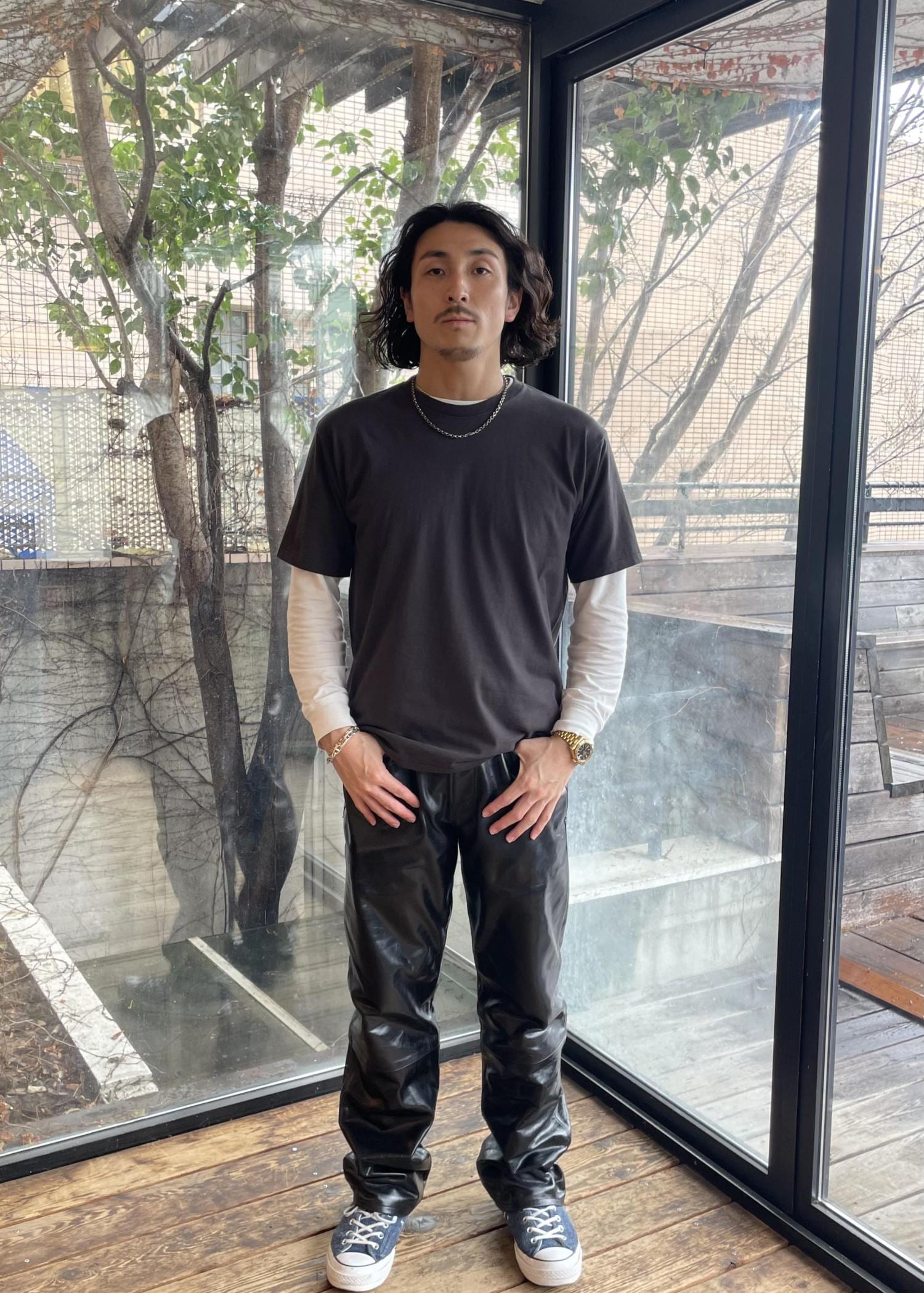 革ジャンと青シャツ