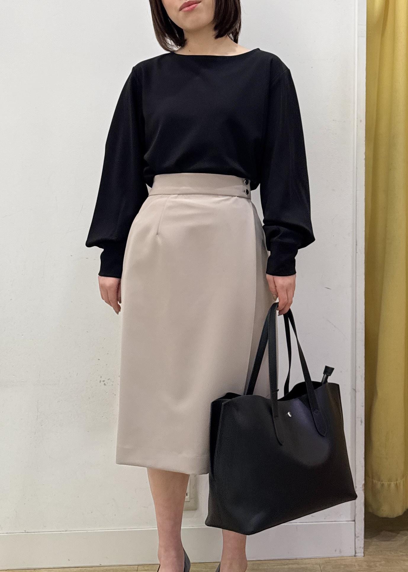 タイトめなシルエットですが、ラップ風のデザインになっていて、裾にかけて緩やかなフレアシルエットになっているのでスッキリ感を残しつつラクに穿いて頂けます。 -