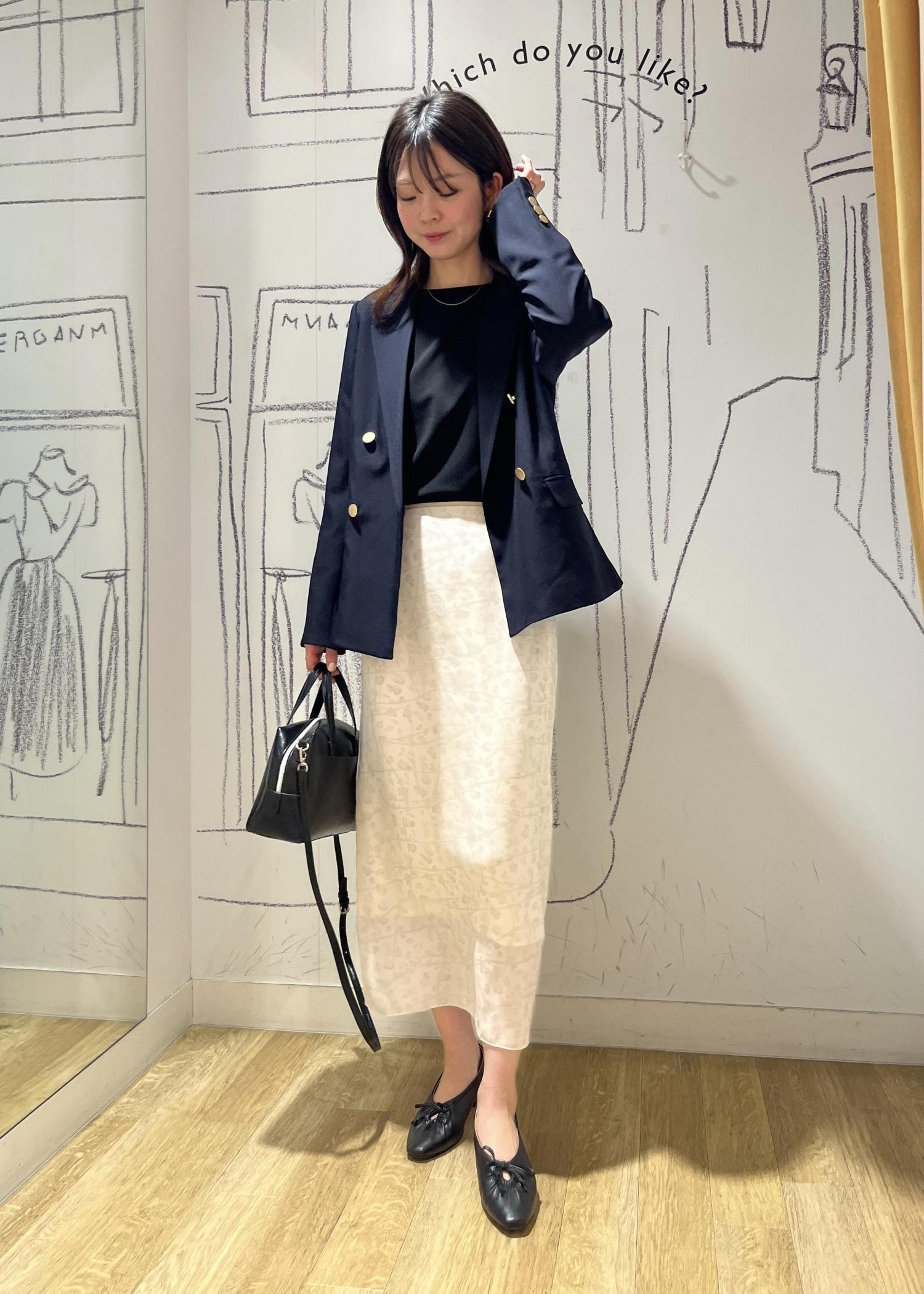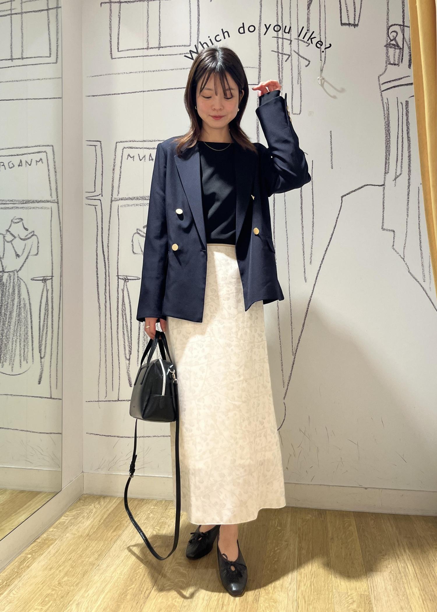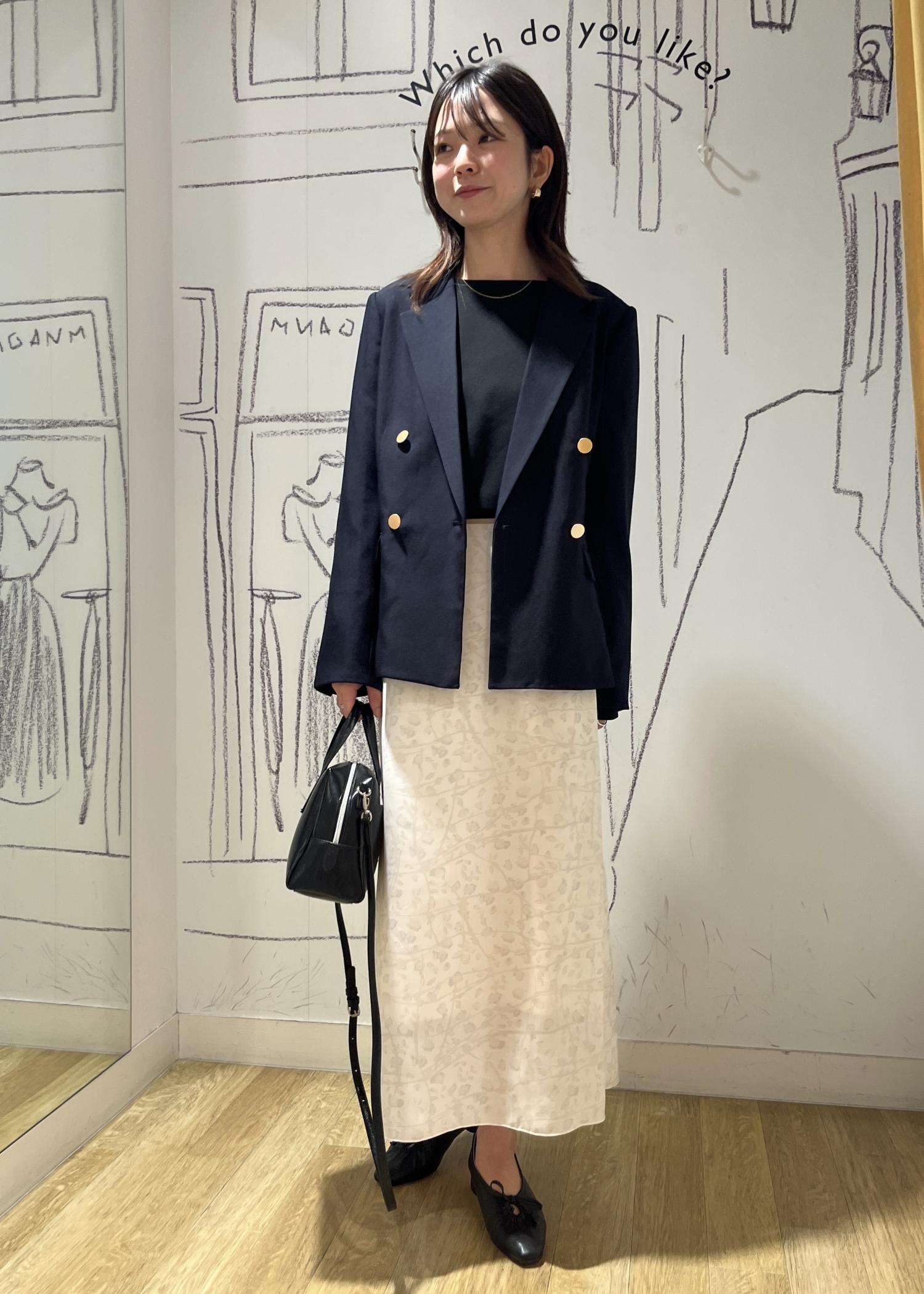 万能な金ボタンジャケットで、綺麗めなスタイリングにいたしました。