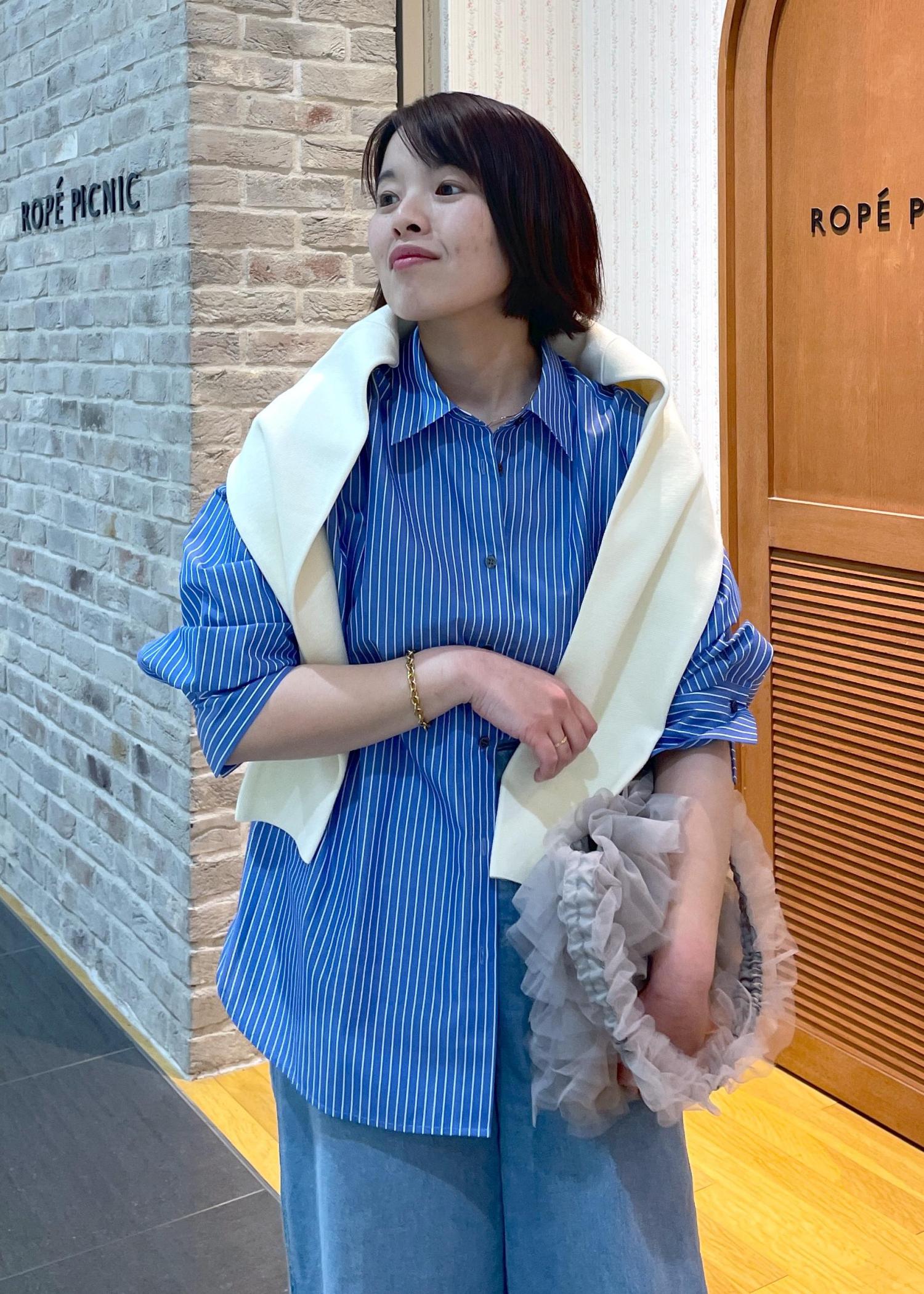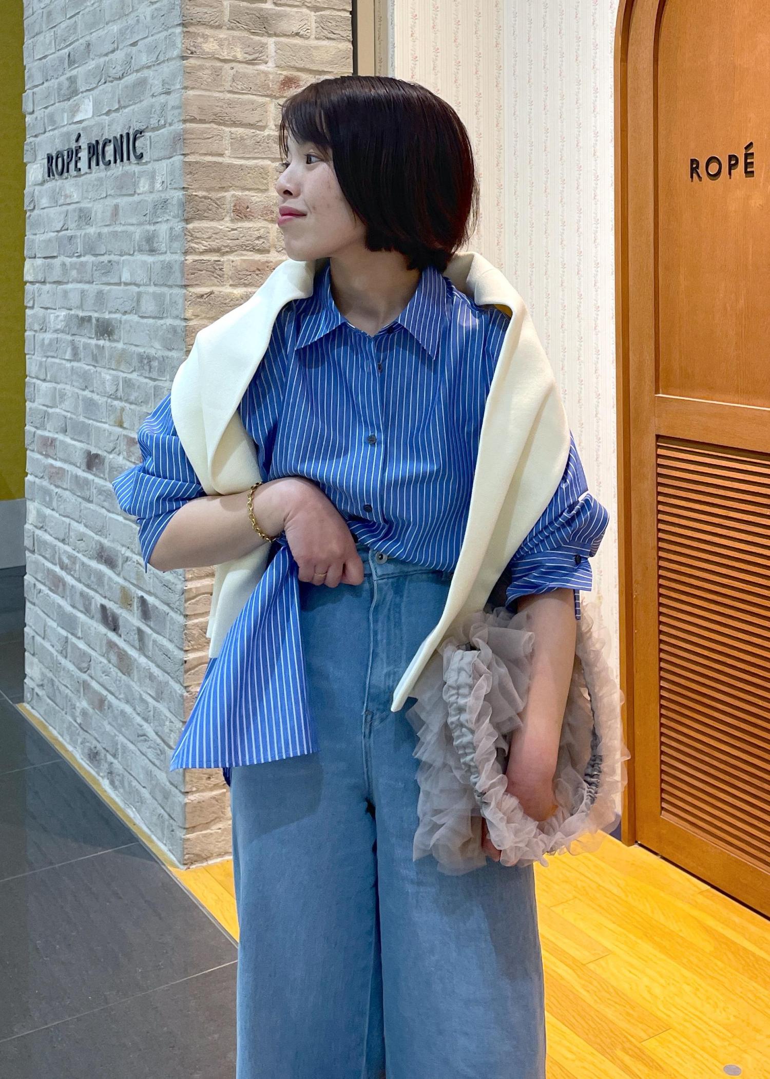 ブルーのストライプシャツにワイドデニムを合わせた、爽やかなカジュアルスタイルです!