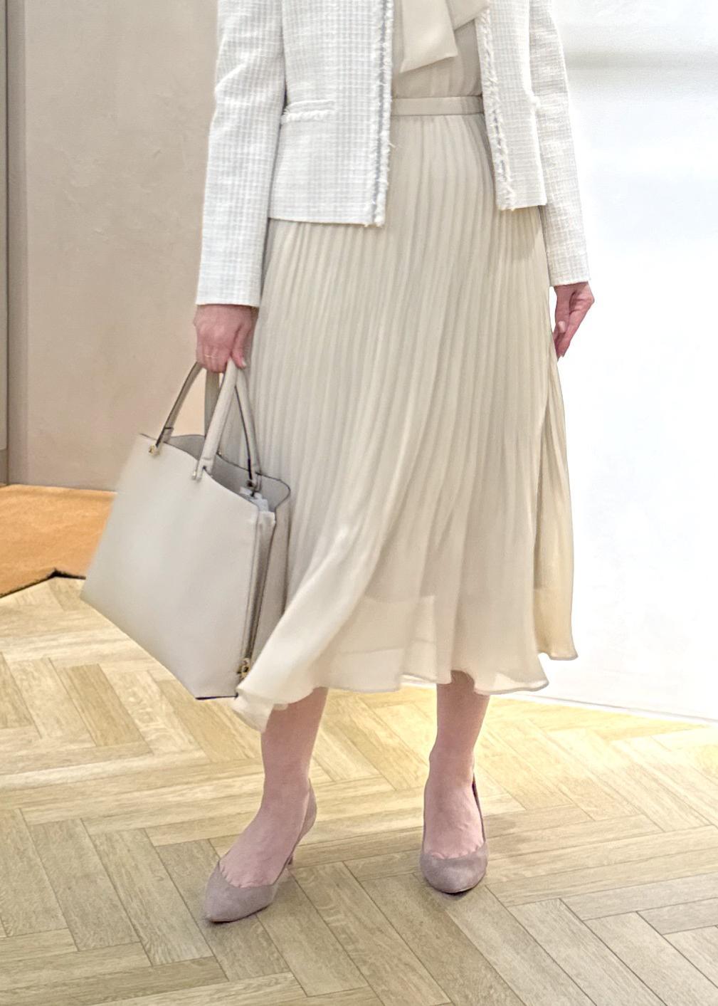 明るいカラーのワンピースにツイードジャケットを合わせた入園、入学などハレの日にオススメなスタイルです。