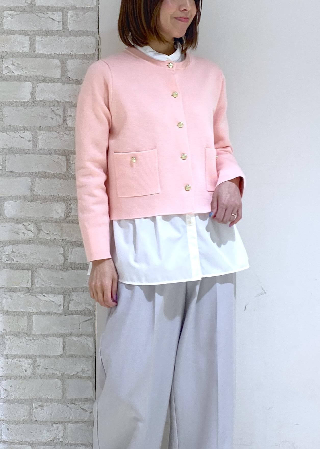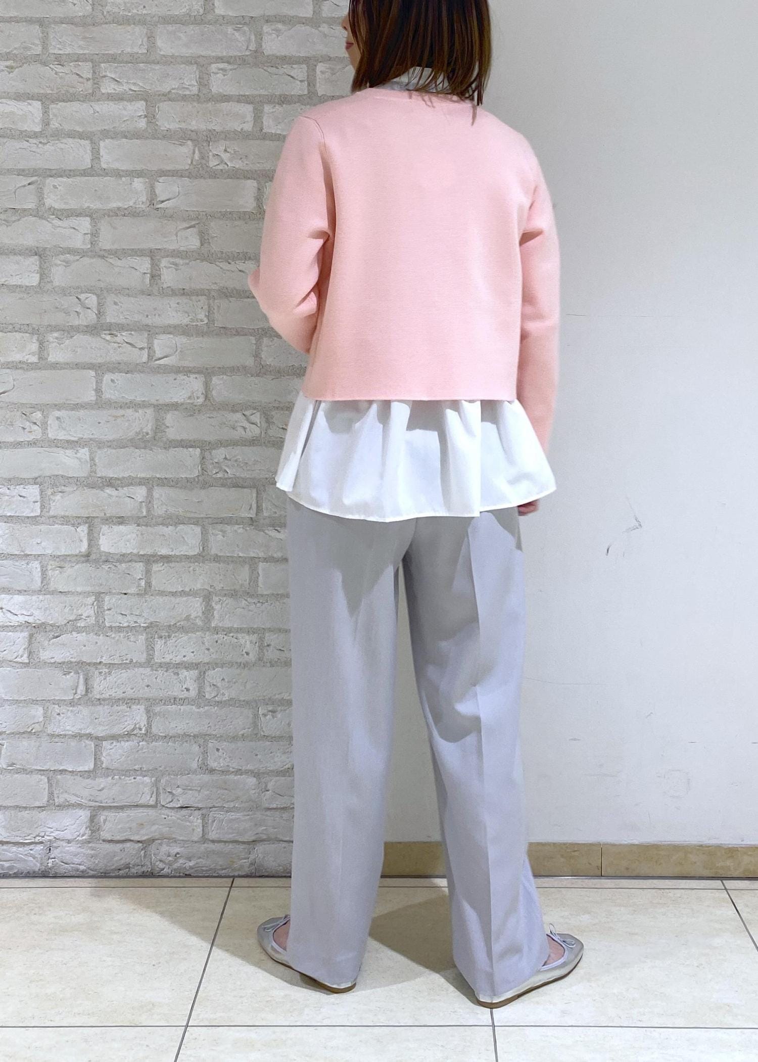 春らしいピンク色のカーディガンを合わせて