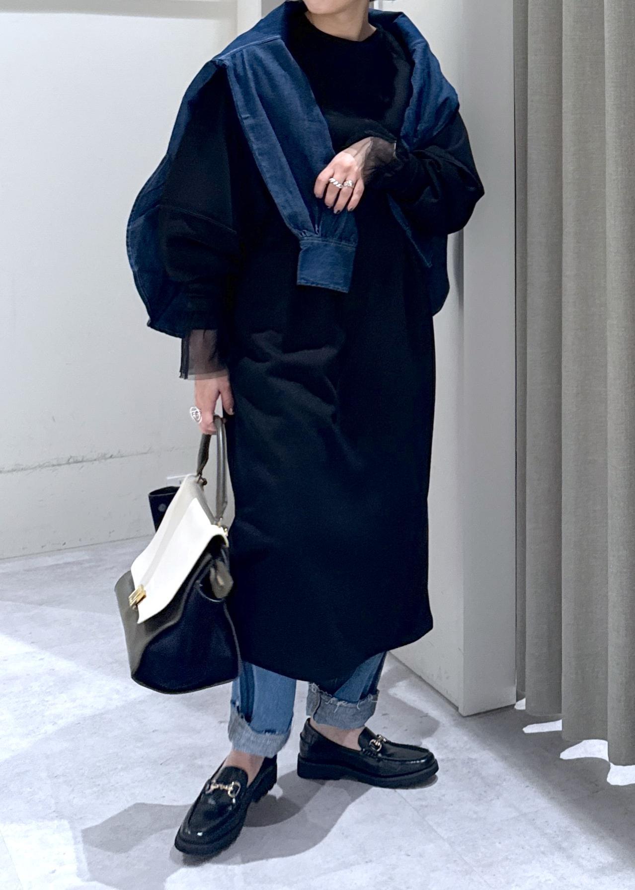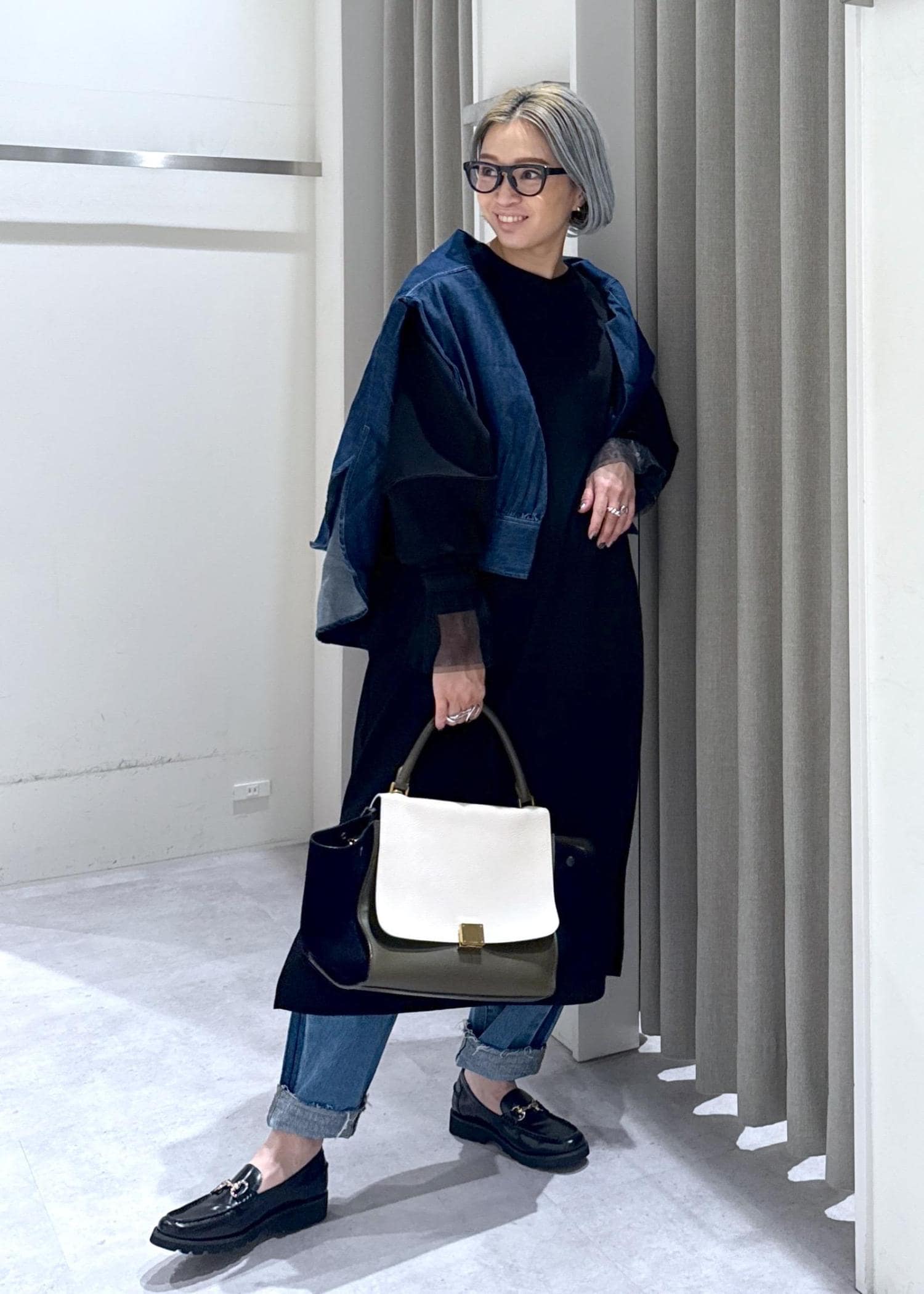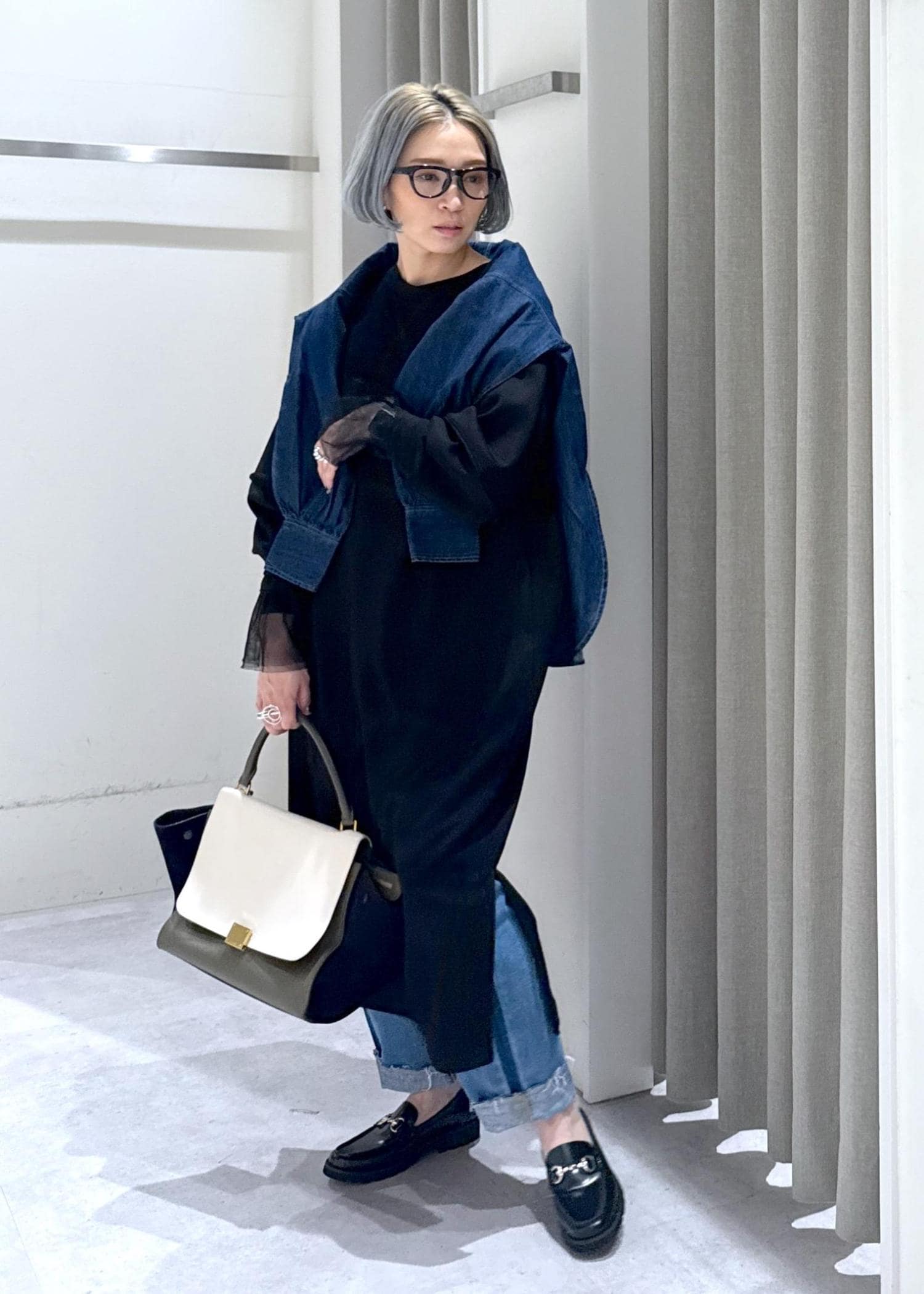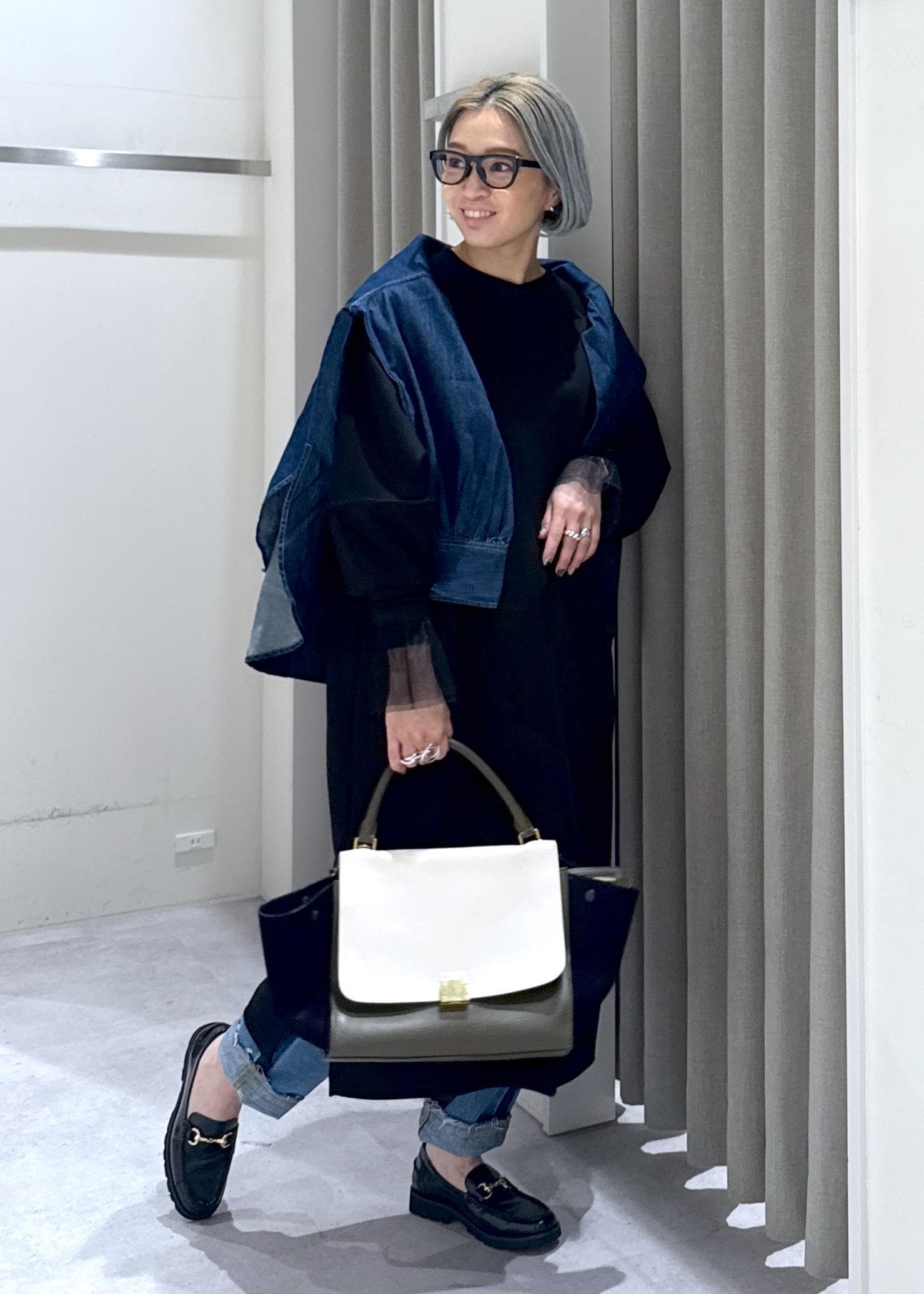 足元と肩掛けをデニムで合わせて、ワンピースを使った大人のレイヤーもコーデにしてみました!