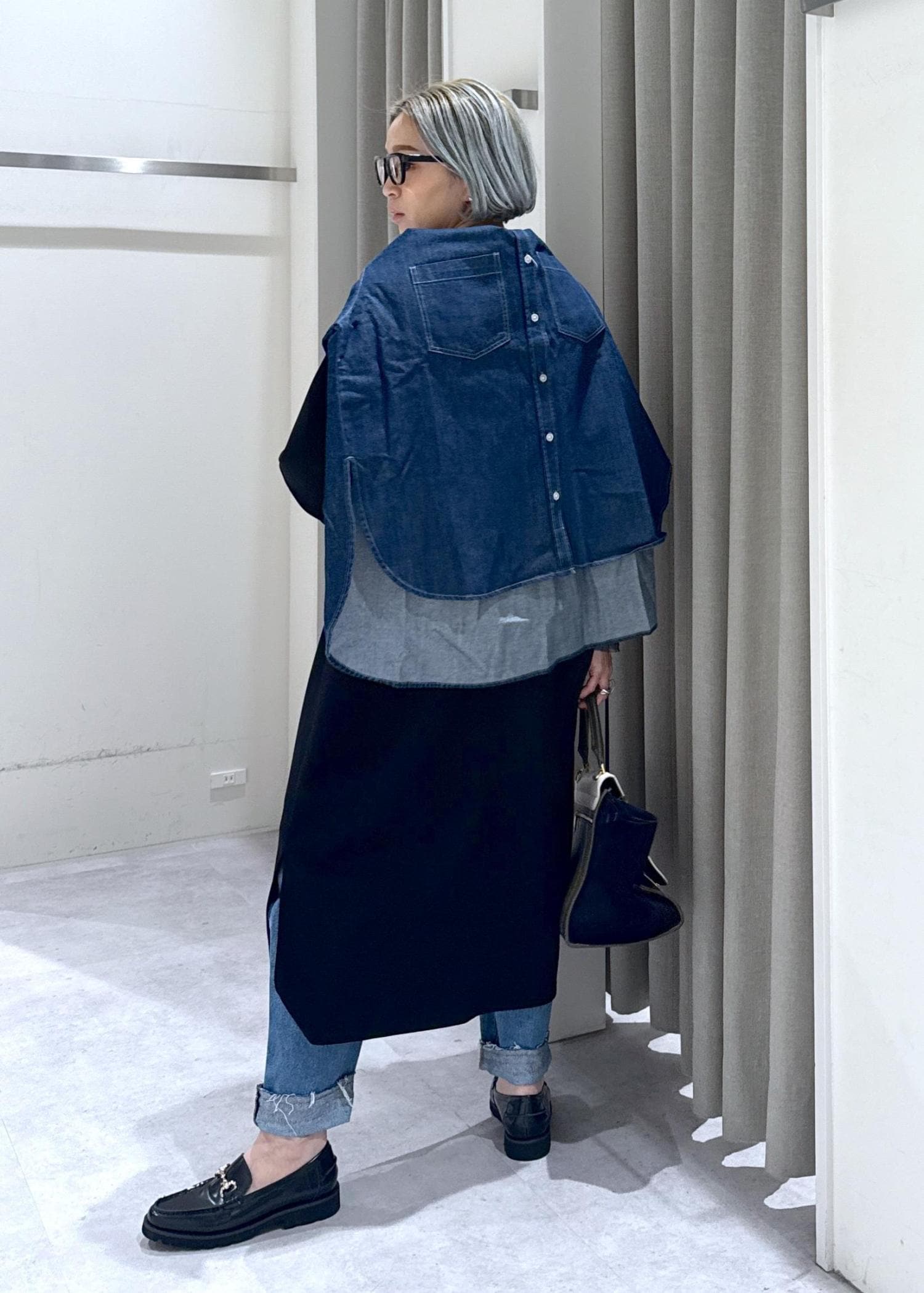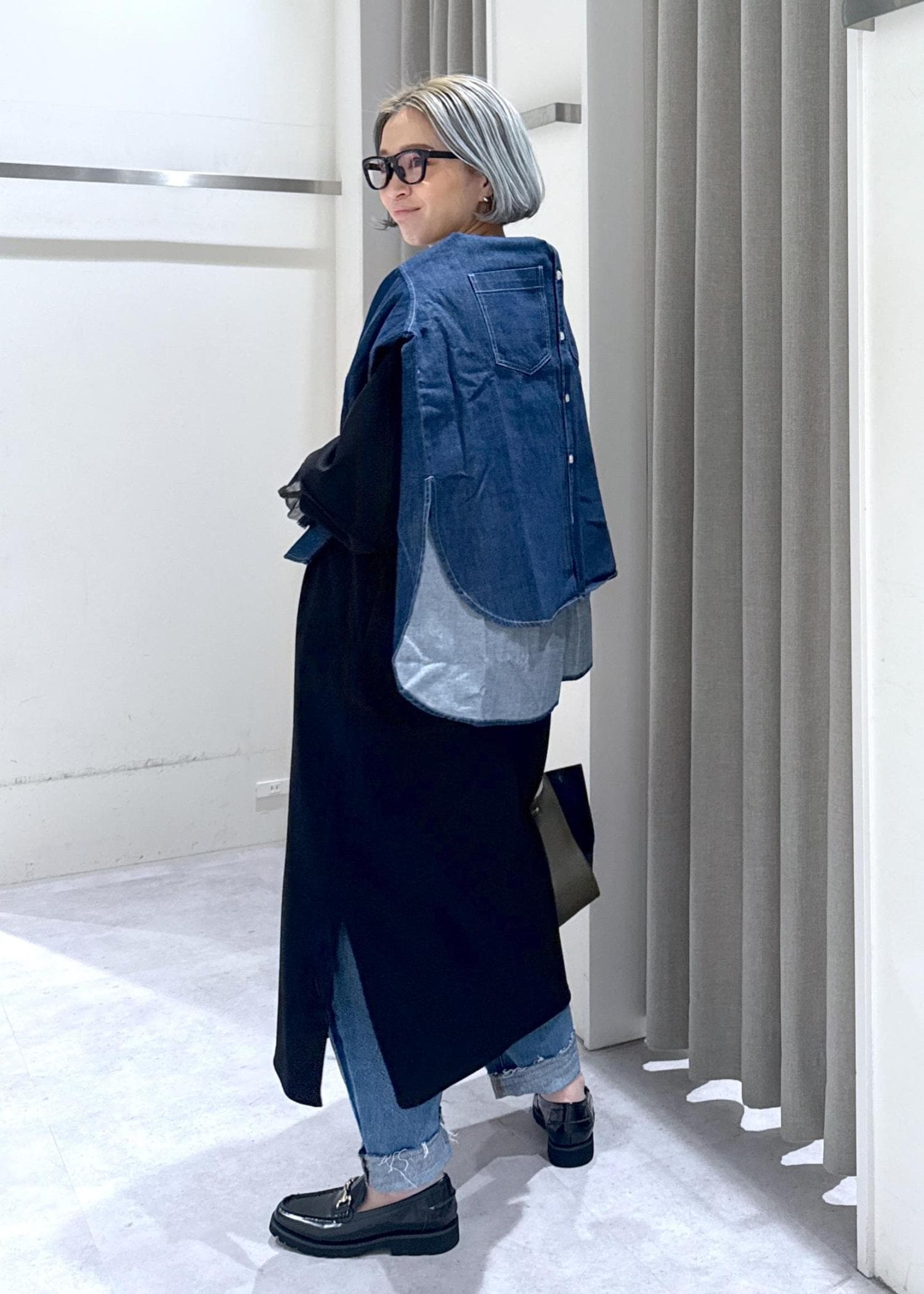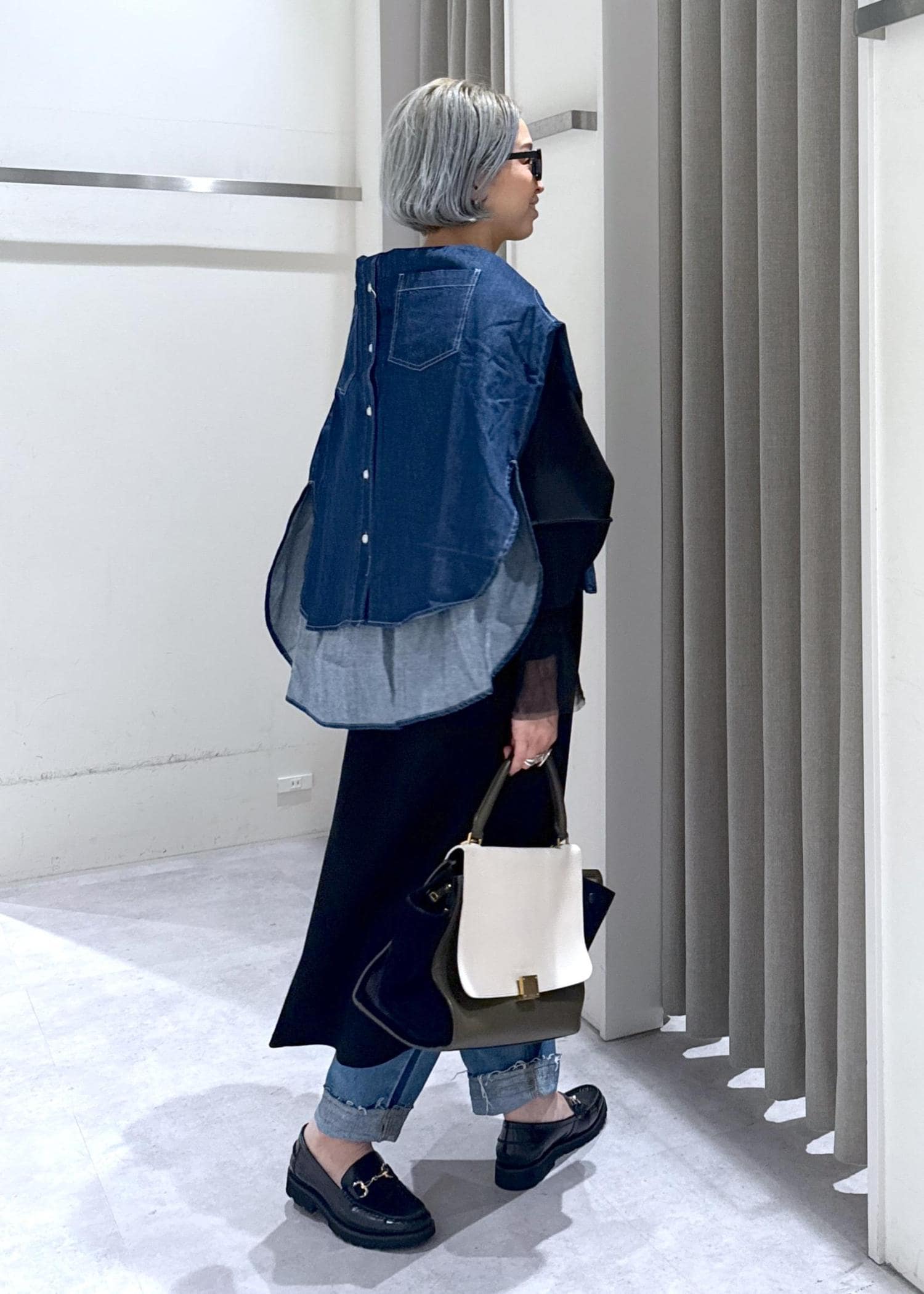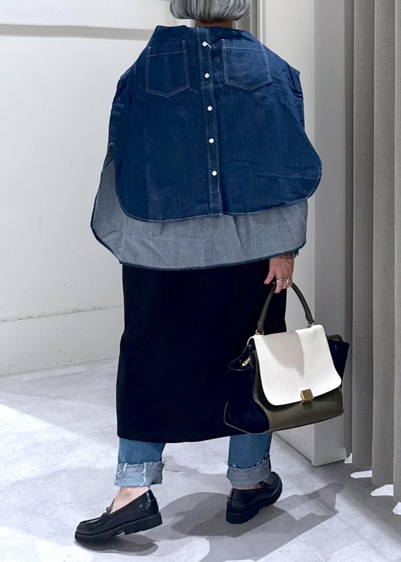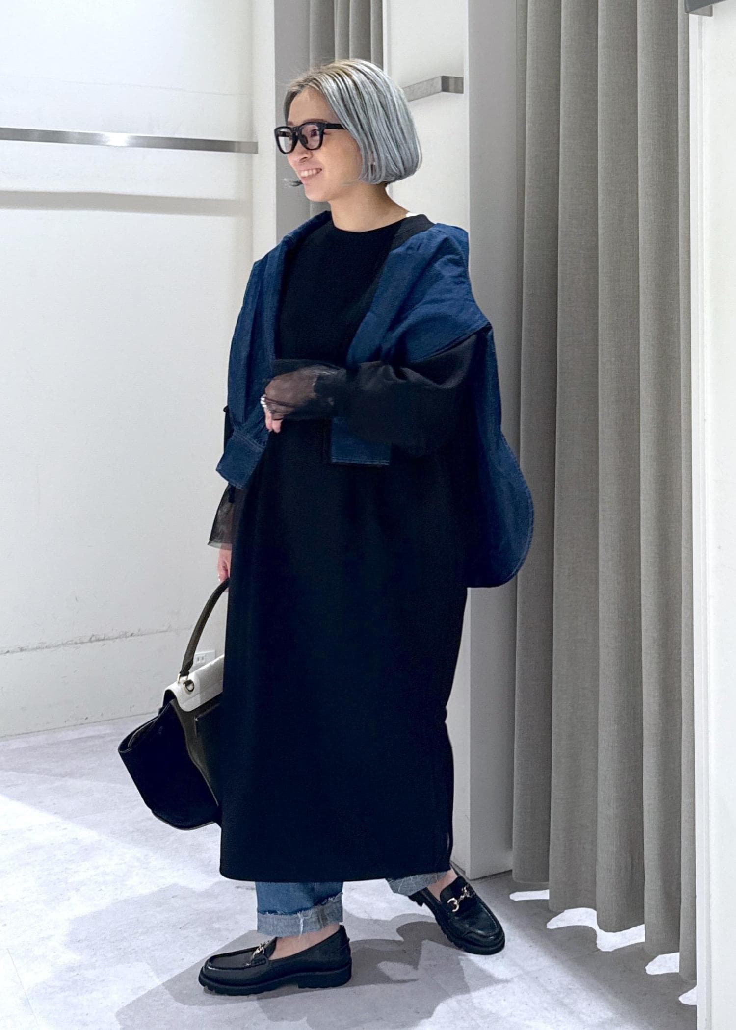 足元と肩掛けをデニムで合わせて、ワンピースを使った大人のレイヤーもコーデにしてみました!
