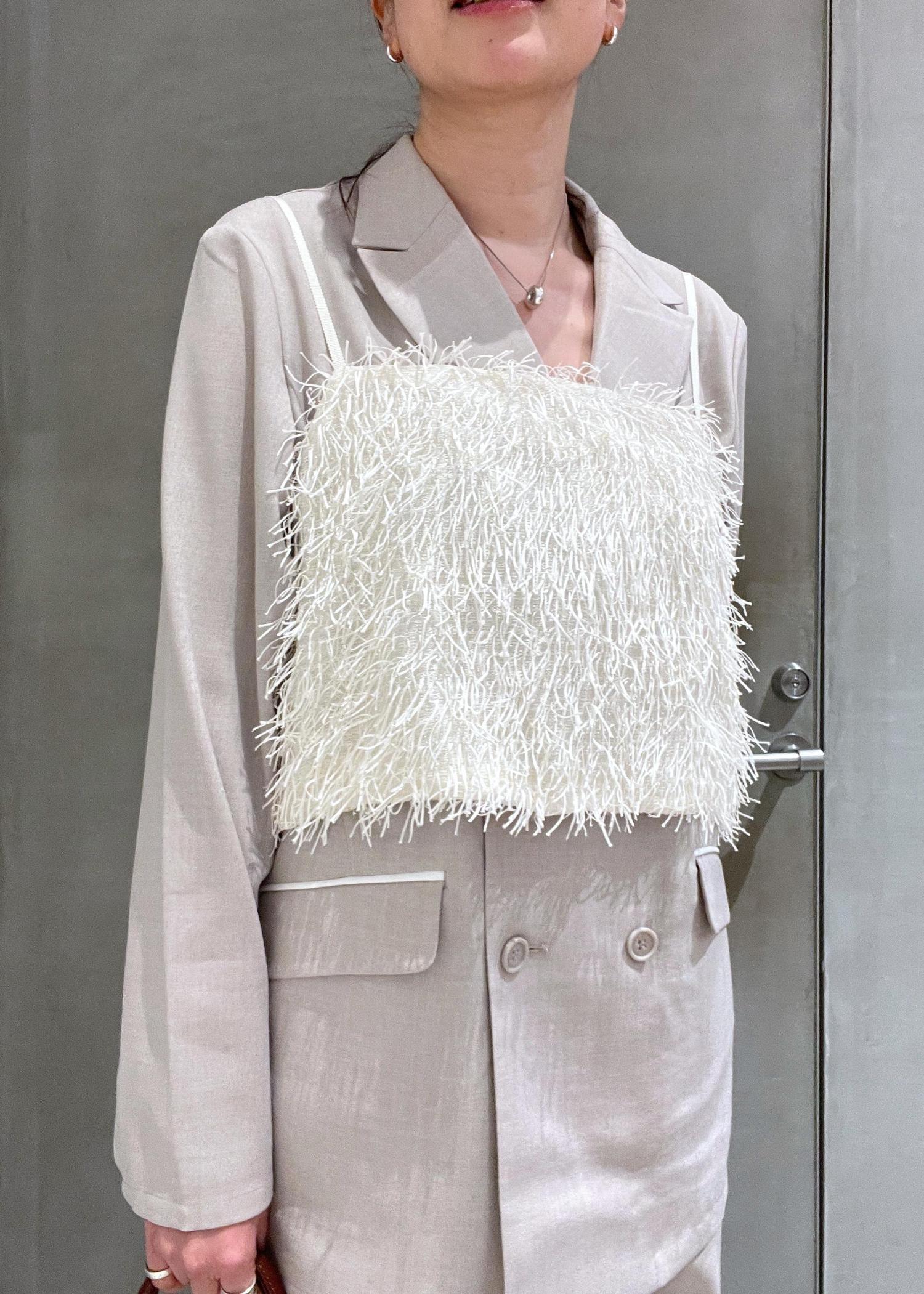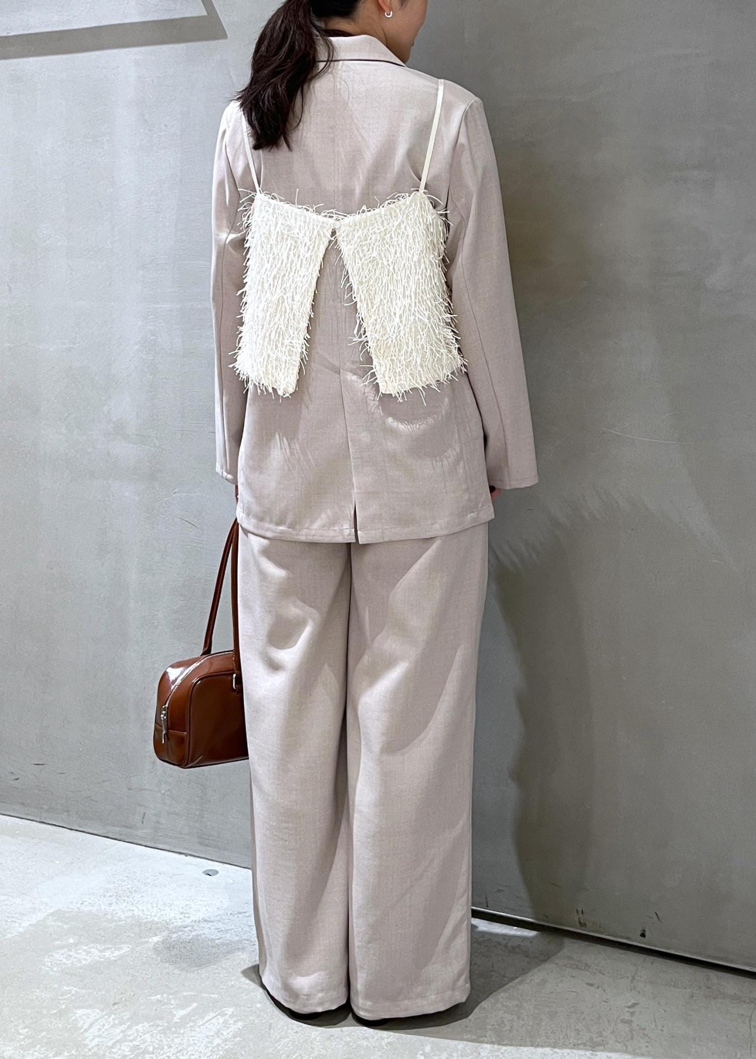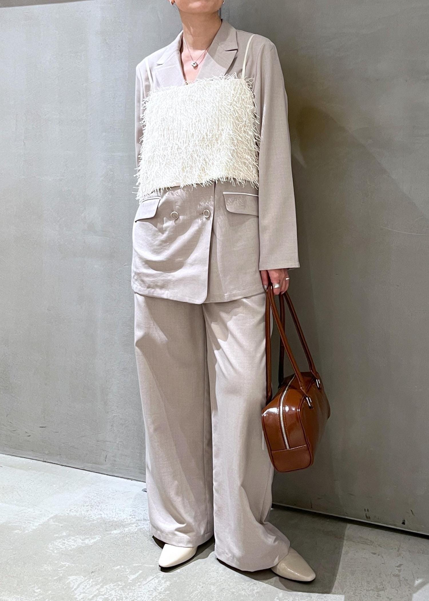 今回はセットアップの上にフリンジのキャミソールを重ねて、モードっぽい着こなしを意識しました。