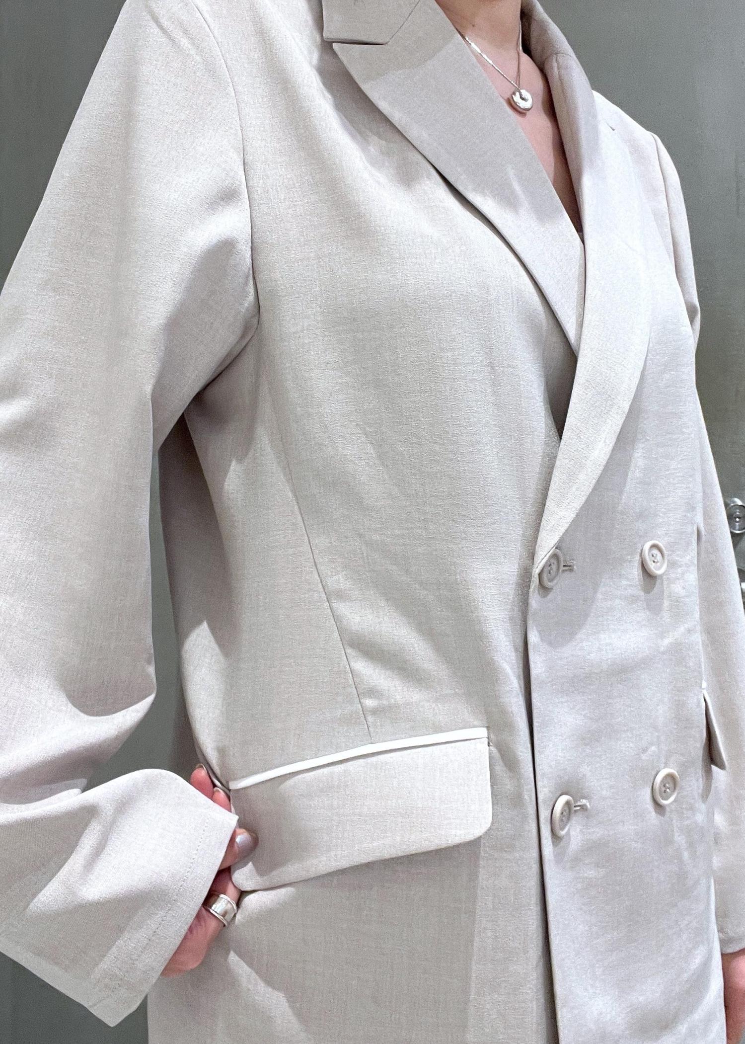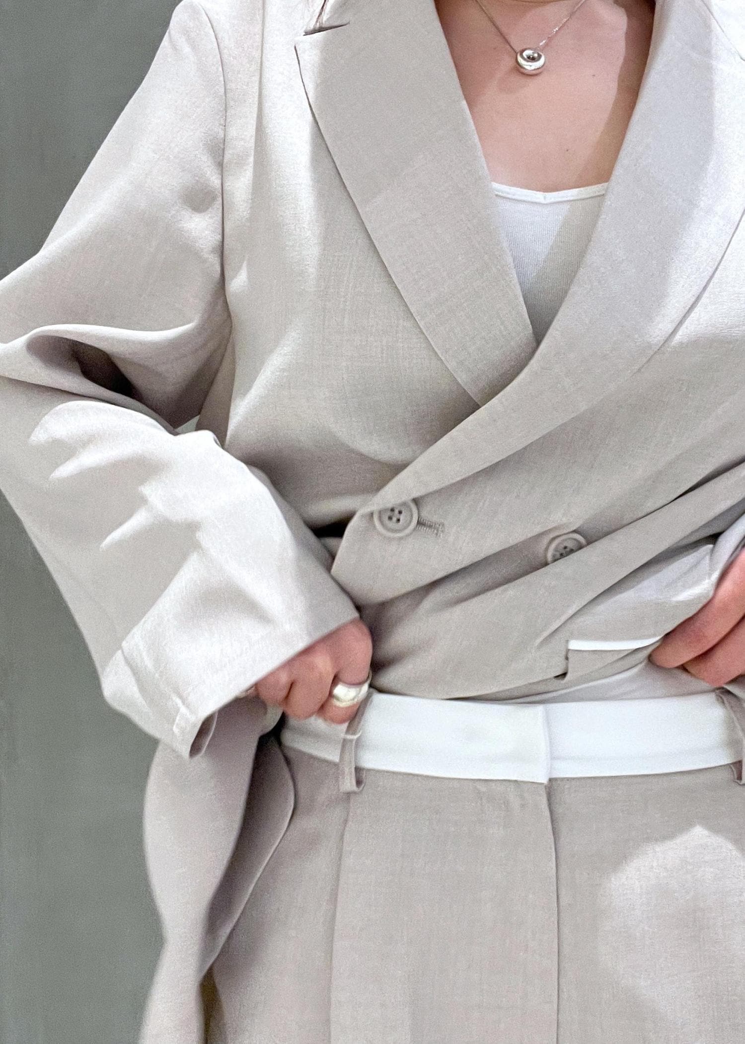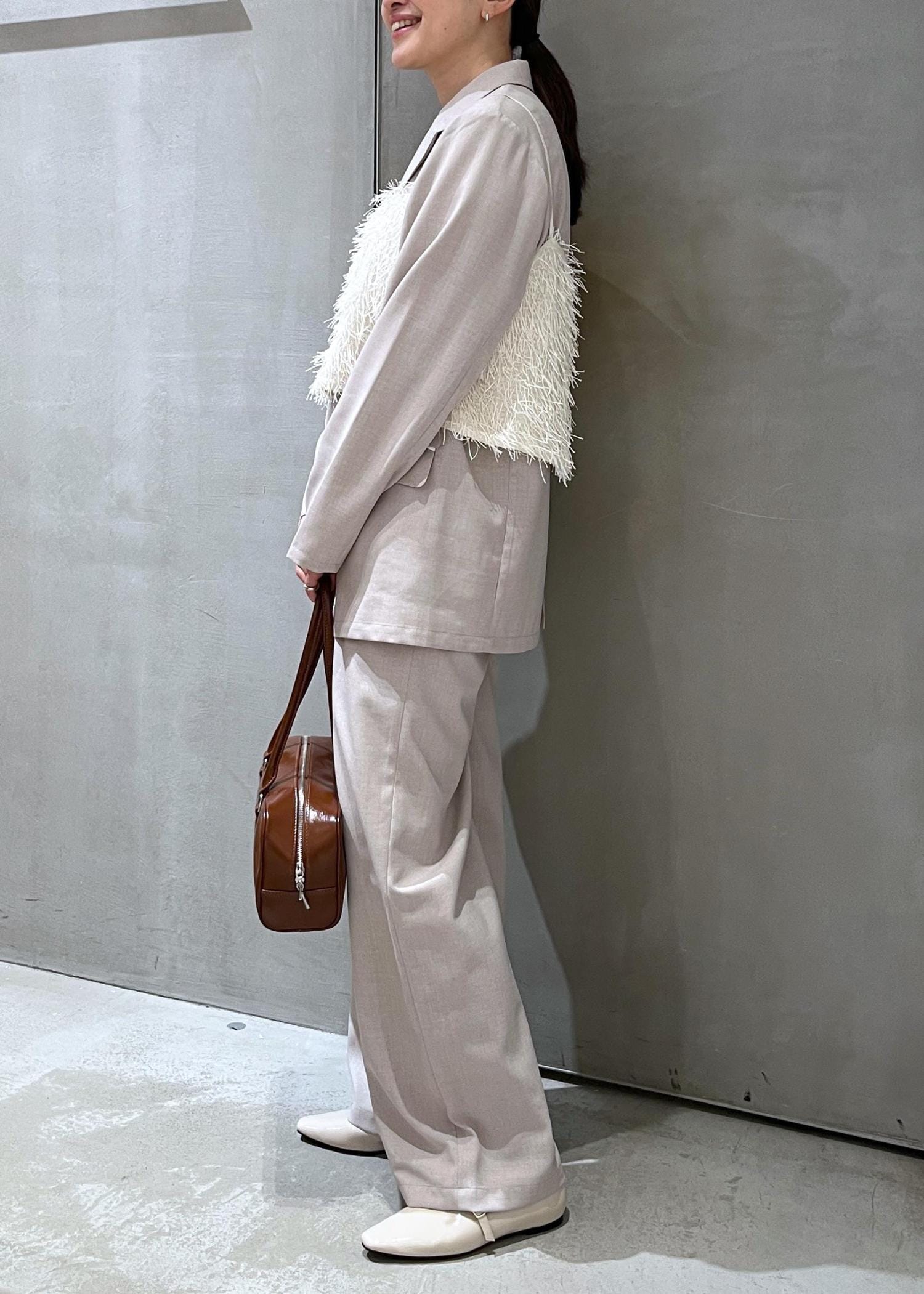 ダブルボタンのジャケットとワイドパンツのセットアップは、一見ボーイッシュに見えますが、素材特有の柔らかさやナチュラルな雰囲気でとても女性らしく仕上がります。