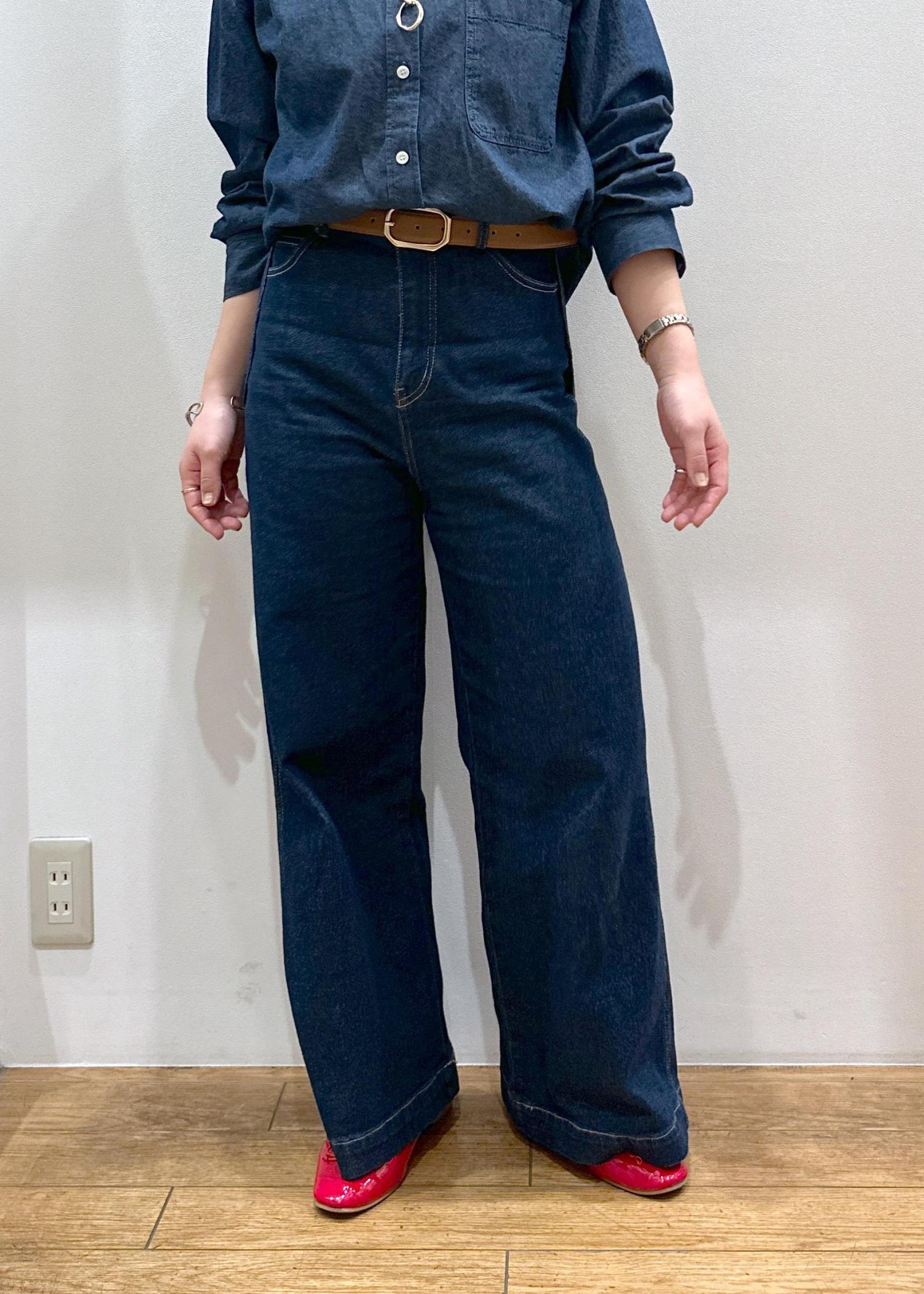 ワイドパンツで下に重みがくる様な時はウエストでしっかりとベルトをする事によってスタイルアップできます♪