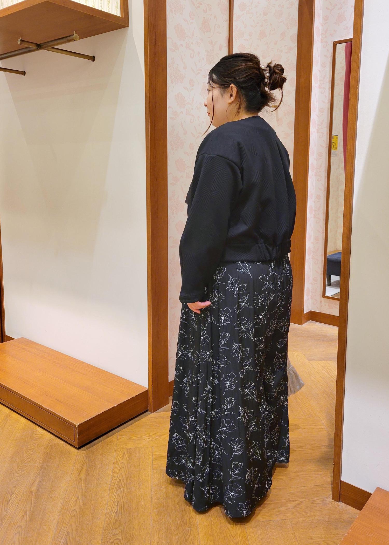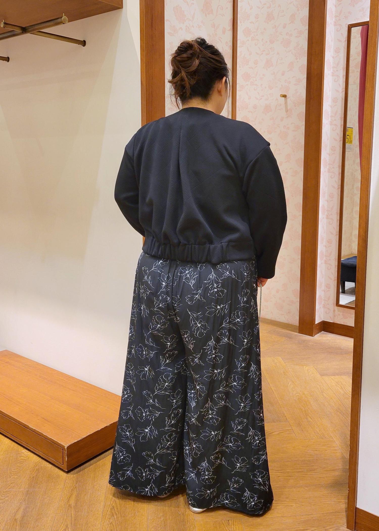 ウエストが全ゴム仕様になってるのでラクちんで履きやすいです。着丈は足首ぐらいなので低身長の方でも着丈を気にせず履けますよ。