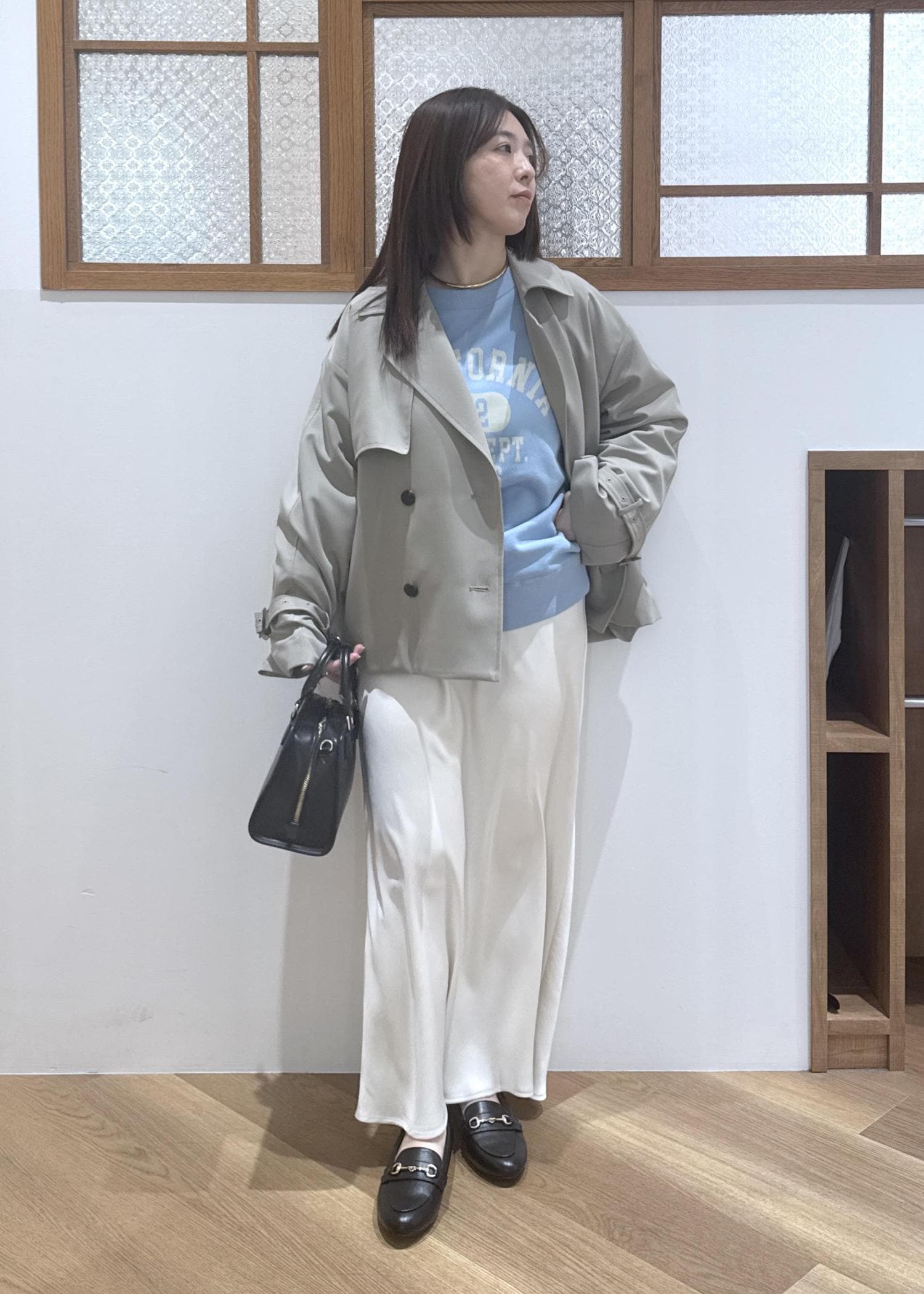 黒を使わずに、春らしいコーディネートを組みました。