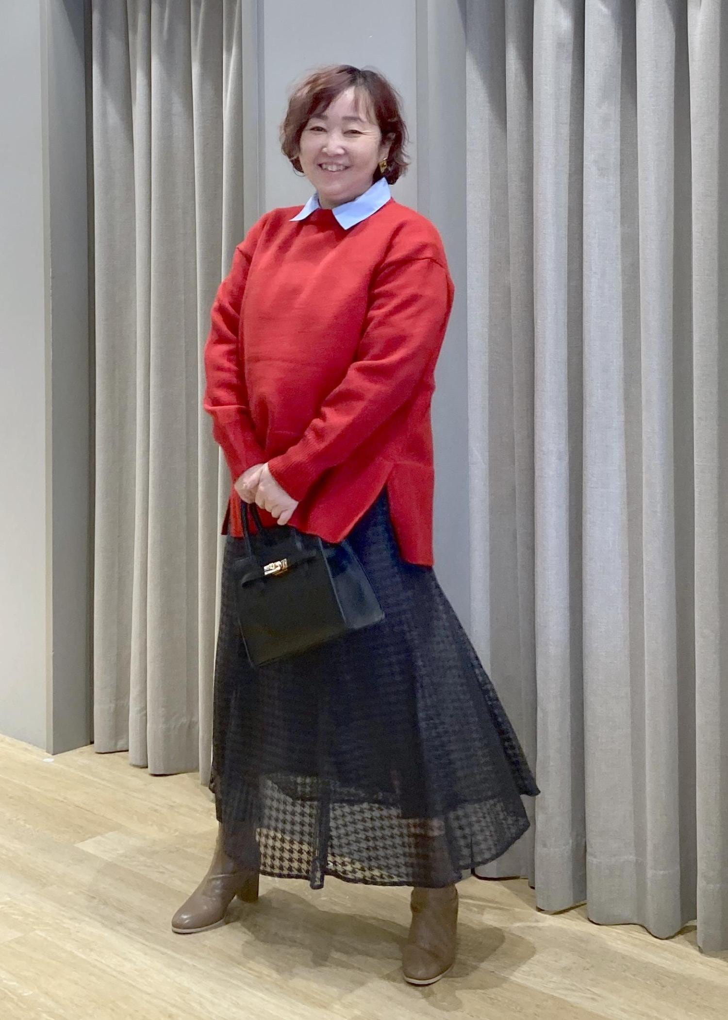 今回は、ナチュラルなカラーに合わせて、インナーも柔らかなカラーでコーディネートしてみました。カジュアルなパンツスタイルだけでなくキレイ目スカートで体型カバースタイリングです。